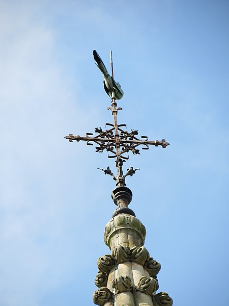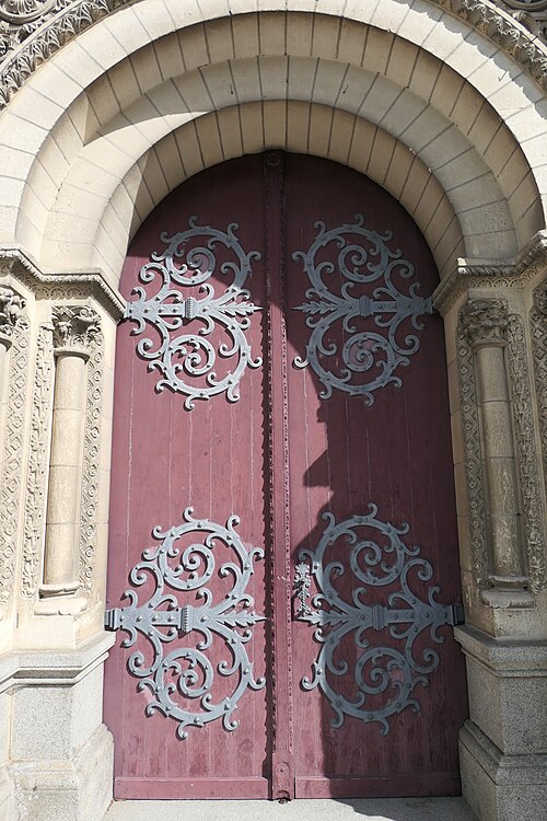 La nef, large et bordée de bas‑côtés, est voûtée d'ogives sur une hauteur intérieure de 17,5 mètres ; les voûtes des bas‑côtés sont en arêtes et l'éclairage provient de fenêtres en plein‑cintre. Le portail néoroman, réalisé dans les années 1880, est orné de trois bas‑reliefs illustrant des épisodes liés à l'histoire et à la dévotion de l'édifice. Le clocher, reconstruit au XIXe siècle sur le modèle antérieur, s'élève à 57 mètres et associe un soubassement de facture renaissante à un sommet gothique en flèche.