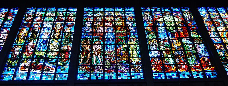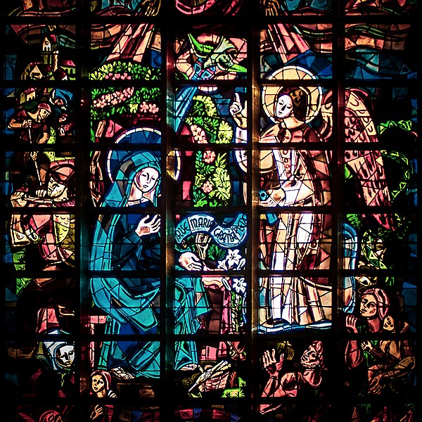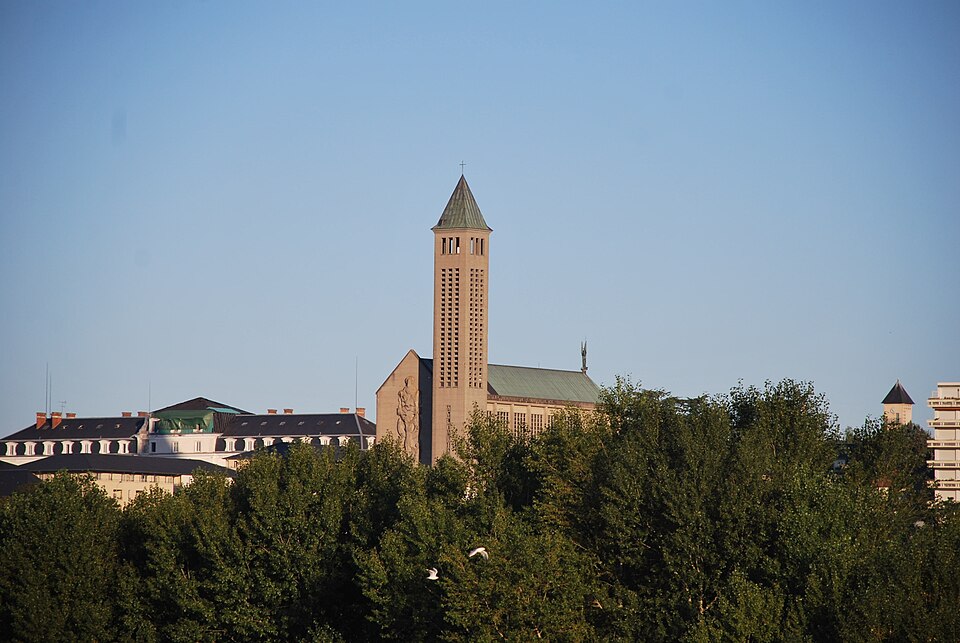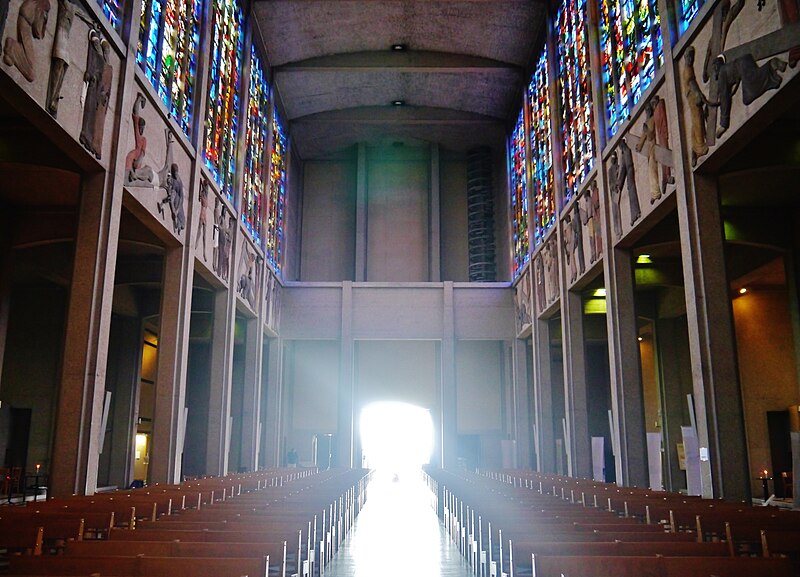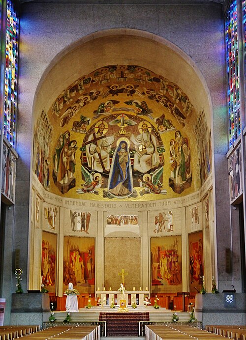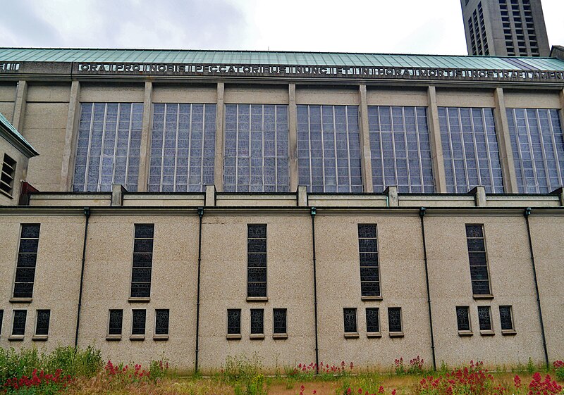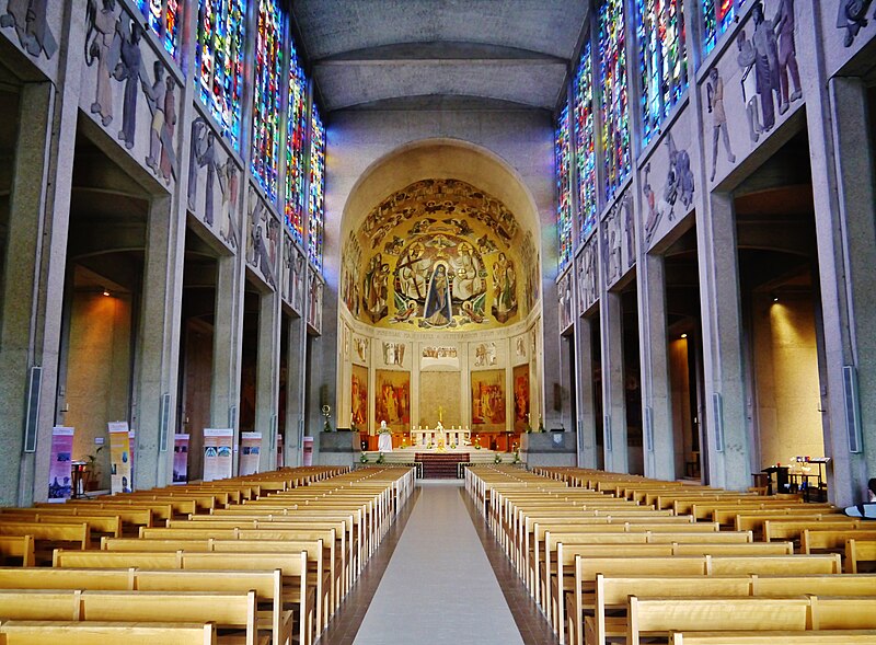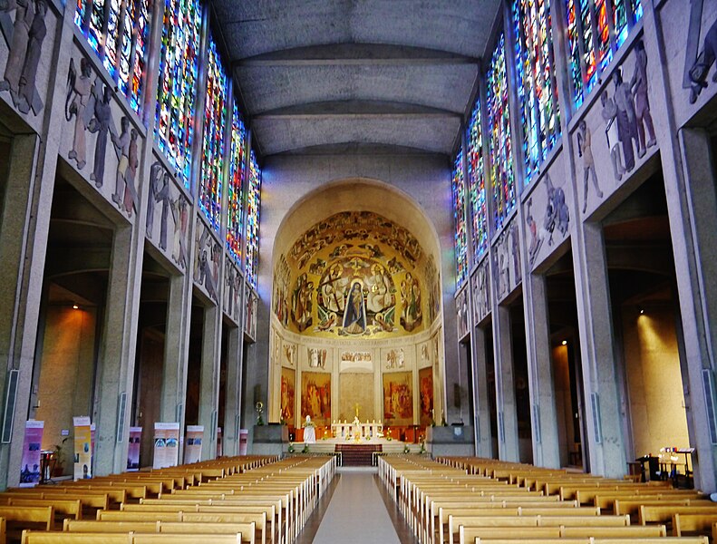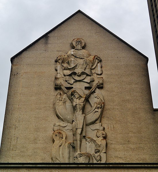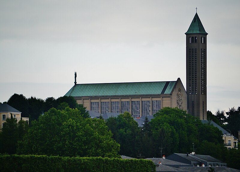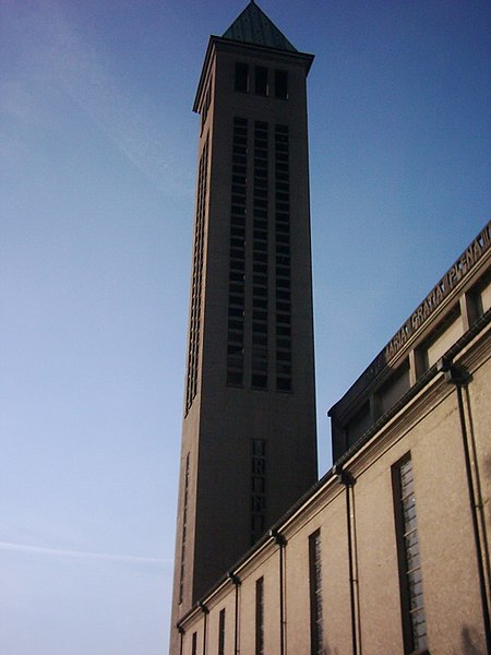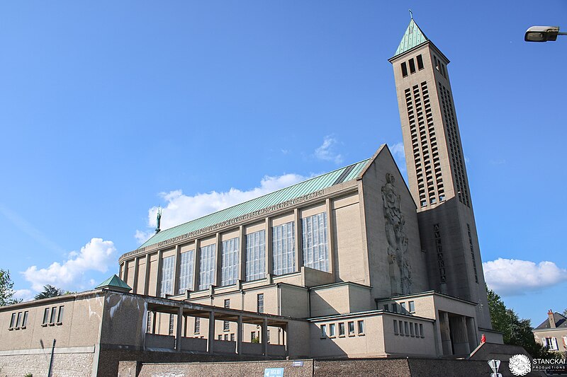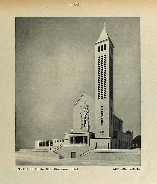 La basilique Notre‑Dame‑de‑la‑Trinité est un sanctuaire catholique situé à Blois, dans le Loir‑et‑Cher. Le projet naît de l’essor de la dévotion aux « trois Ave Maria » porté au début du XXe siècle par le père Jean‑Baptiste, puis par le père Clovis, qui contribua à son approfondissement doctrinal ; l’Archiconfrérie des Trois Ave Maria fut approuvée par le pape en 1921 et lança la souscription pour un centre de dévotion international. Commandée en 1931 par l’archiconfrérie en lien avec la communauté des pères capucins, l’église est d’abord confiée à l’architecte Charles‑Henri Besnard. Les travaux démarrent dans les années 1930 mais sont interrompus; en 1936 Paul Rouvière reprend le chantier, réutilisant la structure et le plan initiaux tout en modifiant le parement extérieur pour un revêtement en gravier de Loire posé sur béton. Après la mort de Rouvière et une nouvelle interruption liée à la guerre, les travaux sont repris en mars 1946 par Yves‑Marie Froidevaux, architecte en chef des Monuments historiques, qui allège le décor de la tour, crée une crypte et réalise les bâtiments annexes ainsi que l’aménagement des abords. L’édifice est consacré le 16 juillet 1949 et, devenu centre important de pèlerinage marial et franciscain, il reçoit le titre de basilique mineure en 1956. Représentatif de l’architecture religieuse de l’entre‑deux‑guerres, il présente une grande homogénéité architecturale et décorative ; Paul Rouvière a employé le système Hennebique pour le gros œuvre et le clocher culmine à 60 mètres. La décoration intérieure réunit de nombreux artistes : les sculpteurs Joël et Jean Martel, Jean Lambert‑Rucki et André Bizette‑Lindet, les tapissiers Jean et Karine Barillet, l’orfèvre Jean Puiforcat, ainsi que les maîtres verriers Louis Barillet, Jacques Le Chevallier et Théodore Hanssen ; Marthe Flandrin a réalisé les mosaïques du plafond. Les quatorze grandes verrières illustrent les mystères marials et la mosaïque de la voûte au‑dessus du maître‑autel complète la catéchèse développée dans les vitraux ; une frise sculptée monumentale de Jean Lambert‑Rucki longe la nef et sert de chemin de croix. L’ensemble basilical, incluant vitraux, cloître, galeries, préau et bâtiments conventuels, est classé au titre des monuments historiques par arrêté du 28 novembre 1996 et bénéficie du label « Patrimoine du XXe siècle ». Le domaine, qui comprend la basilique, le couvent, un foyer et un parc, demeure un pôle majeur de pèlerinage à Blois.