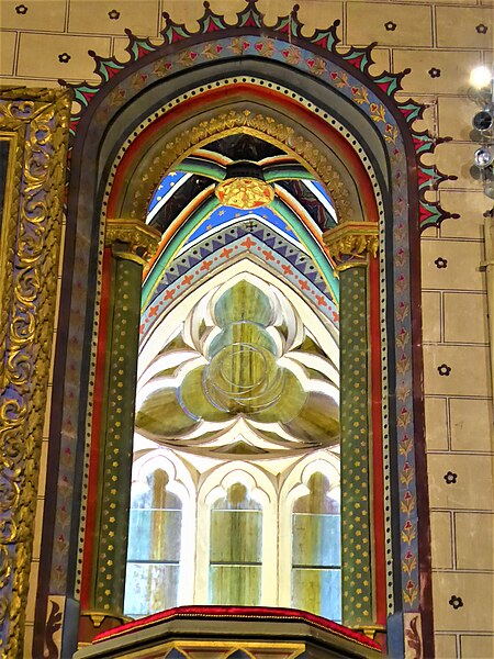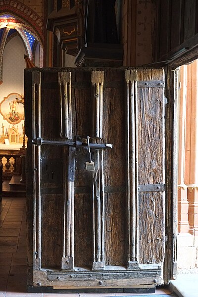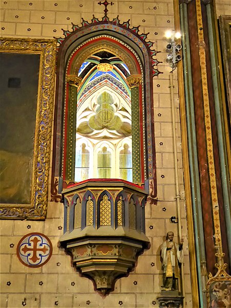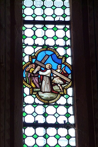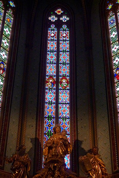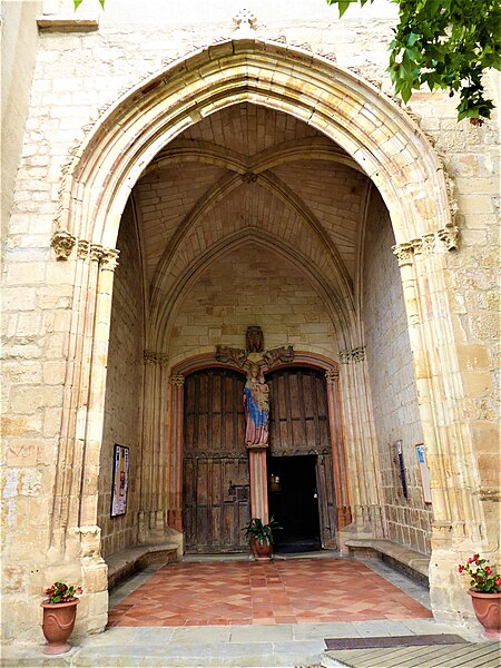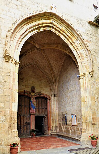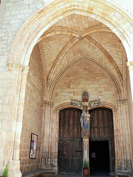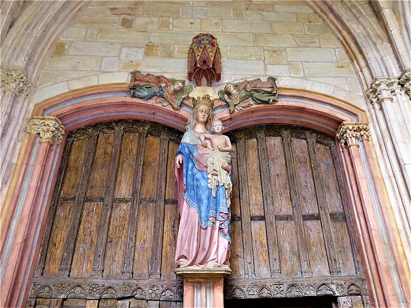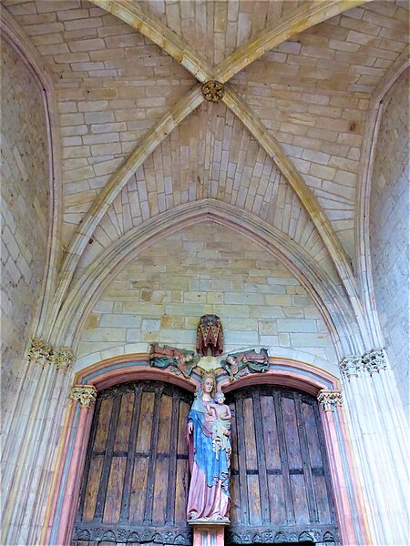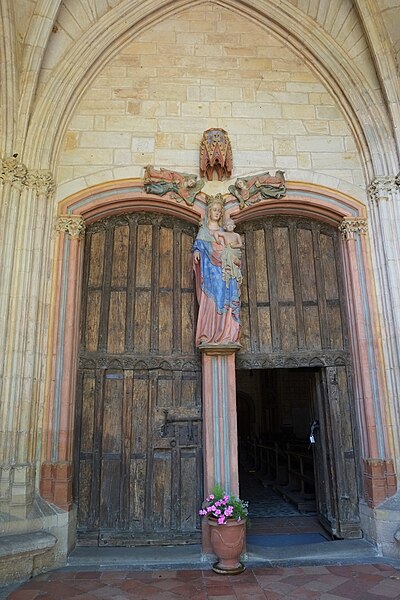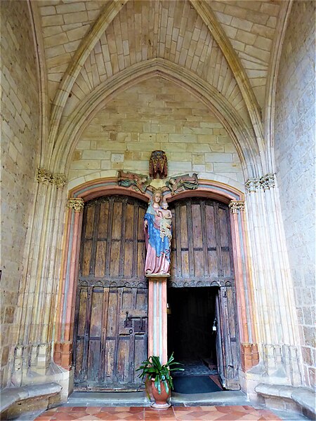 Le porche montre un caractère monumental : les piédroits extérieurs sont composés de boudins de diamètres inégaux, profilés en amande avec avant‑bec méplat et disposés en double ébrasement. Les colonnettes portent des chapiteaux sculptés en bouquets de feuillage sur deux rangs, et la porte qui ouvre sur la nef est scindée par un trumeau orné d’une Vierge dont le revers porte le cartouche « Mater et Virgo ». Les longs jours du sanctuaire sont des baies à deux formes séparées par un meneau très délié, chaque forme tréflée étant surmontée d’un trilobe et d’un quatre‑feuilles ; la rosace sud se compose de six quatre‑feuilles entourant un quatrième central, les écoinçons étant garnis de vitraux.
