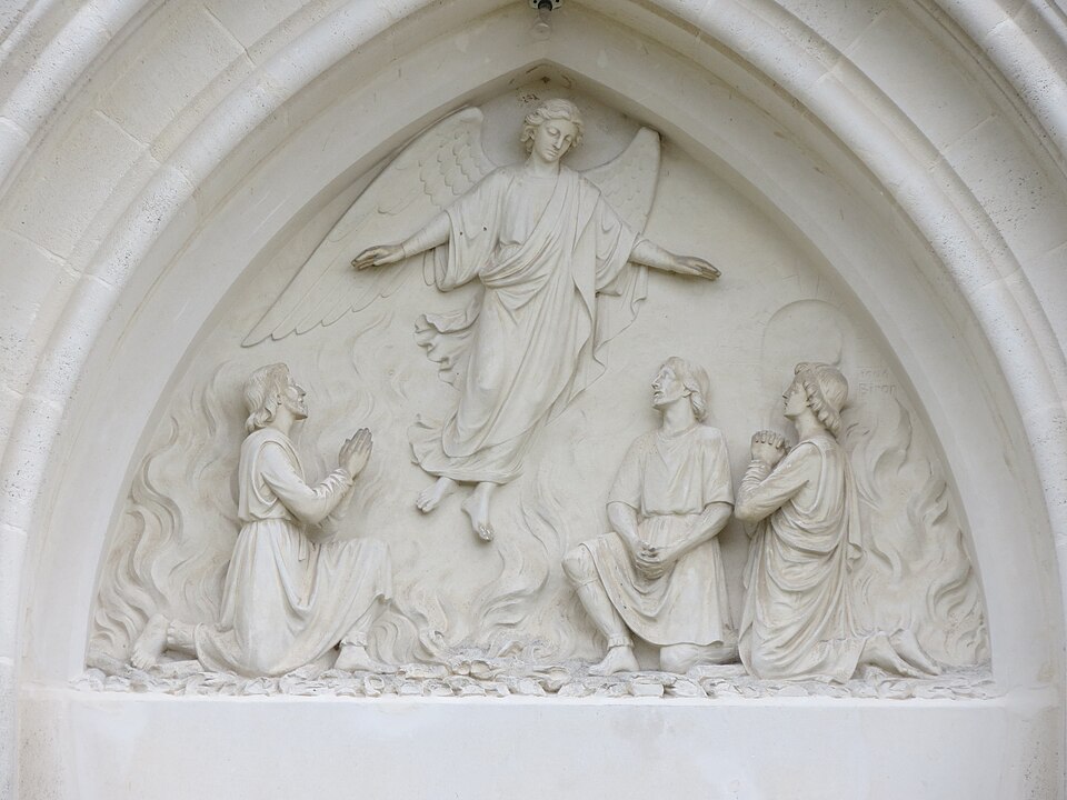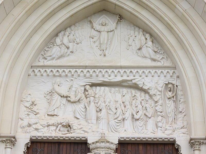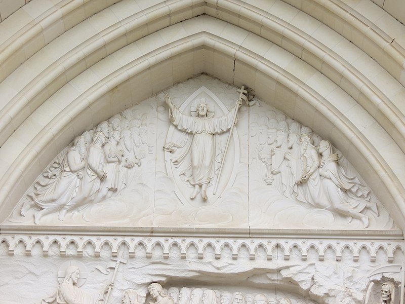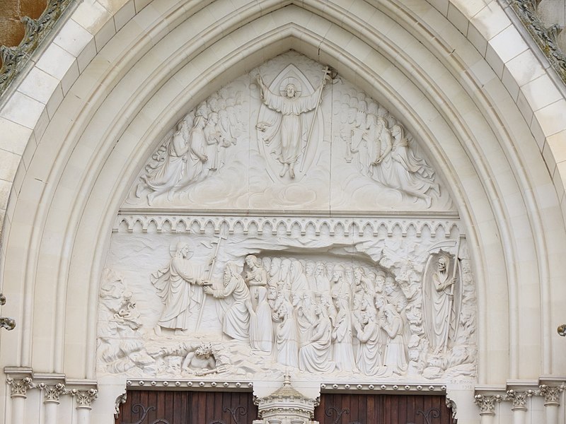 Le tympan de la façade est orné d’un double bas‑relief : dans la partie inférieure, la descente aux enfers avec l’accueil des saints de l’Ancien Testament, au‑dessus l’Ascension et, au sommet, la Vierge couronnée par Dieu et le Christ. L’intérieur réunit de nombreuses œuvres d’art : les vastes ensembles de vitraux, mosaïques, statues et boiseries contribuent à la vocation pédagogique et liturgique du lieu. Les premiers vitraux, posés selon la technique de la grisaille par les ateliers Champigneulle et Muraire, illustrent la vie du Christ et de la Vierge ; dès l’après‑guerre, le maître‑verrier Louis Barillet, en collaboration avec Lechevallier et Hausen, a conçu de 1917 à 1947 une importante campagne de verrières dont le style évolue de l’Art déco vers des apports cubistes et fauves et qui n’aborde que le thème de l’eschatologie et de la communion des saints. Parmi les grandes verrières figurent une composition bleue de 1926 consacrée au mystère de la Rédemption (70 m²) évoquant le péché originel et la messe, une verrière rouge de 1927 représentant le Jugement dernier, et une grande rosace posée en 1947 consacrée à l’Incarnation et à l’arbre de Jessé, entourée de figures bibliques, d’anges et de symboles mariaux.