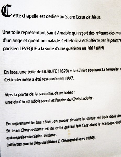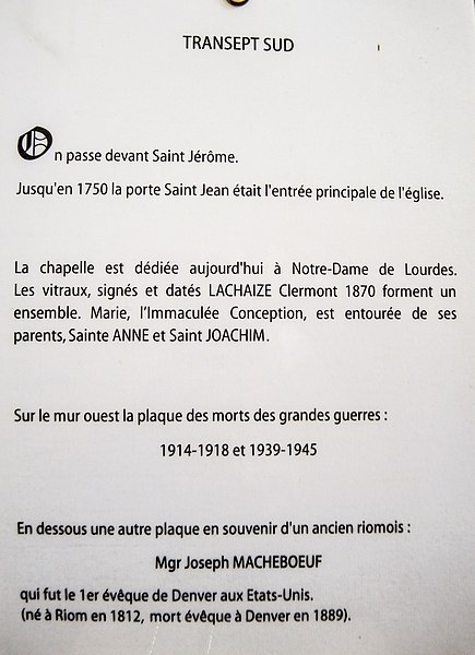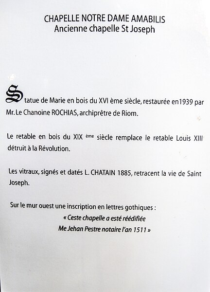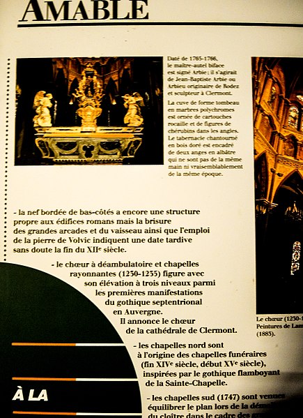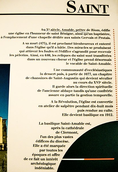 L'église Saint‑Amable de Riom conserve des fresques du XVe siècle représentant des scènes de l'enfance du Christ. Un édifice paroissial existait sur ce site au moins depuis le Ve siècle, alors dédié à saint Bénigne ; à partir de la fin du XIe siècle l'église est reconstruite et change de vocable. Le chœur, d'origine gothique, date du deuxième quart du XIIIe siècle mais a été largement remanié lors de la restauration dirigée par Aymon Mallay entre 1851 et 1865, opérations qui ont également concerné le transept et le clocher. Les chapelles latérales nord datent des XVe et XVIe siècles, celles du côté sud du XVIIIe siècle, comme l'indique une inscription de 1747, et la façade conçue par l'ingénieur François‑Charles Dijon est datée de 1750, la réception des travaux remontant à 1764. La basilique Saint‑Amable, élevée au titre de basilique mineure en 1912, est l'un des plus vastes édifices cléricaux d'Auvergne après la cathédrale de Clermont‑Ferrand. Elle a été édifiée en grande partie aux XIIe et XIIIe siècles et a longtemps été un lieu de pèlerinage. Avant l'église actuelle, une chapelle dédiée à saint Gervais et saint Protais existait déjà au Ve siècle et aurait été transformée par saint Amable pour établir l'église Saint‑Bénigne sur le même emplacement. Selon la tradition, Amable de Riom fit construire l'église au Ve siècle ; après sa mort elle fut rebaptisée Saint‑Amable lors du transfert de ses reliques par l'évêque Gal II. En 1077 l'évêque Durand confia l'église à Pierre de Chavanon pour la réformer et l'élever en abbatiale. La construction de l'édifice actuel débute au troisième quart du XIIe siècle par la nef, poursuivie au début du XIIIe siècle avec le chœur. La longueur de l'église atteint 64,50 mètres pour une largeur de 27 mètres, ce qui la place immédiatement après la cathédrale de Clermont‑Ferrand en superficie. Elle a été gravement endommagée par les séismes de 1477 et 1490. La nef, la partie la plus ancienne, mêle un roman tardif et des éléments gothiques : elle compte sept travées légèrement asymétriques, avec une hauteur de voûte de 16,15 mètres et une largeur de 7,10 mètres. Les voûtes des bas‑côtés sont soutenues par des arcs doubleaux ; les chapiteaux des nefs latérales reproduisent la même forme et décoration que ceux de la grande nef. Un décapage des piliers en 1975 a mis au jour, sur une voûte du bas‑côté nord, des fresques sur fond rouge relatant la vie du Christ et datées du début du XVe siècle. Le transept, restauré au XIXe siècle, reçoit des décors polychromes et des mosaïques ; lors de la reconstruction de 1859 sous la direction d'Aymon Mallay, des chapelles furent aménagées dans les bras nord et sud. Dans le bras nord figurent notamment Le Christ apaisant la tempête de Claude‑Marie Dubufe, acheté par l'État puis restauré en 1996, et une toile de Jean‑Jacques Lévêque montrant saint Amable recevant un reliquaire et guérissant un malade sur un fond de ville en flammes, le serpent au premier plan rappelant l'un de ses dons. Le chœur, de style gothique classique et de plan polygonal, a été construit entre 1230 et 1235 ; il comprend un vaisseau central de 12,40 mètres, un déambulatoire et trois chapelles rayonnantes, la clé de voûte représentant un Christ bénissant. Le déambulatoire est voûté par des croisées d'ogives et des doubleaux reposant sur des colonnes aux chapiteaux ornés de têtes et de feuillage de style XIIe‑XIIIe siècle ; les chapelles à cinq pans sont voûtées par six branches d'ogives à clé feuillagée et séparées par de faibles arcades en plein cintre. Les stalles et boiseries, réalisées en 1687 par André Boysen et Noël Mercier et formant initialement une barrière continue, furent partiellement critiquées par l'architecte Mallay lors de la restauration du XIXe siècle ; côté sud se voit un relief de saint Amable portant son reliquaire et une crosse abbatiale. Les chapelles latérales nord, élevées au XVe siècle et surélevées de deux marches, conservent la plupart de leurs meneaux d'origine malgré la destruction des vitraux à la Révolution ; leurs voûtes reposent sur des nervures piriformes convergeant vers des clés à écussons et retombant sur des culs‑de‑lampe ornés de petits personnages. Les chapelles sud, construites entre 1747 et 1750 lors de la destruction du cloître de l'ancienne abbaye augustinienne, sont comparables en dimensions mais présentent des fenêtres cintrées et des voûtes conformes au goût du XVIIIe siècle. La façade occidentale, de style Louis‑XV, présente une grande porte centrale encadrée de deux portes latérales et un oculus décoré de guirlandes ; l'étage supérieur, soutenu par des consoles renversées, s'ouvre sur une vaste baie flanquée de pilastres et surmontée d'un fronton triangulaire orné d'acrotères. La sacristie actuelle, créée en 1860 et adossée au bras nord du transept et au chœur, abrite les boiseries de 1687 qui proviennent des dorsaux des stalles. Le clocher, reconstruit au milieu du XIXe siècle par Aymon Mallay, est coiffé d'une flèche en bois recouverte d'ardoise ; il succède à un clocher en pierre de taille, plus élevé avant la Révolution. Les deux étages du clocher sont séparés par un bandeau mouluré ; le premier présente un vocabulaire roman, le second un vocabulaire gothique. Il abrite des cloches notables : Amable (4 080 kg, diamètre 1,84 m, refondue par Pierre Baudoin en 1865), Jacques (2 737 kg, diamètre 1,63 m, refondue par J. B. Decharme en 1816, la cloche précédente ayant été enterrée à la Révolution), Bénigne (2 056 kg, diamètre 1,51 m, fondue en 1783 par J. B. Barrard et dont les inscriptions furent limées à la Révolution) et Marie (500 kg, diamètre 1 m, fondue en 1882 par Vauthier). Le maître‑autel, réalisé en 1765–1766 par Jacques‑Baptiste Arbieu, r