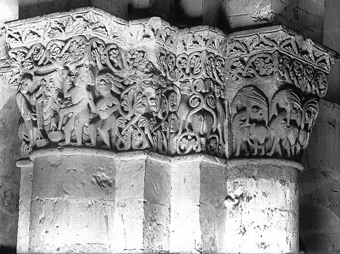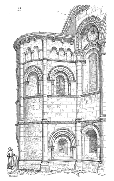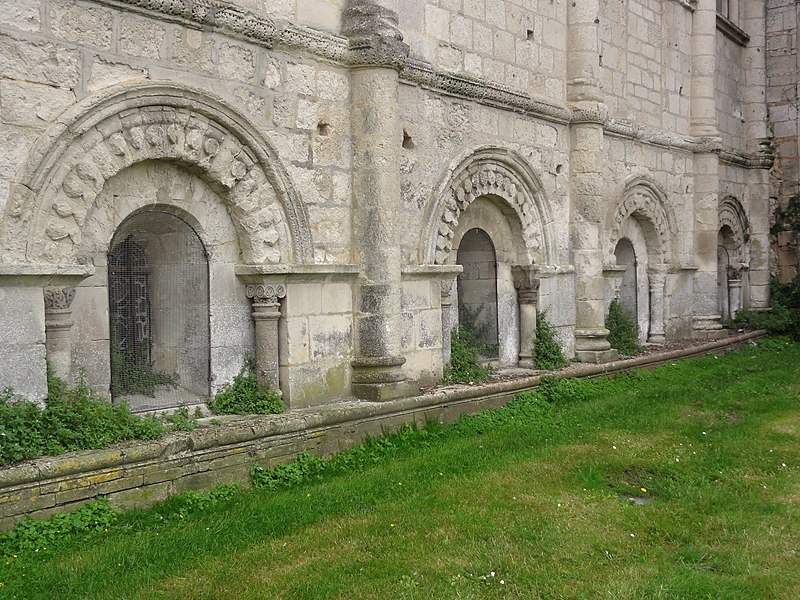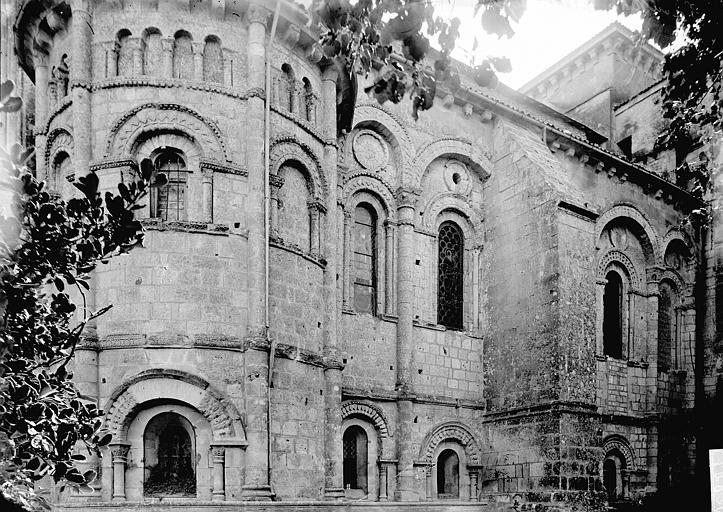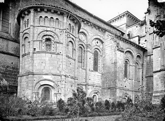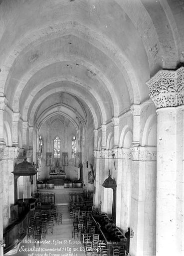 La crypte, ou église basse, est la partie la plus ancienne, réalisée dès 1081 ; elle comprend deux croisillons à absidioles orientées, un triple vaisseau de quatre travées voûtées d’arêtes surbaissées, un déambulatoire et trois chapelles rayonnantes en cul-de-four, éclairées par des baies en plein cintre. Quatre paires de piles massives séparent le vaisseau principal des bas-côtés ; les chapiteaux, ornés surtout de motifs végétaux et d’entrelacs d’inspiration antique, figurent parmi les ensembles remarquables, et un large bandeau floral d’allure mérovingienne à l’entrée est peut-être un réemploi de la basilique du VIe siècle. La crypte mesure 35 mètres de longueur pour une hauteur sous voûte de 5 mètres et abrite au centre le cénotaphe monolithe ; autrefois un escalier la reliait directement à l’église haute via la nef commune aujourd’hui détruite. L’église haute actuelle comprend les bras du transept et une profonde abside servant de nef, composée de quatre travées voûtées en berceau brisé, de bas-côtés en demi-berceau et d’une chapelle axiale voûtée d’ogives servant de chœur liturgique ; deux chapelles latérales romanes bordent la chapelle axiale et le vaisseau central est surhaussé par des colonnettes engagées. La longueur totale de la basilique est de 42 mètres pour une hauteur sous voûte de 10 mètres, portée à 14 mètres sous la coupole de la croisée. Un second atelier de sculpture a réalisé des chapiteaux historiés remarquables, dont la « pesée des âmes », un « Daniel dans la fosse aux lions » et de nombreux motifs animaliers, mythiques et végétaux illustrant un riche bestiaire et des allégories morales. Les murs extérieurs des collatéraux et des chapelles présentent un décor structuré en niveaux d’arcatures, baies romanes, oculi et contreforts-colonnes, tandis que les vitraux, majoritairement de la fin du XIXe et du début du XXe siècle, proviennent des ateliers Dagrant, Gesta et Léglise et représentent des saints locaux et des scènes du martyre de saint Eutrope. Avant sa destruction, l’ancienne nef mesurait 75 mètres de long pour 15,60 mètres de large et formait un triple vaisseau doté d’un dispositif d’escaliers et de paliers facilitant la circulation des pèlerins entre les niveaux ; cet espace a été comblé et transformé en place puis en parking, dont subsistent quelques vestiges muraux et une colonne engagée. Le clocher abrite quatre cloches : le bourdon Eutrope-Marguerite, fondu en 1886 par Georges Bollée et pesant 1 995 kg, est la cloche la plus lourde du département en raison de son tracé épais, les autres cloches datant de 1832, 1834 et 1863 provenant de fondeurs régionaux. À proximité, quelques vestiges du prieuré subsistent rue Saint-Eutrope ; les bâtiments actuels, héritiers d’un ensemble conventuel plus vaste, datent de la fin du XVIIIe siècle et comprennent une chapelle devenue salle de concert. Le mobilier classé comprend des peintures des XVIIe et XVIIIe siècles, des fonts baptismaux du XIe siècle, un bénitier du XVIIe siècle et un retable du XIXe siècle.