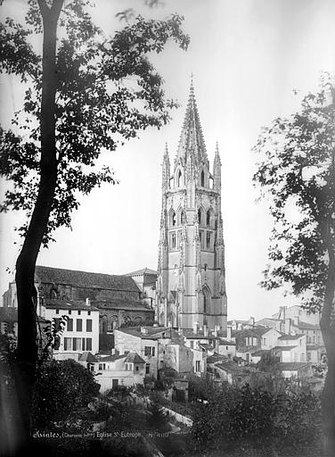 Les données sur saint Eutrope sont incertaines ; la tradition le présente comme évangélisateur et martyr, parfois situé au Ier siècle ou au IIIe siècle, mais il reste reconnu comme le premier évêque de Saintes. Les récits hagiographiques racontent qu’il fut martyrisé pour avoir converti Estelle, la fille du gouverneur, enterré près de l’amphithéâtre, et que ses reliques furent retrouvées par des moines, authentifiées par l’évêque Pallais et placées dans une basilique funéraire attestée au VIe siècle et endommagée par les Normands au IXe siècle. Au XIe siècle, Cluny lança la reconstruction d’une vaste église de pèlerinage à deux niveaux ; Benoît dirigea les travaux commencés en 1081 et la consécration des deux sanctuaires eut lieu en 1096, suivie de la translation des reliques. Au XIIe siècle l’église devint une halte importante sur la Via Turonensis et reçut pèlerins et donateurs, dont des membres de la noblesse et des souverains qui financèrent des travaux et des réparations. Pendant les guerres de religion, les reliques furent profanées et le corps du saint brûlé ; seul le chef fut préservé, envoyé à Bordeaux puis restitué à Saintes après démarches ecclésiastiques et cérémonies solennelles. À la Révolution, les archives du prieuré furent saisies et pour la plupart brûlées pendant la Terreur ; l’édifice montrait par ailleurs des fissures et un état de délabrement qui conduisirent à la démolition de la nef en 1803, les matériaux étant réutilisés, puis à l’édification d’une façade provisoire remplacée en 1831 par la façade néo-romane de l’architecte Prévôt. La découverte en 1843 d’un cénotaphe monolithe portant l’inscription EVTROPIVS fut mise en relation avec l’ancien tombeau, et des restaurations du clocher eurent lieu en 1844. Dans la nuit du 11 au 12 août 1983 un incendie criminel détruisit les stalles en acajou et endommagea l’église haute et le clocher ; d’importants travaux ont permis la reconstruction d’un arc-doubleau, la réhabilitation des voûtes, le décapage des murs, le remplacement du mobilier et la restauration de la tribune, le nouvel autel ayant été consacré le 24 mai 1986 et la relique du chef de saint Eutrope intégrée dans un reliquaire du maître-autel. Lors de la restauration de 2021–2022, des modillons de la façade nord trop abîmés furent remplacés par de nouvelles sculptures évoquant la pandémie de Covid-19 tout en respectant le langage de l’art roman.