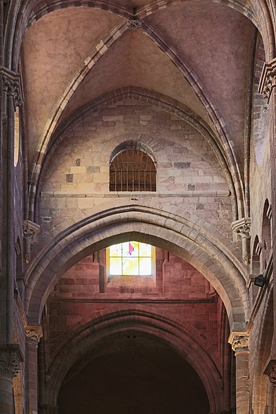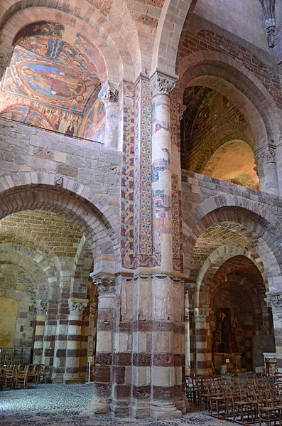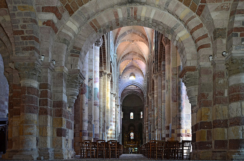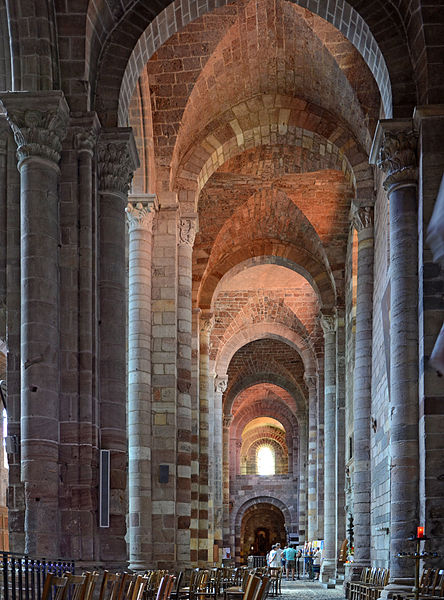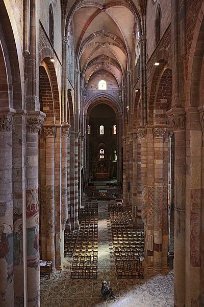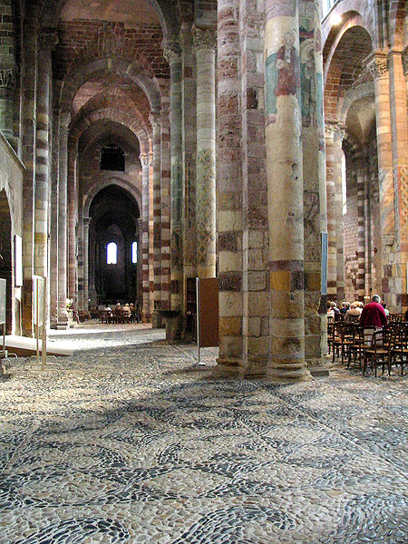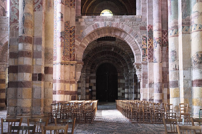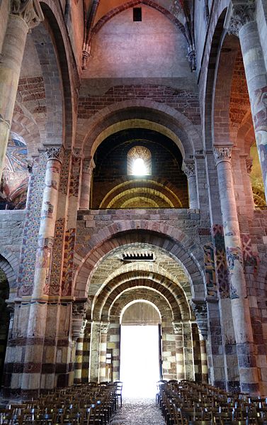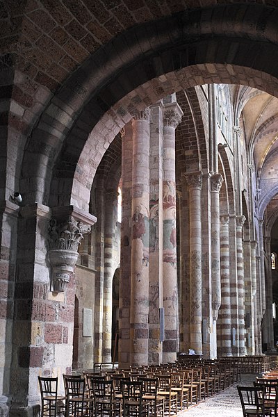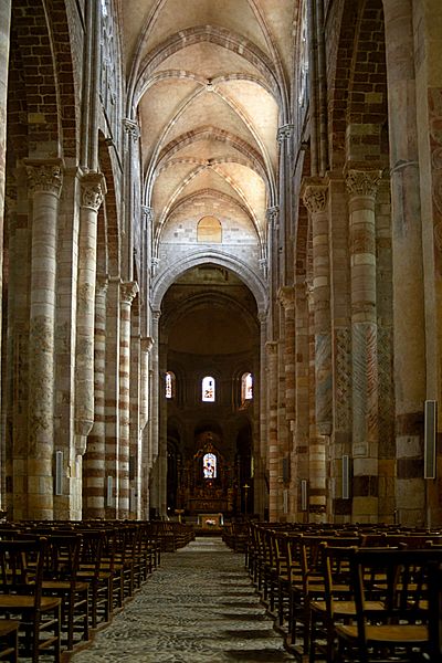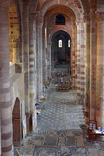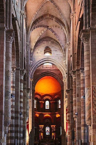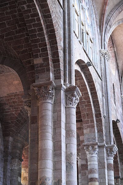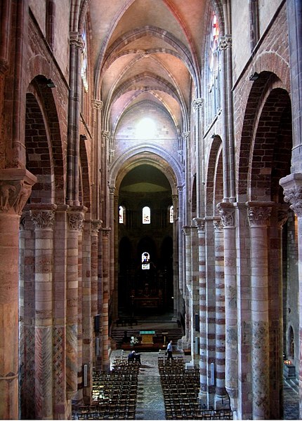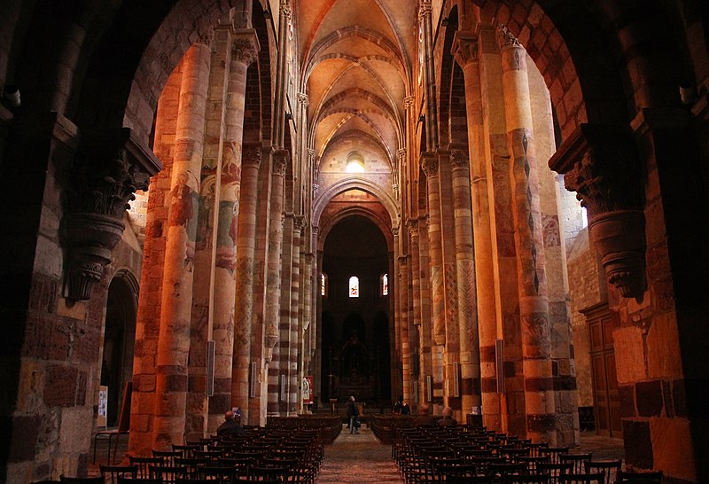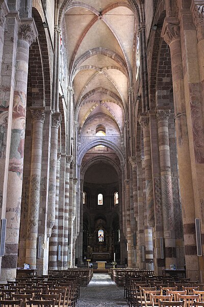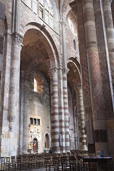 L'intérieur se distingue par une polychromie de pierres locales — grès rouge, grès calcaire, basalte et marbre — et par un pavement en galets polychromes aux motifs géométriques. La nef, longue de 74 mètres, est rythmée par des colonnes à base carrée et des chapiteaux finement sculptés, représentant des scènes bibliques et légendaires, des êtres fantastiques, des figures de la vie quotidienne et des sujets de la Résurrection. Une tribune à l'entrée de la nef abrite la chapelle Saint-Michel et supporte le clocher carré, tandis que la crypte sous la lanterne du chœur conserve les restes attribués à saint Julien. Les vaisseaux latéraux ouvrent sur un vaste déambulatoire flanqué de chapelles rayonnantes.