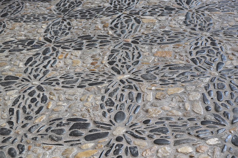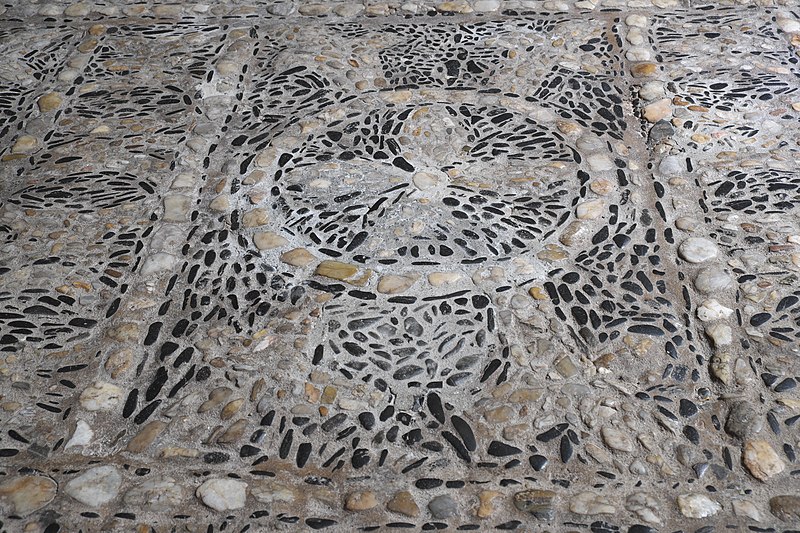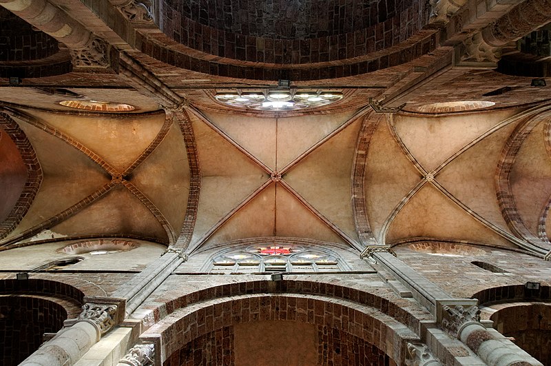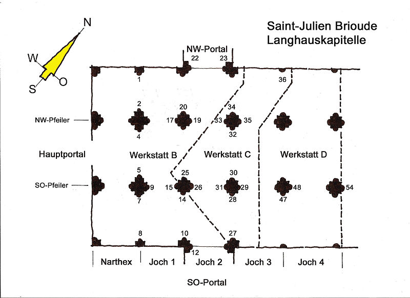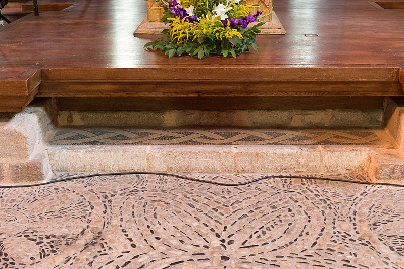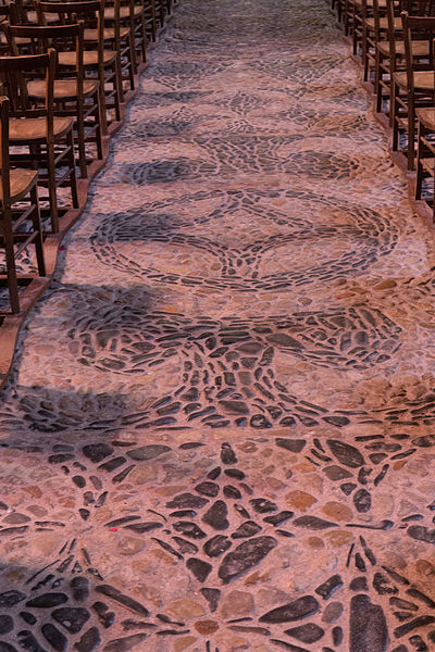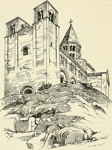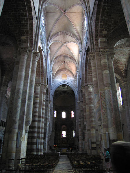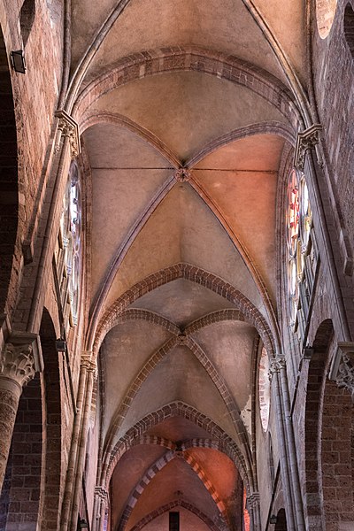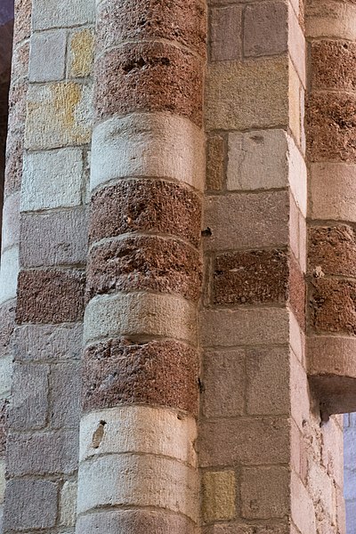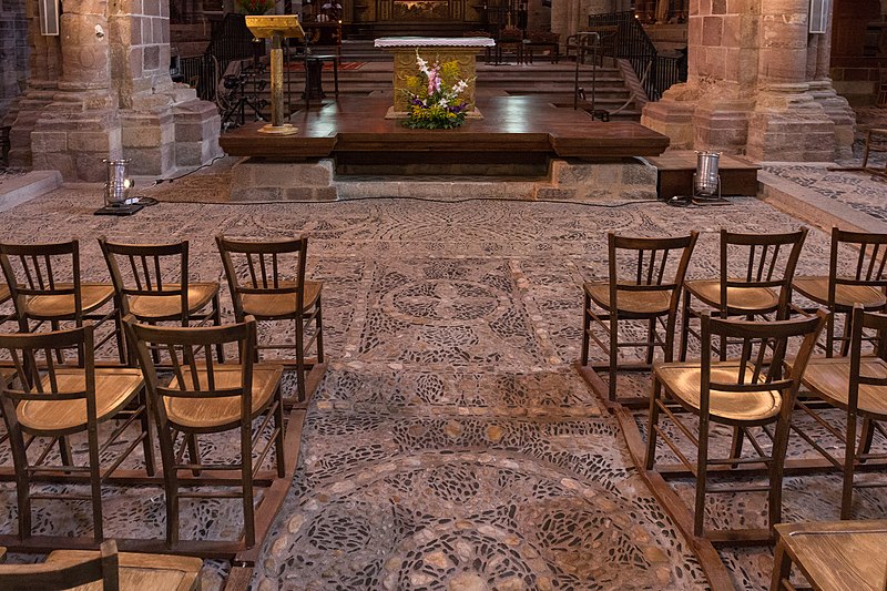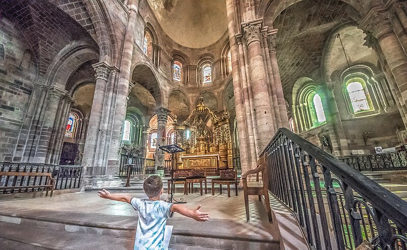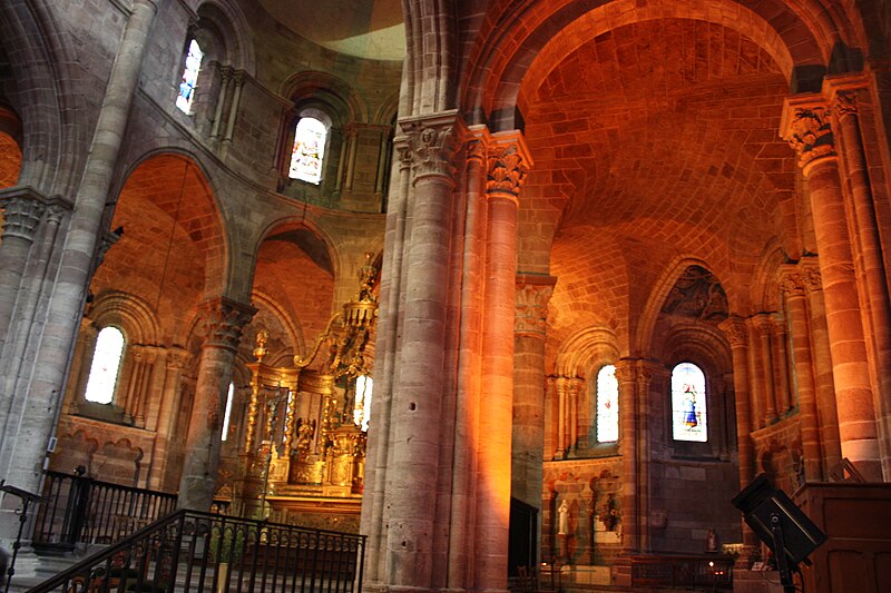 L'intérieur se distingue par une polychromie de pierres locales — grès rouge, grès calcaire, basalte et marbre — et par un pavement en galets polychromes aux motifs géométriques. La nef, longue de 74 mètres, est rythmée par des colonnes à base carrée et des chapiteaux finement sculptés, représentant des scènes bibliques et légendaires, des êtres fantastiques, des figures de la vie quotidienne et des sujets de la Résurrection. Une tribune à l'entrée de la nef abrite la chapelle Saint-Michel et supporte le clocher carré, tandis que la crypte sous la lanterne du chœur conserve les restes attribués à saint Julien. Les vaisseaux latéraux ouvrent sur un vaste déambulatoire flanqué de chapelles rayonnantes.