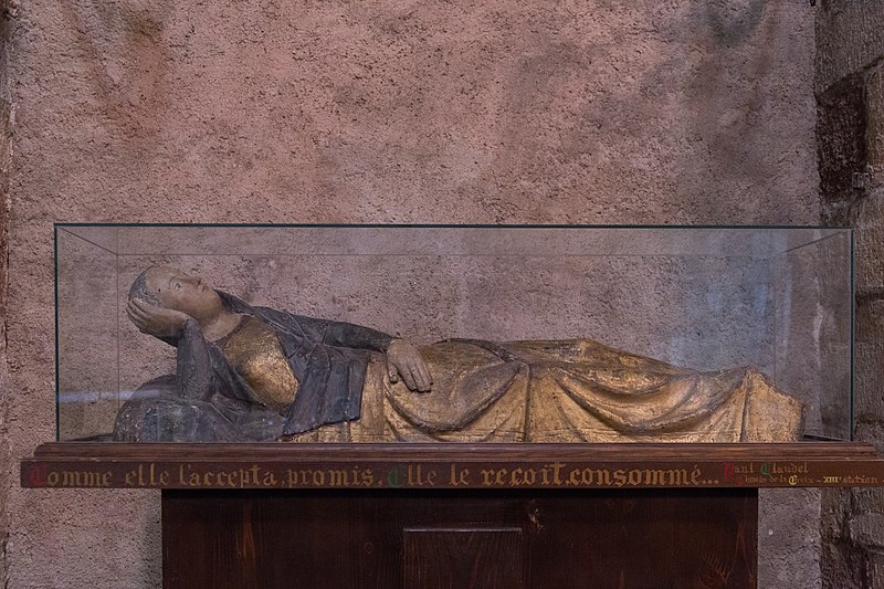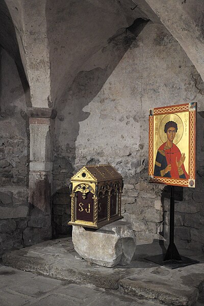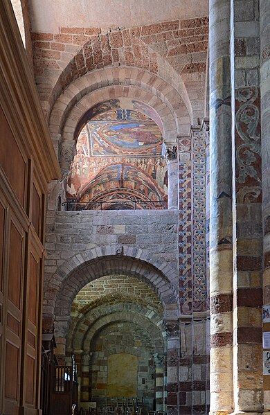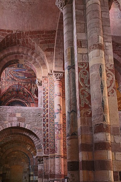 Les peintures murales, mises au jour au XXe siècle, couvrent près de 140 m² et figurent des cycles narratifs importants : la chapelle Saint-Jean-Baptiste montre les quatre cavaliers de l'Apocalypse sous un Christ glorieux, tandis que la chapelle Saint-Michel présente sur sa voûte le Christ en gloire entouré des évangélistes, des anges et des archanges triomphant de Satan, des thèmes reliés aux pèlerinages et aux enjeux spirituels de l'époque. Les chapiteaux sculptés se répartissent en deux grandes phases romane et gothique et forment des cycles iconographiques centrés sur la Résurrection, le monde antique et des légendes bibliques et profanes, avec des motifs tels que le minotaure, Samson et le lion, des chevaliers et des symboles de la Résurrection qui orientent le regard vers le tombeau du saint.