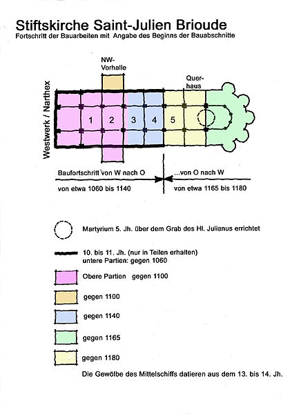 Sur le plan architectural, Saint-Julien résulte d'un mélange d'influences aquitaines, auvergnates et vellaves ; le chantier a mobilisé des matériaux variés et des solutions empruntées à des traditions régionales. Le chevet présente une mosaïque de rosaces en pierres polychromes, un déambulatoire et des chapelles rayonnantes ; les baies du déambulatoire sont encadrées de colonnettes à chapiteaux tandis que celles du chœur forment des triplets par des baies aveugles. À l'ouest, un massif occidental à chapelles hautes précède une nef longue de cinq travées, dont l'organisation et certains aménagements ont été remaniés au XIXe siècle. Les deux clochers actuels, reconstruits au XIXe siècle, reprennent des dispositions anciennes.