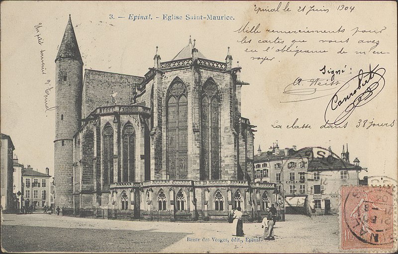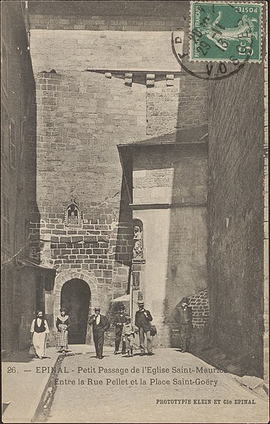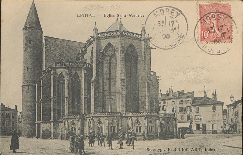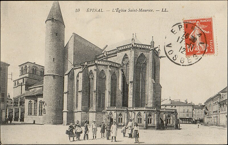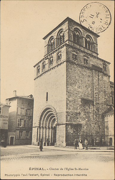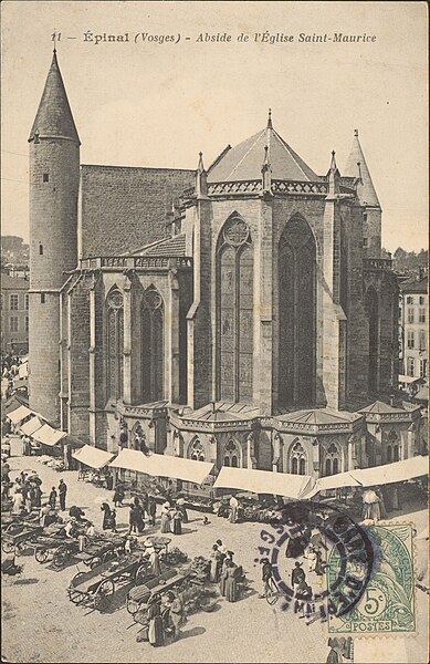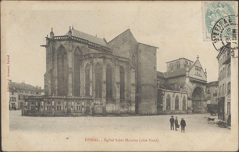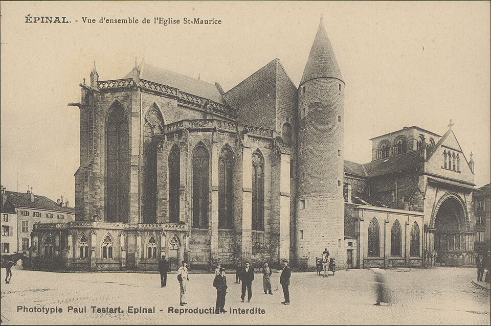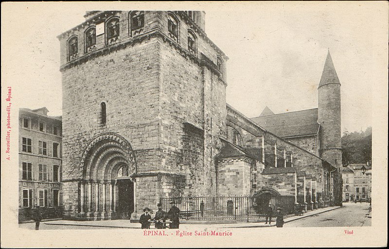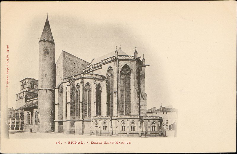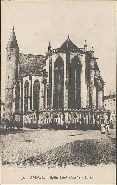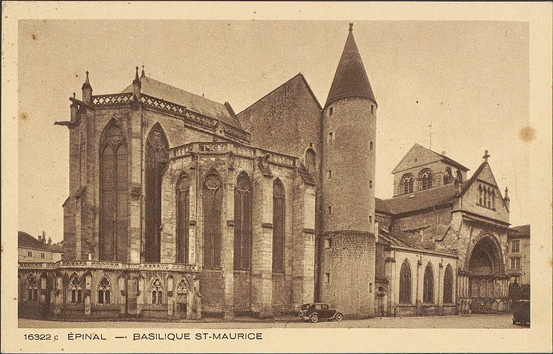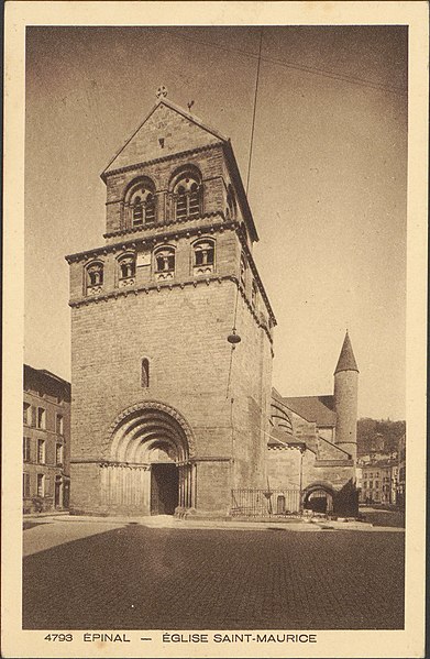 La basilique Saint-Maurice d'Épinal est une basilique mineure catholique située à Épinal, dans les Vosges ; l'édifice, dans son état actuel, a été bâti entre les XIe et XIIIe siècles et dépend du diocèse de Saint-Dié. Le site occuperait l'emplacement de la première église de la ville, fondée au Xe siècle par l'évêque Gérard de Toul à la demande de Thierry Ier de Metz ; la paroisse initiale fut formée de cinq manses prélevées sur la paroisse de Dogneville : Spinal, Grennevo, Avrinsart, Villers et Rualménil. Thierry Ier, à l'origine de la fondation monastique, apporta des reliques de saint Goëry, événement entouré d'un miracle rapporté par Widric ; l'église accueillait alors à la fois la population et des moines bénédictins. Le cloître se trouvait au sud de la nef et le premier cimetière spinalien était situé au sud du chœur, sur l'actuelle place de l'Âtre, comme le rappelle un crucifix apposé sur le mur du bras sud du transept. Trouvant le monastère déserté, l'évêque Adalbéron II y installa ensuite des moniales bénédictines placées sous le patronage de saint Goëry. Une nouvelle église romane fut reconstruite au milieu du XIe siècle et consacrée par le pape Léon IX ; les murs de la nef datent de cette époque, tandis que des bas-côtés ont été ajoutés au XIIIe siècle et que les ouvertures originelles subsistent sur le mur sud. Au XIIIe siècle, les moniales furent remplacées par un chapitre de chanoinesses qui perdura jusqu'à la fin du XVIIIe siècle ; la collégiale, de nouveau consacrée à saint Maurice, servit aussi d'église paroissiale, un autel ayant été installé à l'extrémité est de la nef. Des travaux s'échelonnèrent du XIIIe au XIVe siècle : le chœur fut reconstruit dès le XIIIe siècle, un nouveau portail donnant sur la ville fut percé dans le mur nord de la nef et celle-ci fut couverte de voûtes. Au XIXe siècle, l'abbé Boullangier, nommé curé en 1843, entreprit la restauration de la basilique avec l'architecte départemental Léon Charles Grillot ; l'église fut classée monument historique en 1846 et la tour-beffroi reçut alors un portail néo-roman. La paroisse reçut le titre de basilique mineure le 20 février 1933 sous le pontificat de Pie XI ; d'importantes restaurations ont été menées au XXe siècle et, dans le chœur, un parasol à bandes rouge et or, un écusson et une clochette rappellent ce titre.