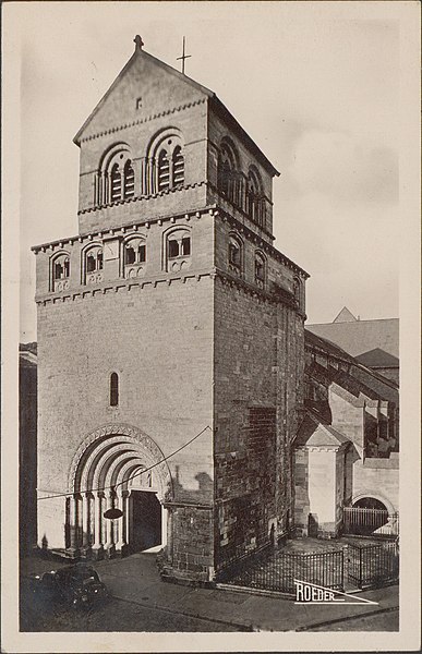 La tour, très massive et haute d'une trentaine de mètres, se compose de deux parties : la base, depuis le sol, mesure dix-sept mètres de hauteur et abrite deux salles carrées couvertes par un chemin de ronde ouvert par des baies et des meurtrières, et, au-dessus, un beffroi en retrait d'1,50 m contenant les cloches. Dans l'épaisseur du mur sud, à droite en entrant, un escalier en spirale dont les marches sont adossées au moyeu mène au chemin de ronde et se termine par un chapiteau à crochets ; un second escalier, prenant naissance dans la nef à gauche de la porte de la tour, fut redécouvert en 1984. Le toit en bâtière de grès posé en 1933 porte deux croix, l'une en pierre nimbée et l'autre en fer forgé surmontée d'un coq.