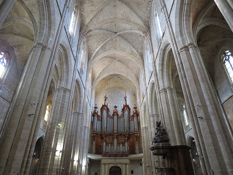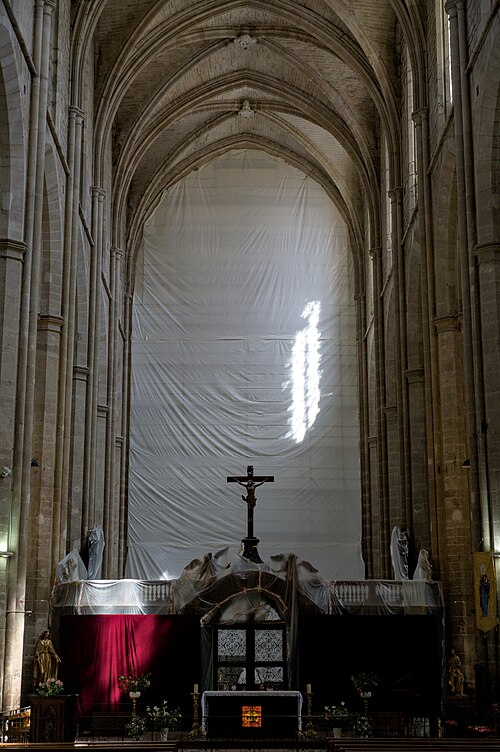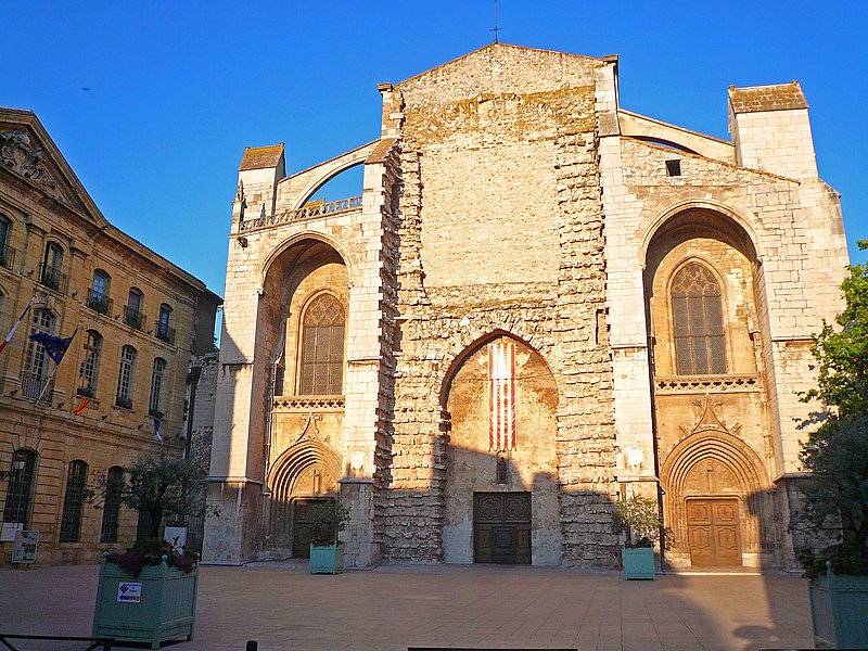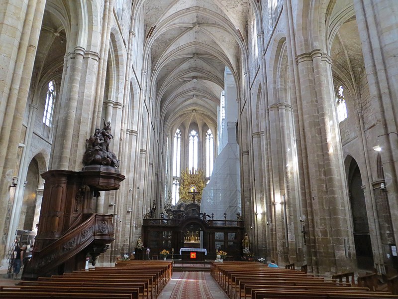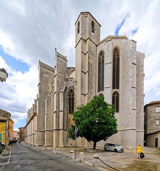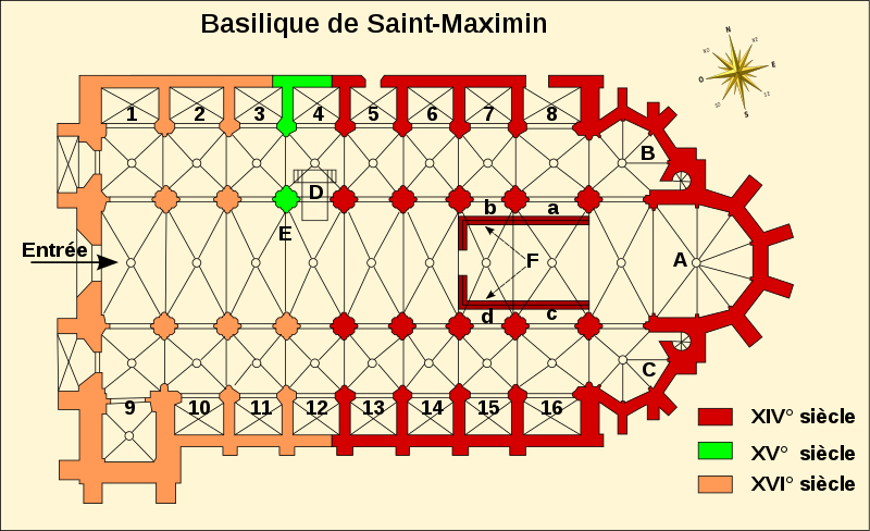 La construction de la basilique fut conduite par plusieurs maîtres d'œuvre et architectes sur plusieurs phases : des reprises importantes intervinrent au début du XIVe siècle, permettant l'achèvement du chevet et de nombreuses travées, puis des travaux sous Louis XII et le prieur Jean Damiani permirent d'achever d'autres travées au cours du XVIe siècle malgré des interruptions dues notamment aux épidémies. Au XVIIe siècle, l'installation d'un décor nouveau a entraîné des modifications notables, notamment l'obturation de certaines baies de chapelles et la couverture des bas-côtés par des appentis.