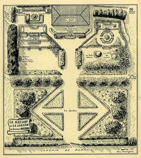 La bastide dite Maison du chemin de Paradis est située chemin de Paradis à Martigues et a été la demeure de Charles Maurras. Les façades et les toitures sont inscrites au titre des monuments historiques depuis le 2 septembre 1975. Édifiée au XVIe siècle, la maison revient en héritage à Marie-Pélagie Garnier, la mère de Maurras, en 1881 ; le bâti aurait été réalisé avec des pierres provenant de l'ancienne église de l'Île. La demeure s'organise sur trois niveaux comprenant trois à quatre pièces, est bordée de cyprès et se trouve à quelques centaines de mètres d'un vieux moulin. Charles Maurras y revenait aussi souvent que possible, tant en été que durant l'année. Il fit rapatrier sa bibliothèque de Paris pour faire de la bastide « le cœur d’une maison de grand écrivain » et envisageait d'y créer un centre d'études littéraires et historiques, à la fois musée et bibliothèque. Il prévoyait aussi la mise sous administration d'un comité chargé de ses archives, correspondances, livres, manuscrits, éditions de luxe, tableaux et souvenirs, et souhaitait transformer sa collection de douze mille livres en « bibliothèque populaire ». Ce fonds se distingue notamment par de nombreux ouvrages dédicacés par des auteurs tels qu'André Gide, Malraux, Anatole France, Paul Valéry et Joseph Kessel. Le jardin, légué à la ville, rassemble amphores et inscriptions grecques, épigraphes provençales et françaises, statues, arbres odoriférants et essences méditerranéennes plantées avec une référence particulière à la Grèce ; Maurras en a conçu les plans d'après un devis d'exécution daté de 1943 et son texte Le pain et le vin publié en 1944. Il y fit édifier un monument en l'honneur de Gérard Tenque, fondateur de l'ordre des Templiers et natif de Martigues. Le mur des Fastes, construit en 1944 sur ses instructions, porte en lettres capitales un condensé de l'histoire locale évoquant origines antiques, personnages et événements marquants de Martigues ; Maurras ne vit pas l'œuvre achevée en raison de son incarcération. Devant ce mur se trouve un buste de Charles Maurras, réalisé par l'architecte et sculpteur Henry Bernard, reposant sur un merlon du mur grec ou sur un mascaron de fontaine provenant du site archéologique de Saint-Blaise. Conformément à ses dernières volontés, le cœur de Maurras a été séparé du corps et enterré dans le jardin de Martigues, déposé dans un carditaphe aménagé en contrebas du mur des Fastes, tandis que sa dépouille repose à Roquevaire ; lors de la cérémonie, le curé de Ferrières bénit le cœur et Victor Rolland rendit hommage au nom des pêcheurs de Martigues. Maurras avait suggéré la création d'un comité de gestion de la bastide composé du maire, d'élus représentant plusieurs tendances politiques, d'un représentant du musée et de proches amis, projet qui n'aboutit pas. À son décès en novembre 1952, la bâtisse et le jardin furent légués à la mairie, proposition d'abord refusée par des élus communistes qui contestaient la validité du testament ; pendant près de quarante ans, les héritiers et la Société des amis de Charles Maurras assurèrent les visites. Le 27 septembre 1997, le maire Paul Lombard accepta formellement le legs des mains de Jacques Maurras, en présence notamment de Michel Déon ; la mairie s'engagea à pérenniser l'ensemble immobilier et son jardin, à entretenir la bibliothèque et à conserver la maison dans sa conception de « maison d'écrivain ». La municipalité a engagé plus de 200 000 euros en 2012 pour des travaux de restauration. Depuis 2018, la maison et son fonds bibliothécaire ont été intégrés à un projet de centre de ressources et de recherches sur les politiques du XXe siècle destiné aux chercheurs, initiative présentée comme visant aussi à fournir des outils pour critiquer la pensée de Maurras. En 2018, un reportage a signalé la fermeture du site ; 850 000 euros ont été débloqués pour la réhabilitation de la bastide mais les travaux n'ont pas encore été entrepris et la maison reste fermée au public pour raisons de sécurité en attendant ces interventions. Charles Maurras a publié un recueil de contes intitulé Le Chemin de Paradis en 1895, et Joseph Kessel relate une visite à la demeure dans son ouvrage De la rue de Rome au Chemin de Paradis (1927).
