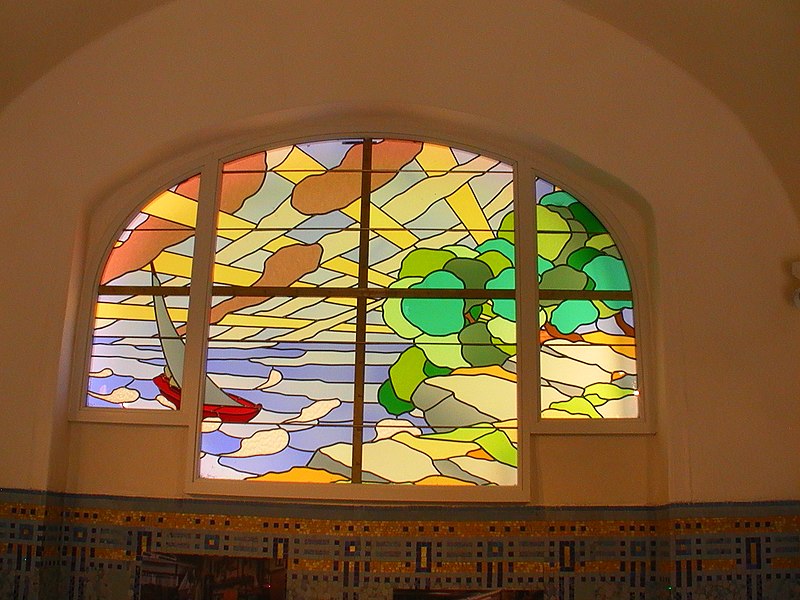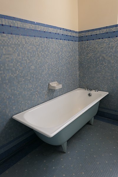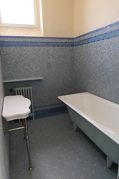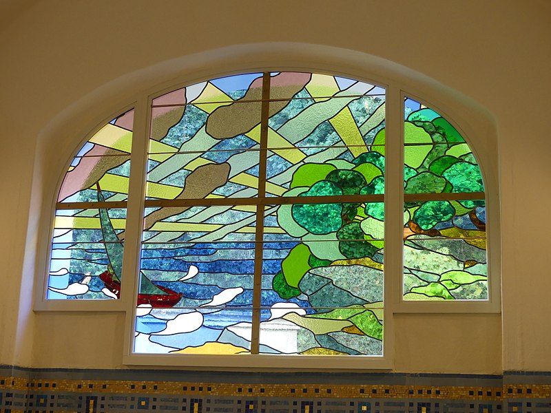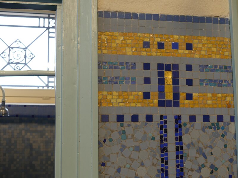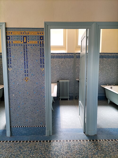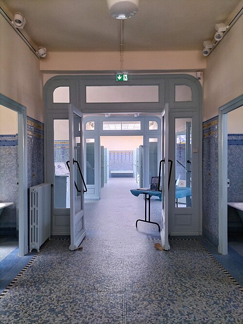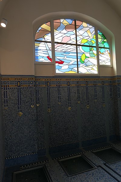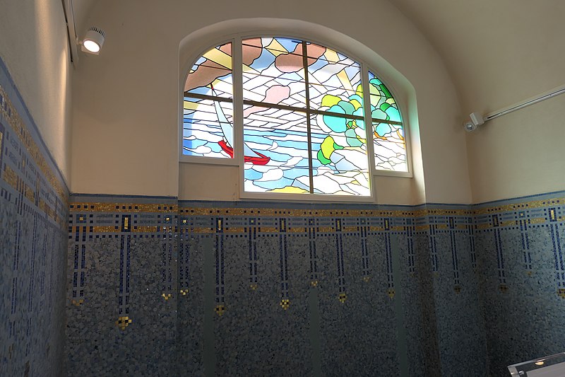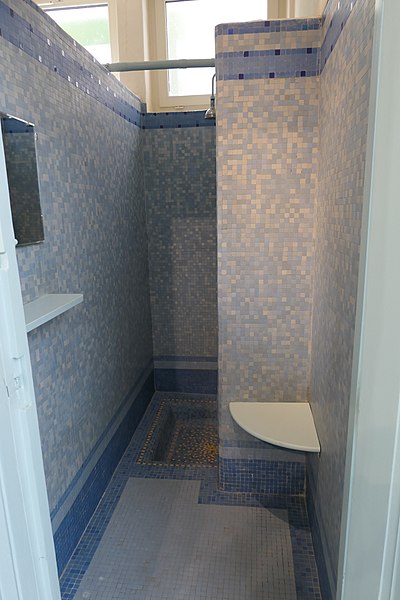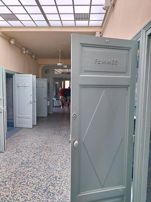 Le bâtiment des bains-douches, situé 32-32bis quai Albert‑Goupil à Laval (Mayenne), a ouvert ses portes à la fin de 1926. Selon les sources, il disposait alors de quatre baignoires, seize cabines de douche et d'un WC ; d'autres indications contemporaines de l'inauguration mentionnent huit baignoires, seize cabines et un WC. L'initiative, portée par le maire Eugène Jamin dans un contexte hygiéniste où, en 1923, un foyer lavallois sur cinq seul possédait une salle d'eau, a été soutenue par l'État au moyen de subventions prises sur les profits des jeux. Le projet confié à l'architecte lavallois Léon‑Henri Guinebretière présente une façade d'inspiration néo‑égyptienne, selon la Fondation du patrimoine. Le décor extérieur comprend des ferronneries réalisées par la serrurerie Bourny. L'intérieur conserve un riche ensemble de mosaïques réalisées par Isidore Odorico fils, de style art déco avec des motifs géométriques bleus, jaunes et verts, sur le thème de la goutte d'eau, bleu et or. À l'entrée, un léopard en mosaïque reprend le blason de la ville de Laval. Un vitrail d'Auguste Alleaume, placé au‑dessus de la caisse centrale, fut soufflé lors d'un bombardement en 1944 ; une reproduction, d'après les cartons de l'artiste et ses autres œuvres, a été réalisée en 2017 par les ateliers angevins Barthe‑Bordereau. L'inauguration, qui a donné lieu à un discours du rapporteur municipal M. Levesque, illustrait l'ambition de faire des bains‑douches un « palais social » réunissant classes populaires et élites, les choix artistiques constituant un parti pris de luxe au service de cette idée. Avec l'amélioration des conditions d'hygiène dans l'habitat privé, la fréquentation a diminué à partir des années 1980, conduisant à la fermeture des bains‑douches en novembre 2003. Une grande rénovation conduite par la municipalité, avec le soutien de la Fondation du patrimoine et du club des mécènes du patrimoine de la Mayenne, s'est déroulée de 2014 à 2017. L'édifice a été rouvert au public à l'occasion des Journées du patrimoine en 2017. Le bâtiment a reçu le label « Patrimoine du XXe siècle » en 2010 et les bains‑douches ont été inscrits aux Monuments historiques le 9 octobre 2014 ; l'inscription concerne notamment l'entrée, le vitrail d'Alleaume, le blason et les mosaïques d'Odorico.