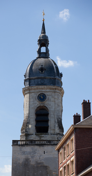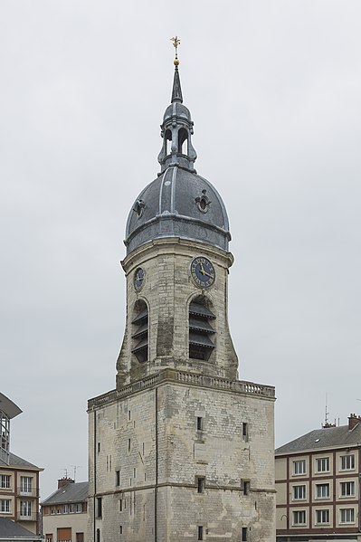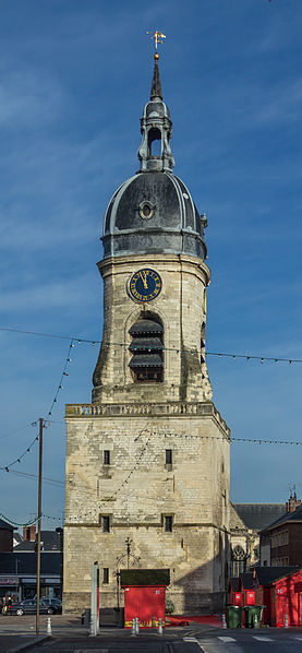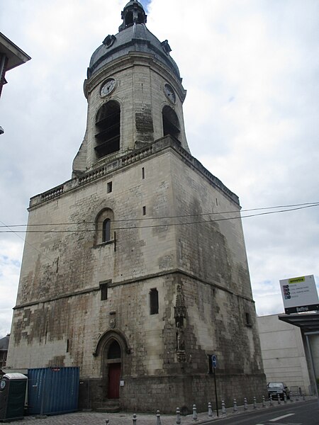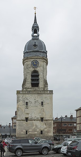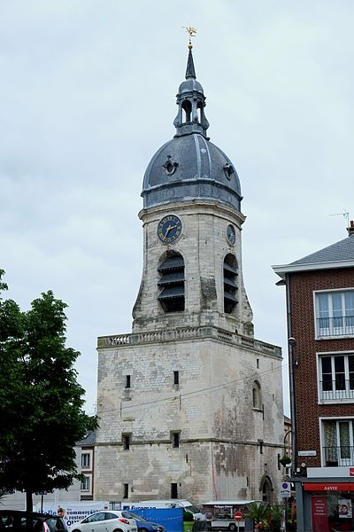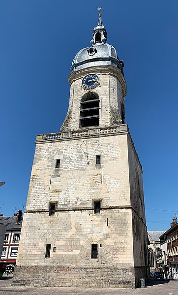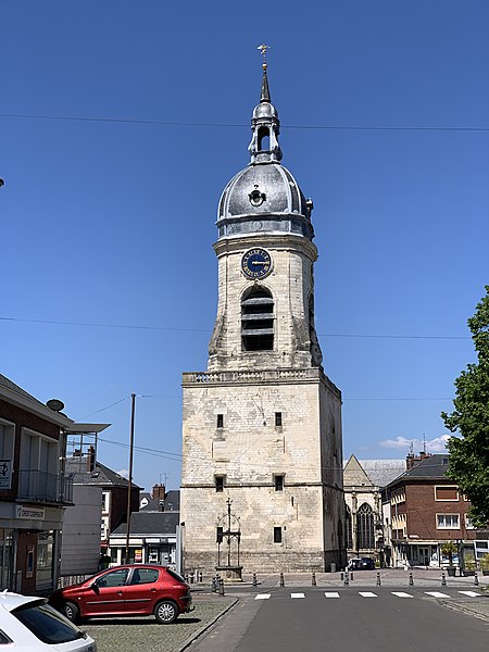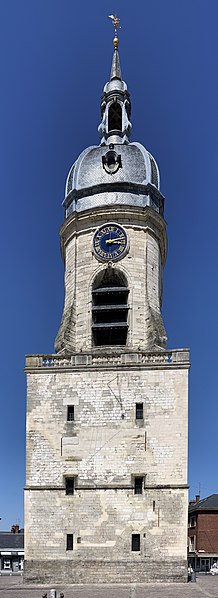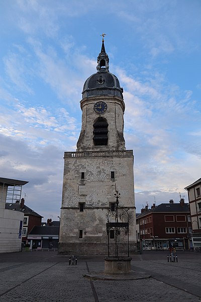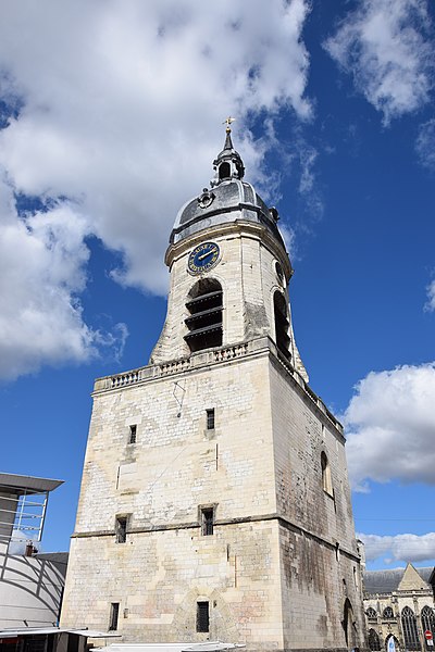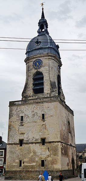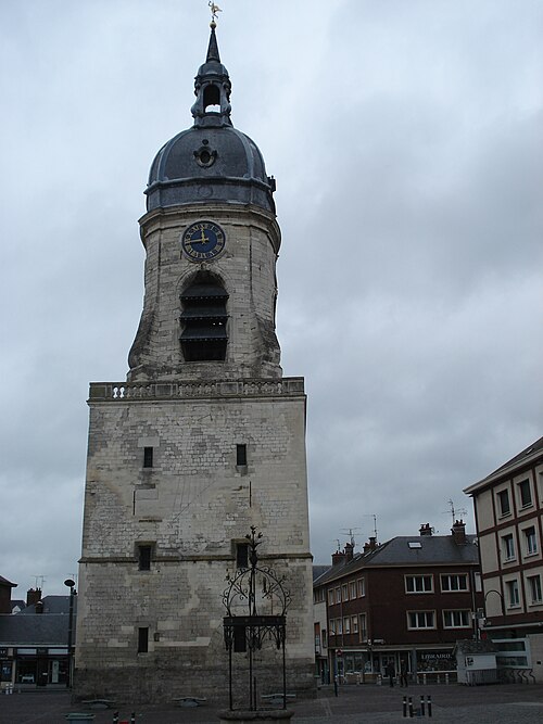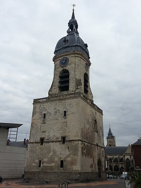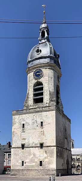 Le beffroi d'Amiens, situé place au Fil dans le centre-ville, est inscrit à l'inventaire supplémentaire des Monuments historiques depuis le 7 août 1926 et figure depuis 2005 au patrimoine mondial de l'UNESCO au titre des Beffrois de Belgique et de France. Les Amiénois le surnomment en picard « Ch' Bédouf ». L'origine du beffroi remonte à la fondation de la commune d'Amiens en 1113, reconnue par l'évêque Geoffroy et le roi Louis VI. Les comte Enguerrand de Boves et son fils Thomas de Marle refusèrent d'abord cette reconnaissance ; Guibert de Nogent et Suger rapportent ces événements et l'intervention militaire du roi. Les opposants se retranchèrent dans la forteresse du Castillon, héritée de l'époque romaine ; Louis VI tenta un assaut en 1115, fut blessé, puis le siège se prolongea deux ans ; en 1117 le Castillon tomba et fut détruit sur ordre du roi, et les bourgeois firent édifier le beffroi sur son emplacement. Le monument est mentionné pour la première fois dans une sentence arbitrale du chapitre d'Amiens en 1244. Reconstruit au début du XVe siècle entre 1406 et 1410, il symbolisait l'indépendance communale et servit successivement de salle de réunion pour les notables, de dépôt d'archives, de magasin d'armes et de prison, tandis qu'un guetteur surveillait les abords et alertait la population. Un règlement du 29 mai 1782 impose que, sur le son de la cloche du beffroi, les quatre compagnies privilégiées se rendent sur les lieux d'un sinistre vêtues de leurs chapeaux d'uniforme et de leur giberne, pour maintenir l'ordre sous la direction des officiers municipaux et du commandant de place. Le beffroi jouxte les Halles et l'arrière de l'Hôtel de ville et sonnait chaque heure. Il a subi des incendies les 13 août 1562 et 16 avril 1742 ; les réparations ne commencèrent qu'en 1749 et le projet de l'architecte Beffara fut finalement retenu, donnant au beffroi l'aspect qu'il présente aujourd'hui. La grosse cloche « Marie-Firmine » fut fondue le 2 août 1748 dans les jardins de l'évêché par Jean et Charles Cavillier, fondeurs à Carrépuis : elle mesurait 2,43 m de diamètre, 2,06 m de hauteur, pesait 11 tonnes et son battant pesait 315 kg. Le 19 mai 1940, un violent bombardement de la Luftwaffe détruisit la toiture et la charpente ; la cloche de 11 tonnes se brisa en tombant au sol. Le monument resta à l'abandon et dépourvu de toiture jusqu'aux travaux de restauration engagés en 1988 ; il retrouva une nouvelle charpente, inspirée du XVIIIe siècle, en 1989 et une nouvelle girouette dite « renommée » fut posée en 1990. La grosse cloche ne fut pas refondue et un carillon fut installé à sa place, conformément à la décision du maire Gilles de Robien. Le beffroi s'élève à 52 mètres de hauteur ; il présente une base en pierre de taille blanche construite au XVe siècle, surmontée d'un clocher en pierre édifié à partir de 1749, avec des volutes de style baroque à sa base, un dôme couvert d'ardoises, une flèche et la girouette sommitale. À l'intérieur subsistent des cachots ornés de graffitis et les fragments de la cloche brisée. Lors de la restauration, un tailleur de pierre a sculpté, aux arrêts de la moulure de l'archivolte de la porte, les portraits des deux maires qui se sont succédé pendant ces travaux, René Lamps (1988-1989) et Gilles de Robien (1989-1990).