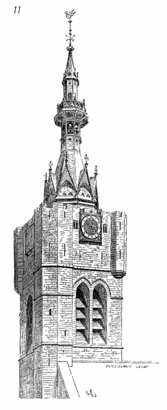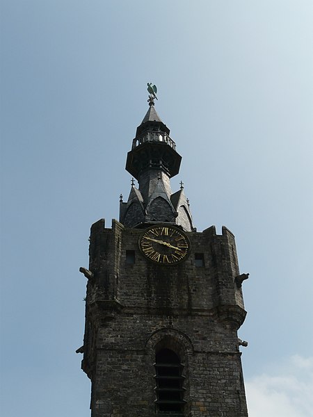 La tour est de plan carré, flanquée de tourelles hexagonales et couronnée par un campanile qui abrite le carillon. Elle compte quatre étages desservis par 133 marches : la salle des échevins, au premier étage, présente une clé de voûte décorée d’une couronne et s’ouvrait sur un balcon en bois pour les proclamations ; le deuxième étage correspondait à la salle du guetteur, qui servit de logis au surveillant ; le troisième abrite la salle du carillon, qui comporte trente‑cinq cloches ; le quatrième donne accès au chemin de ronde et à la salle de l'horloge.