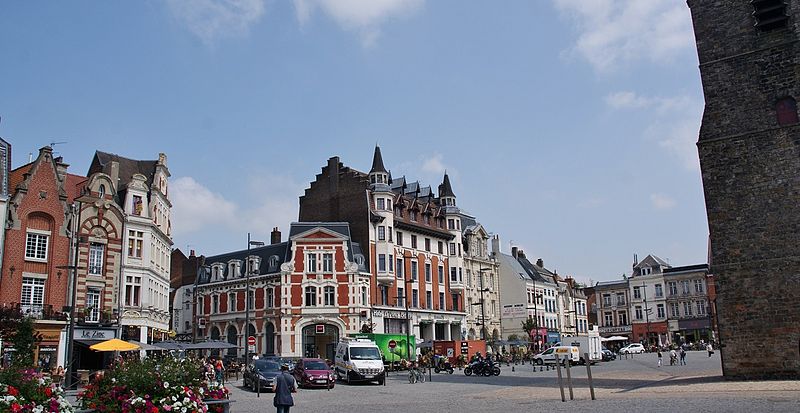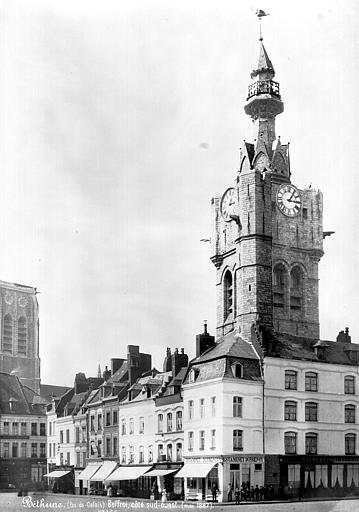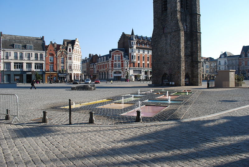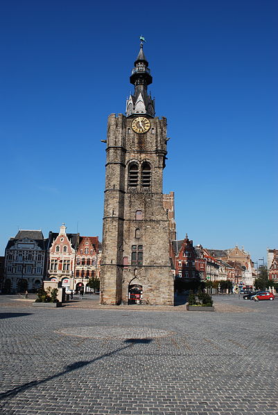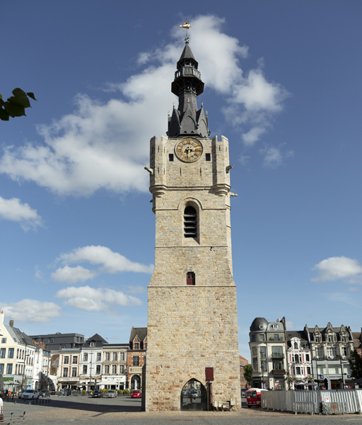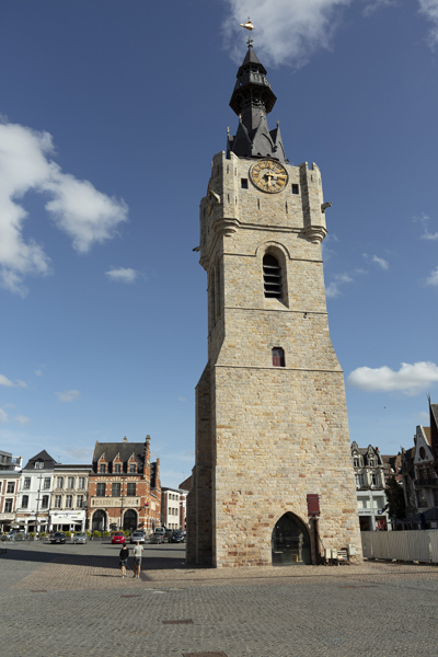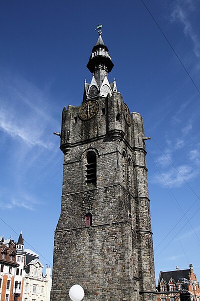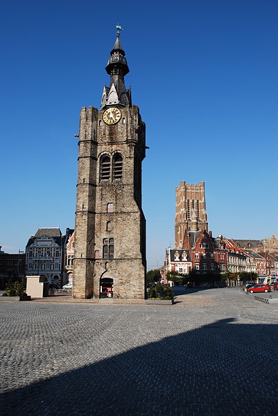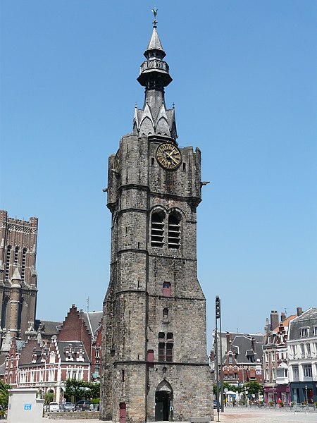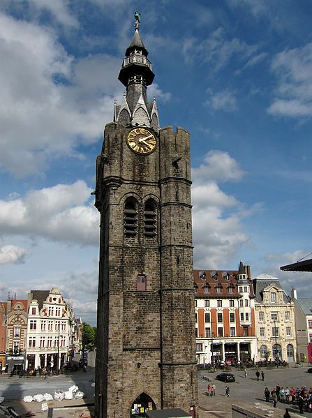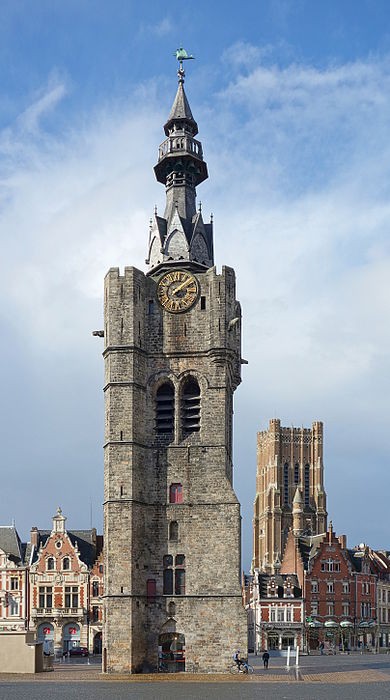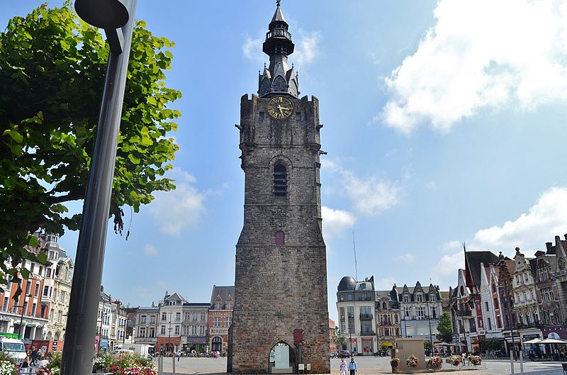 Le premier beffroi, en bois, fut construit en 1346 puis détruit par un incendie. En 1388, le marquis Guillaume Ier de Namur autorisa sa reconstruction en grès afin d’obtenir un édifice plus solide. Un troisième étage y fut ajouté en 1437 et, en 1546, les échevins firent installer un carillon de six cloches. En 1553, Charles Quint compléta ce carillon avec des cloches de Thérouanne. La halle aux draps qui entourait alors le beffroi fut détruite par un incendie en 1664, laissant la tour isolée sur la place.