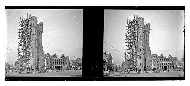 Après la guerre, il fut décidé de laisser le beffroi isolé au centre de la place, malgré la proposition de Louis‑Marie Cordonnier d’y adjoindre l’hôtel de ville. Sous l’autorité de Paul Degez et des services des monuments historiques, la reconstruction visa à reproduire l’édifice à l’identique : la réfection de la toiture et du campanile commença en 1921, puis la restauration des façades débuta en 1923, les pierres dégradées étant remplacées par du grès provenant de l’ancienne église Saint‑Vaast, détruite pendant le conflit.