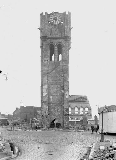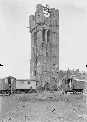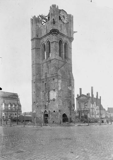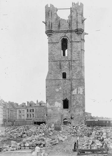 Du XVIIIe siècle jusqu'aux destructions de la Première Guerre mondiale, le beffroi resta enfermé dans un pâté de maisons. En 1773, le campaniste Philippe le Corsin remplaça le carillon de six cloches par trente‑six nouvelles cloches. Pendant la Première Guerre mondiale, la ville, au cœur du conflit, maintint un guetteur dans le monument pour prévenir tout incendie. En mai 1918, des bombardements détruisirent le campanile et le carillon ; cependant la tour résista aux attaques et au feu en partie grâce aux habitations qui l'entouraient.