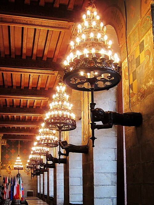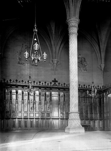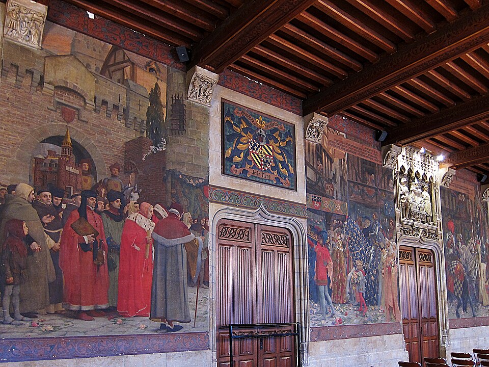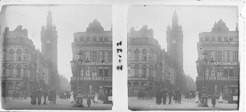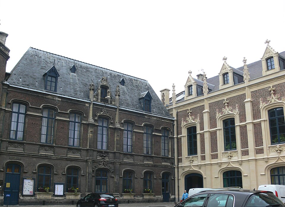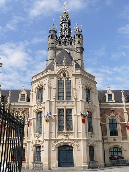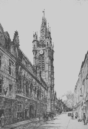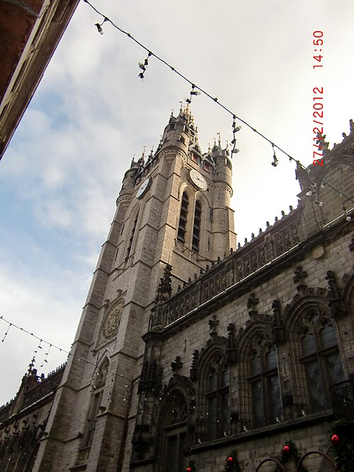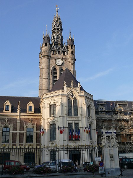Le beffroi de Douai, monument symbolique de la ville, domine l'hôtel de ville et la région environnante. Sa construction a été entreprise en 1380 sur l'emplacement d'une ancienne tour en bois pour servir de tour de guet ; un bâtiment gothique fut ajouté à l'ouest et une chapelle au sud. Pour fournir les matériaux, le chevalier Jacques de Halluyn et son fils Jean vendent le 1er août 1379 les pierres de leur château de Cantin. Les travaux s'achèvent en 1410. Un violent incendie causé par la foudre, appelé l'incendie de Meschief, détruit la flèche, qui est entièrement reconstruite en 1475. Un carillon est installé dès 1391 et rythme la vie des habitants. En 1730, Nicolas Levache fonde des cloches pour le beffroi. Les cloches sont fondues par l'occupant allemand en 1917 puis remplacées en 1924 par la maison Wauthy de Douai. Pour améliorer le son, la ville installe en 1954 quarante-sept cloches de la fonderie Paccard d'Annecy-le-Vieux, qui complètent les deux plus grosses datant de 1471 et restaurées en 1924 : « Joyeuse » (la, 5 500 kg) et « La disnée » (do, 2 400 kg). La plus lourde des cloches de 1954, « La Nouvelle Victoire » (ré), pèse 1 600 kg. Le carillon est complété en 1974 lors du congrès mondial des carillonneurs et comporte désormais 62 cloches réparties sur cinq octaves. Il est doté d'un mécanisme qui joue une mélodie à chaque quart d'heure et d'un clavier manuel permettant des concerts chaque samedi de 10h45 à 11h45 hors période scolaire. Au XIXe siècle, d'importants travaux de restauration renforcent la structure en grès des Flandres par une forte épaisseur de briques intérieures et un nouvel édifice, identique à celui du XVe siècle, est ajouté pour donner à l'hôtel de ville son aspect symétrique actuel ; cet ensemble comprend notamment une salle des fêtes de style Second Empire. Victor Hugo, de passage à Douai en 1837, décrit et dessine le beffroi ; son dessin est conservé au musée Victor Hugo, place des Vosges à Paris. L'ensemble de l'hôtel de ville et du beffroi est classé au titre des monuments historiques en 1862. Le beffroi a également été représenté par le peintre Jean-Baptiste Camille Corot.