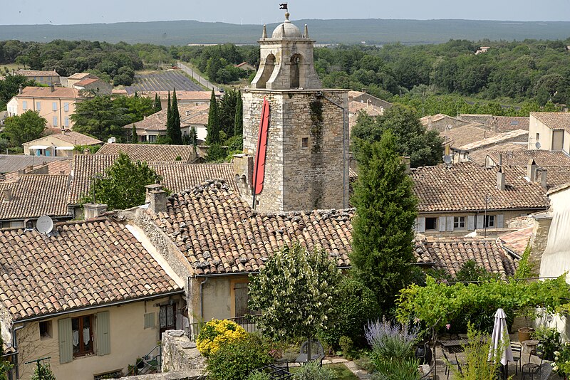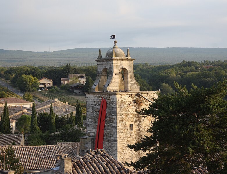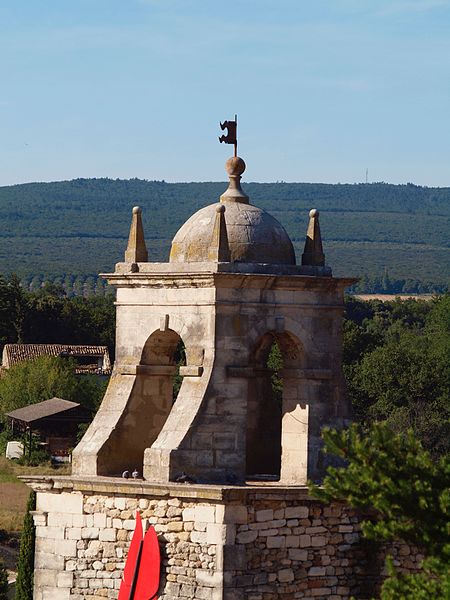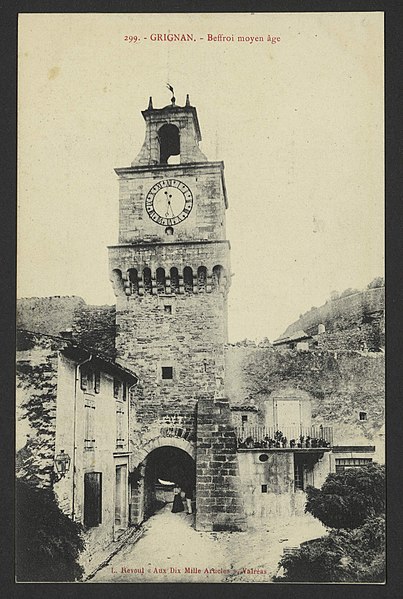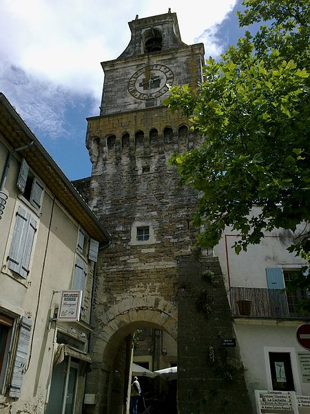 Une première enceinte, datable avec réserve au milieu du XIIe siècle d'après le contexte historique, est lisible dans le parcellaire du bourg à l'ouest, au sud et à l'est, ainsi que dans quelques vestiges en élévation : au sud‑ouest un tronçon de courtine figurant sur un cliché ancien, une tour et l'indice d'une porte de ville. L'enceinte visible aujourd'hui a été construite dans la seconde moitié du XIIIe siècle. Elle intègre au nord le bailliage, probablement élevé entre 1257 et 1283, comprend la porte dite du Tricot au nord‑ouest, bâtie au XIIIe siècle, et se rapproche du site castral à l'est pour constituer sa défense avancée. Des réparations et modifications sont mentionnées en 1357, 1362, vers 1400, 1488, 1525 et 1536, tandis que deux interventions sont précisément datées par inscriptions : 1573 au sud‑ouest et 1748 au sud‑est. Le tracé et l'élévation près de la porte du Tricot ont été modifiés en 1723 et 1774 ; ce secteur s'est ensuite effondré en 1857 puis à nouveau en 1989. Un pan de courtine a été supprimé au sud à une date incertaine pour former la place aux Herbes. L'enceinte comportait des tours rondes et quelques tours carrées ; une quinzaine sont attestées ou probables, mais seules huit sont, à divers états de conservation, plus ou moins bien conservées. À la fin du XVIIIe siècle sept portes sont mentionnées. La porte Saint‑Jean, ou de la Font, a été remaniée au XVe siècle. La porte du Tricot a été surélevée au XIVe siècle, dotée d'une horloge en 1579 et d'un campanile en 1600. La porte du Jeu de ballon a été détruite en 1833. Le petit faubourg au nord‑ouest, qui semble se développer à partir du XVe siècle ou au début du XVIe siècle, devait être protégé par une enceinte aujourd'hui totalement disparue dont la porte dite du petit faubourg est connue par les textes. Le grand faubourg, construit pour Louis Adhémar dans les années 1540‑1550, était entouré d'un mur en 1596 ; la tour d'angle et l'extrémité ouest de ce tracé sont partiellement conservées.