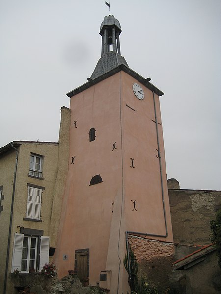 Le beffroi semble remonter au Moyen Âge et a été modifié à diverses époques. Il abrite une horloge du XVIIIe siècle qui a conservé son mécanisme. La construction, de plan carré, est englobée dans d'autres bâtiments et trois petites fenêtres éclairent la montée de l'escalier. Sous le toit, une corniche en pierres de Volvic marque la base du campanile hexagonal, formé de six petites colonnes et surmonté d'un dôme couronné d'une girouette.