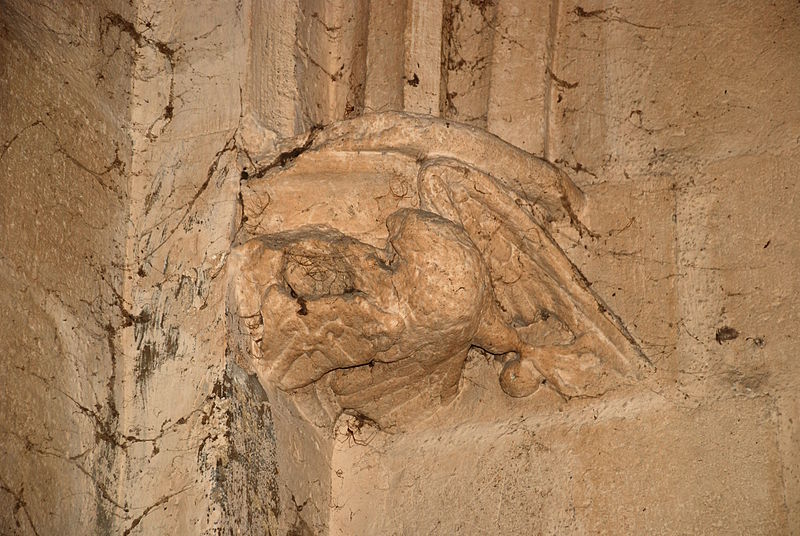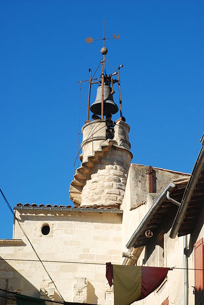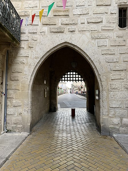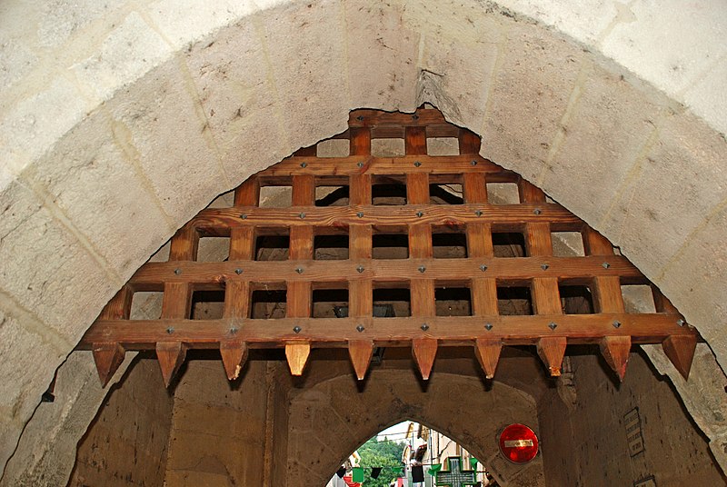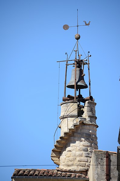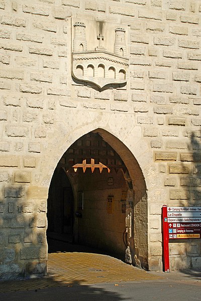 La porte ogivale était équipée d’une herse ; le passage voûté en ogive présente des arêtes retombant sur des culs-de-lampe historiés aujourd’hui fortement abîmés. Dans ce passage, une porte très étroite donne accès à l’escalier en colimaçon logé dans la tourelle circulaire qui surmonte la tour. La tourelle est couronnée d’un campanile en fer forgé qui porte une cloche en bronze de près de 1 300 kg datée de 1613, classée comme objet le 30 novembre 1912. Cette cloche, tombée lors de sa seconde installation en 1657, est fêlée et produit un son étouffé particulier.