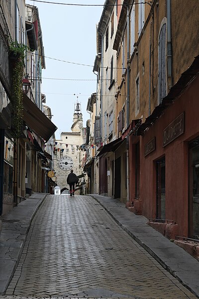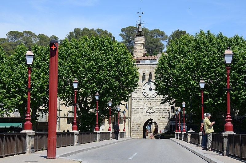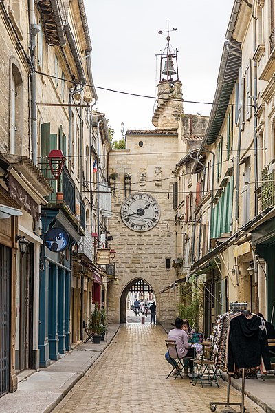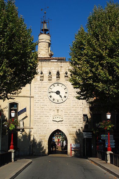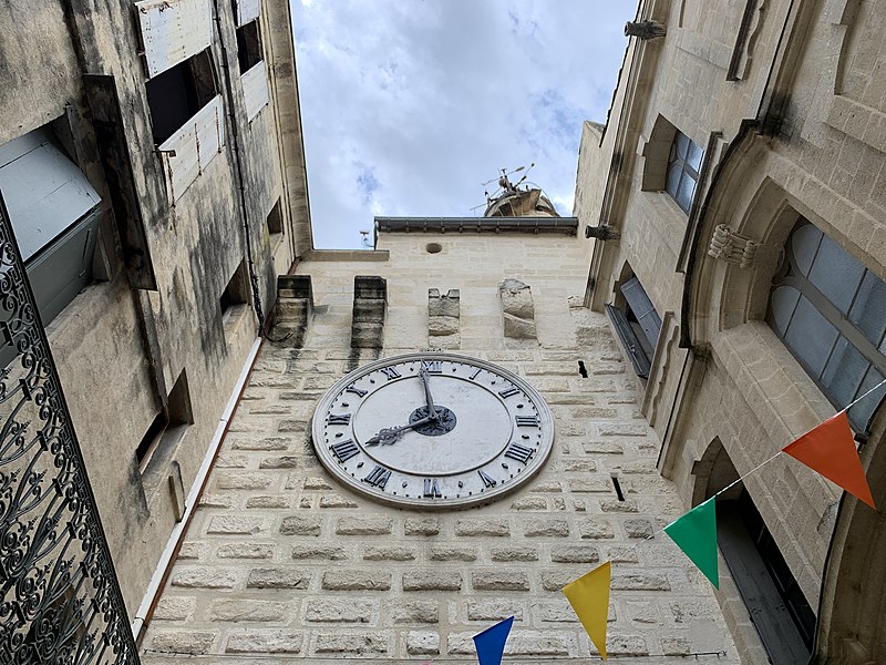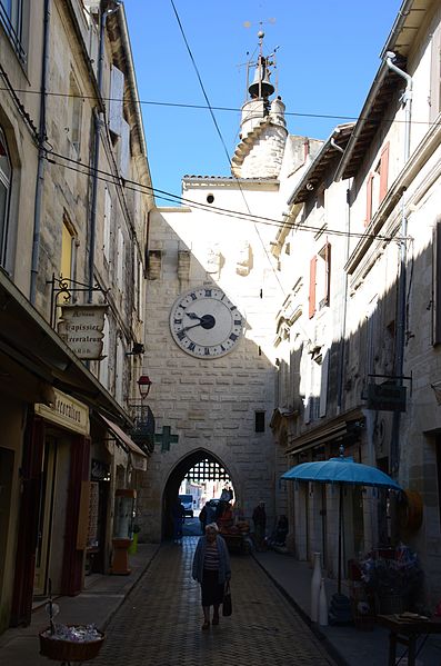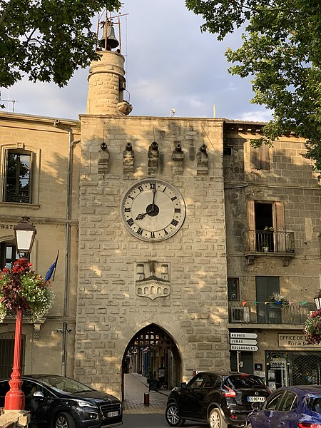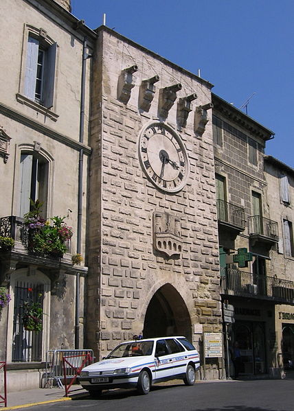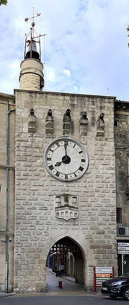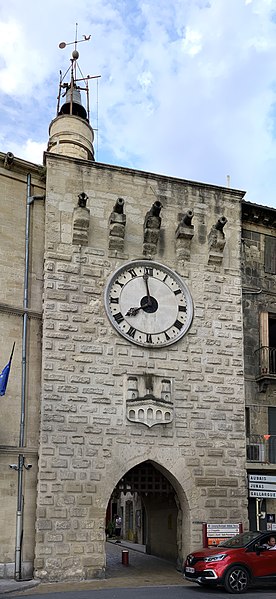 De plan rectangulaire, la tour est construite en pierres de taille à bossage. Au rez-de-chaussée, une porte ogivale ouvre sur la rue Marx-Dormoy ; elle est surmontée du blason de la ville, qui représente une croix, le pont romain, le beffroi et la « Gleizette ». La façade est ornée d’une horloge monumentale et de gargouilles en forme de canon reposant sur des consoles en pierre ; côté intra-muros, une horloge semblable porte le millésime 1880 et l’on relève deux gargouilles en forme de canon ornées de feuilles d’acanthe sur la maison voisine.