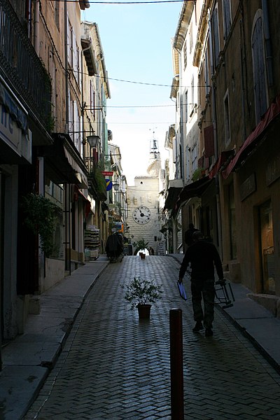 De plan rectangulaire, la tour est construite en pierres de taille à bossage. Au rez-de-chaussée, une porte ogivale ouvre sur la rue Marx-Dormoy ; elle est surmontée du blason de la ville, qui représente une croix, le pont romain, le beffroi et la « Gleizette ». La façade est ornée d’une horloge monumentale et de gargouilles en forme de canon reposant sur des consoles en pierre ; côté intra-muros, une horloge semblable porte le millésime 1880 et l’on relève deux gargouilles en forme de canon ornées de feuilles d’acanthe sur la maison voisine.