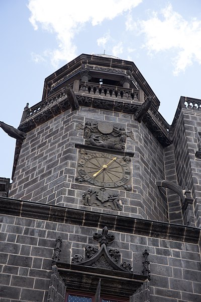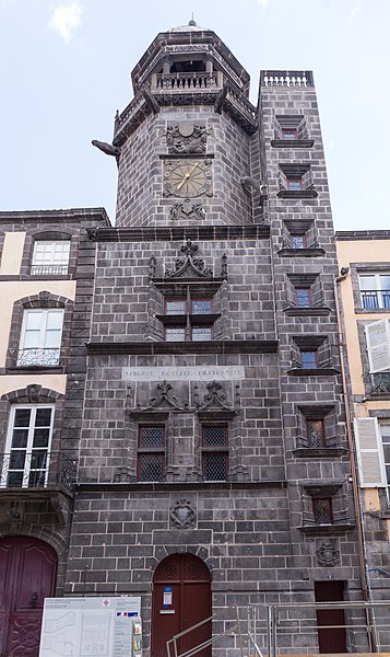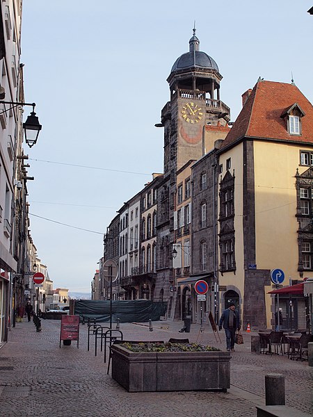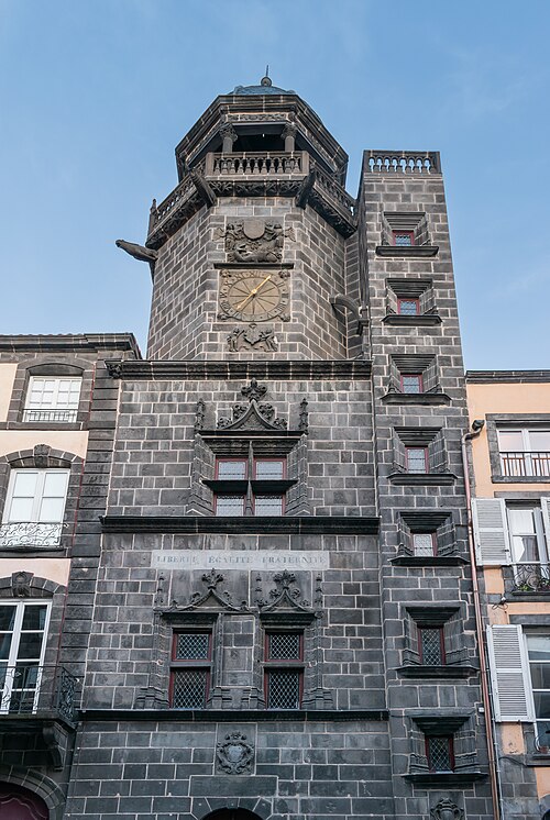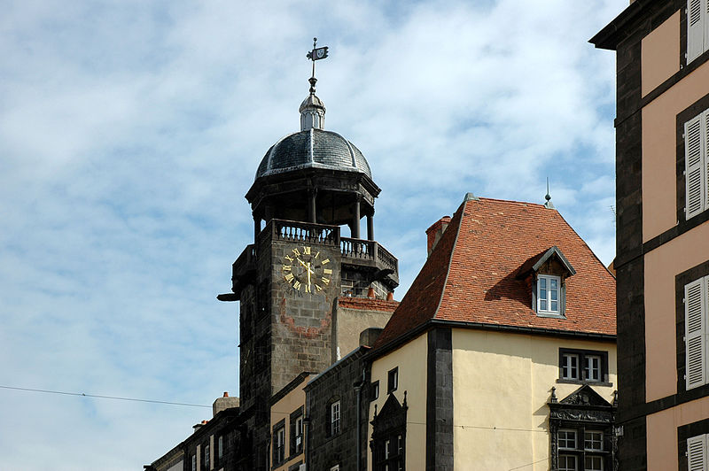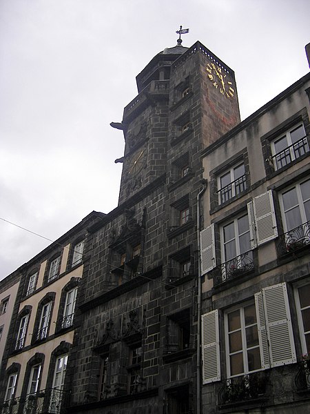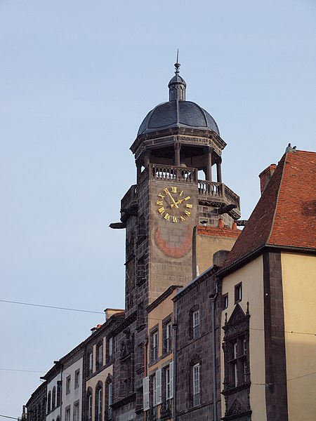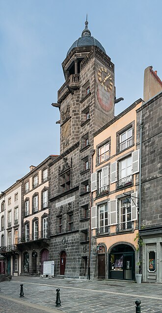 Le beffroi de Riom, dit Tour de l'Horloge, est un édifice du XIVe siècle implanté sur la place des Taules à Riom. Sa construction est liée au don d'une horloge par Jean de Berry en 1391 ; le duc participa également financièrement aux travaux et offrit un jacquemart. Les consuls, désireux d'affirmer le pouvoir des bourgeois et de placer la cloche consulaire symbole de leur autorité, avaient acheté en 1391 à la famille Daniel une demeure à tour pour 200 francs d'or afin d'y installer ces éléments. Le droit de posséder une cloche municipale trouve son origine dans la charte de franchise dite alphonsine de 1270 et dans l'autorisation royale accordée en 1345. Une reprise importante à la Renaissance a donné à la partie supérieure un plan octogonal avec dôme ; elle est datée stylistiquement et par la présence d'une salamandre sculptée sur la façade. En 1646, une violente tempête renversa le dôme Renaissance, qui fut rebâti en réemployant des éléments antérieurs et en conservant le plan octogonal soutenu par huit supports. Le dôme fut à nouveau reconstruit après 1689 à partir des vestiges d'un puits appartenant aux trésoriers de France, et des travaux complémentaires eurent lieu à la fin du XVIIIe siècle. Sous la Révolution, les symboles royaux présents sur l'édifice furent effacés. L'aune-étalon, mesure officielle de Riom sous l'Ancien Régime, est apposée au bas de la façade, à gauche de l'entrée, à proximité des étals de la place des Taules. Classé au titre des monuments historiques depuis 1862, le beffroi appartient aujourd'hui à la ville de Riom et abrite le siège du Pays d'art et d'histoire Riom Limagne et Volcans ainsi qu'un espace muséographique consacré à l'histoire de la ville. Au rez-de-chaussée, une salle d'exposition présente l'évolution urbaine à l'aide de panneaux, d'une chronologie comparée avec l'histoire de France et de maquettes tactiles accessibles aux déficients visuels ; une deuxième salle occupe l'ancienne salle des mécanismes. La plateforme sous le dôme est accessible et offre un point de vue sur la ville et la campagne environnante.