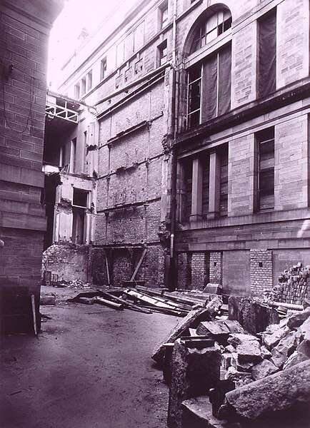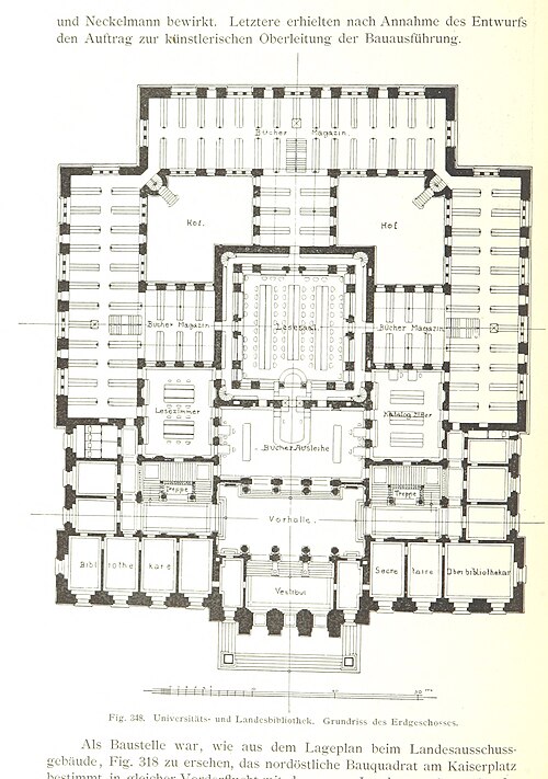 Malgré ces mesures, la BNU subit d'importantes pertes pendant la guerre : un bombardement en septembre 1944 endommagea le bâtiment et provoqua la perte d'environ 200 000 volumes, d'autres dépôts furent anéantis, et des transferts vers l'intérieur du Reich entraînèrent la dispersion de collections, dont des ensembles retrouvés à Zwingenberg, Göttingen et Hohenheim. Les pertes totales pour la période sont évaluées à 500 000 ouvrages. Dans l'immédiat après-guerre, le décor intérieur de l'époque wilhelmienne fut démonté dans le cadre d'un projet de restructuration mené de 1951 à 1956, et les sondages récents n'ont retrouvé aucune trace de ce décor.