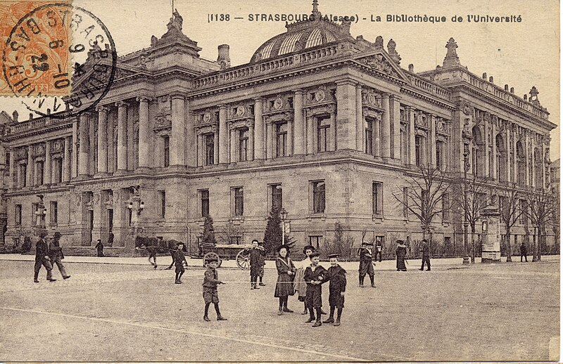 Avant 1870, Strasbourg possédait déjà des collections notables, notamment la bibliothèque du séminaire protestant issue du Gymnase Jean-Sturm et la bibliothèque municipale formée au XVIIIe siècle à partir de l'achat des fonds de Jean‑Daniel Schoepflin. Ces deux ensembles totalisaient plus de 300 000 volumes, dont plusieurs milliers de manuscrits précieux, parmi lesquels l'Hortus deliciarum. Dans la nuit du 24 au 25 août 1870, l'incendie de l'église du Temple-Neuf entraîna la destruction de ces collections. Face à cette perte, Karl August Barack lança un appel aux dons le 30 octobre 1870 ; lors de l'inauguration tenue le 9 août 1871, quelque 200 000 volumes étaient déjà rassemblés au Palais Rohan.