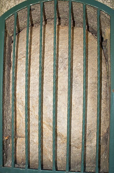 La pierre est déplacée au hameau des Plagnes, près de la chapelle.