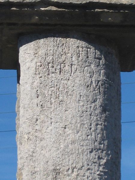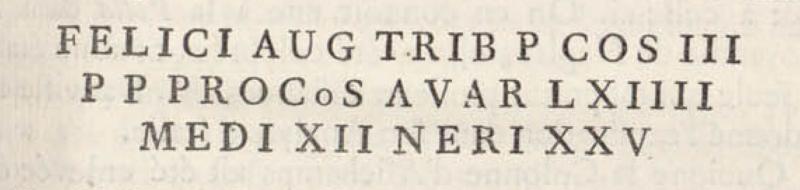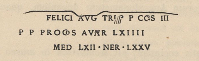 Sur le plan épigraphique, le texte est mutilé : le début de la titulature impériale a disparu lors du retaillage effectué pour le sarcophage, ce qui empêche une identification certaine de l’empereur mentionné. Plusieurs candidats ont été proposés par les spécialistes, et François Jacques, après examen, avance une datation possible en 237 sous le règne de Maximin, rappelant que l’appellatif felix et la formule trib. p. cos. III figurent dans l’épigraphie de cette période. Le décalage observé entre les distances indiquées et celles attendues peut s’expliquer, selon les études, par l’emploi de la grande lieue gauloise de 2,415 km.