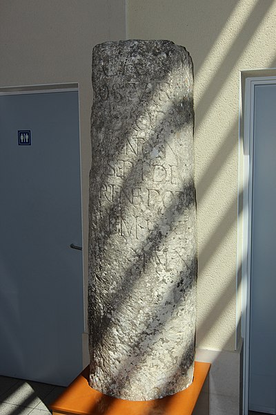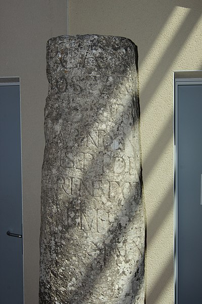 La borne milliaire romaine de Cenon-sur-Vienne présente un fût cylindrique terminé par un massif cubique. L'ensemble a été largement évidé et réemployé comme sarcophage, mais la majeure partie de l'inscription est conservée et encore lisible. Elle est également appelée borne de la Gare des Tramways et correspond à une borne leugaire gallo-romaine. La borne est actuellement conservée dans le hall de la mairie de Cenon-sur-Vienne, commune du canton de Chauvigny, arrondissement de Châtellerault, dans le département de la Vienne, en Nouvelle-Aquitaine. Une portion de la voie gallo-romaine reliant Limonum (Poitiers) à Cæsarodunum a été mise au jour à Cenon-sur-Vienne vers la fin du XIXe siècle. Cet itinéraire, long de 42 « Grande lieues » gauloises — soit environ 102,3 km — est jalonné, dans la commune, de plus de dix bornes leugaires parfois qualifiées à tort de milliaires. L'installation du premier de ces blocs semble liée à des travaux de restauration de la chaussée antique. La borne de Cenon a été découverte en 1928 alors qu'elle gisait dans un complexe funéraire et s'est révélée avoir été réutilisée comme sarcophage. Elle a été inscrite à l'inventaire supplémentaire des monuments historiques par arrêté ministériel le 26 avril 1938. Dans la seconde moitié des années 1960, des investigations au cimetière antique de Cenon ont permis de mettre au jour une seconde borne très semblable à celle de 1928. Cette seconde occurrence porte une inscription identique à l'exception du chiffre romain « V », que l'archéologue François Eygun estime probablement effacé. Selon l'analyse épigraphique, les deux bornes, marquées notamment par le terme « Fines », indiqueraient l'emplacement du site appelé « Vieux Poitiers ». L'inscription de la borne de Cenon, transcrite en caractères latins, est la suivante : « fmp(erator) Caesar Divi Taiani Partitici f (Mus), Divi Nervae nepos, [Trai]- anus Hadrianus [Augustus)}, pontif{ex) maximus, tribun]ic(ia) potes tat(e) VII, co[n)s{ulf) JIÌ, [Lim{ono) XI], Fin(ibus) V. » L'étude épigraphique met en évidence trois éléments matériels. D'abord, l'élément géographique confirme que la borne sert de jalon à la voie reliant Limonum à Cæsarodunum, itinéraire attesté sur le document cartographique de Peutinger. Ensuite, l'élément chronologique permet d'attribuer l'érection de la borne à l'an 123 apr. J.-C., sous le règne de l'empereur Hadrien. Enfin, l'élément métrique montre l'usage des distances en leugae, indiquant l'appartenance de la borne à la civitas des Pictones, l'unité de distance prenant pour référence Limonum/Poitiers selon Maurice Besnier. Des ressources et notices consultables en ligne, telles que le Digital Atlas of the Roman Empire et la base Mérimée, fournissent des informations complémentaires.