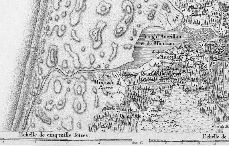 Les bornes ou pyramides de sauveté de Mimizan, appelées ici « Cinq piles de pierre », sont un ensemble de cinq piles maçonnées qui délimitaient le périmètre de l'ancienne sauveté de Mimizan, dans les Landes. Aux Ve, VIe et VIIe siècles, l'Église catholique instaura des asiles dans ses monastères, cimetières ou églises paroissiales. Plus tard, notamment après les raids vikings, elle créa de vastes espaces autour de lieux de culte, délimités par des bornes, pour protéger les populations. Pour Mimizan, la « frangitas » d'un manse est évoquée entre 1009 et 1032 lors de la confirmation d'une donation au prieuré Sainte Marie, et la « Salvitas » de Mimizan apparaît pour la première fois en 1270. La sauveté était originellement délimitée par sept à neuf bornes formant un polygone irrégulier de plus de 200 hectares. Cinq de ces bornes subsistent aujourd'hui ; quatre sont accessibles au public et la cinquième se trouve dans l'enceinte de la papeterie Gascogne Papier. Bâties sur des monticules, ces hautes bornes en garluche ont la forme de pyramides élancées. Elles s'élevaient initialement à une hauteur de 4,10 à 4,50 mètres, étaient espacées d'environ 1800 mètres et étaient surmontées d'une croix pour être visibles de loin depuis la plaine. La sauveté de Mimizan était centrée autour de l'église du prieuré bénédictin Sainte Marie, dont il ne subsiste que le clocher-porche, et elle accordait franchises et libertés à la communauté qui vivait dans ses limites. Les bornes de sauveté ont été inscrites aux monuments historiques par arrêté du 13 juin 1941, pendant l'occupation allemande (28 juin 1940–24 août 1944). La borne de Vigon n'occupe plus son emplacement d'origine : elle a été déplacée de quelques mètres en 1963 pour permettre la construction d'une maison. Avec la borne de Cantegrouilles, elle constitue l'un des vestiges les mieux conservés. Des deux bornes qui délimitaient la partie sud de l'ancienne sauveté, il ne reste aujourd'hui que les fondations. Des documents et des images illustrent l'ensemble, notamment un extrait de la carte de Cassini (feuille n°137) vers 1780 marquant l'emplacement des pyramides, le vestige de la borne de Cadette près de l'avenue des Castors, une vue de la rue de la Sauvetat et des photographies anciennes dont une de 1884 par Jean‑Auguste Brutails.
