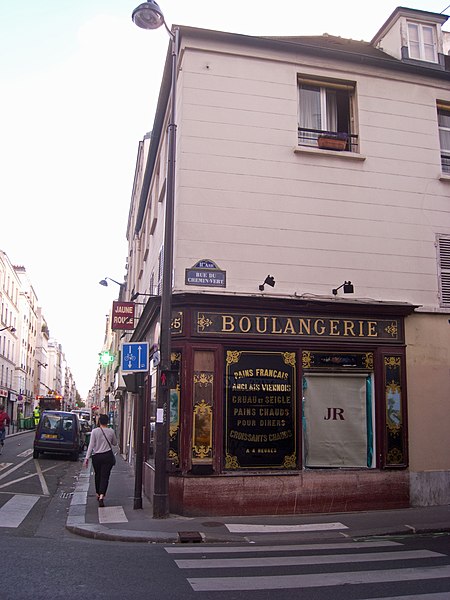 Intitulée "Boulangerie française et viennoise", cette boutique a été aménagée vers 1900 par l'atelier des décorateurs Benoist et Fils. Sa devanture présente six panneaux ornés de scènes champêtres — moulins, meules de blé et rivières — et la porte d'entrée comporte un verre gravé représentant une semeuse.