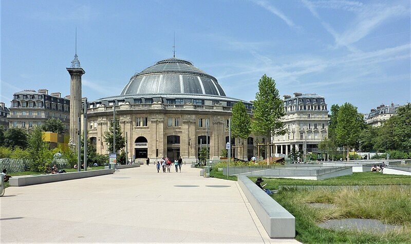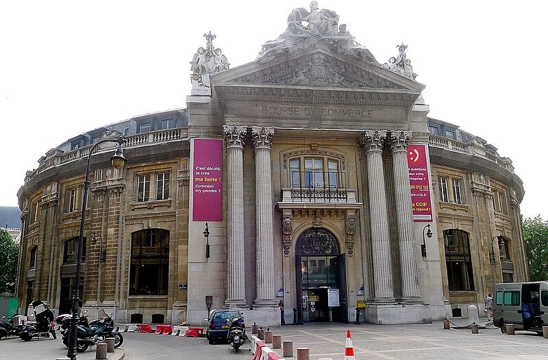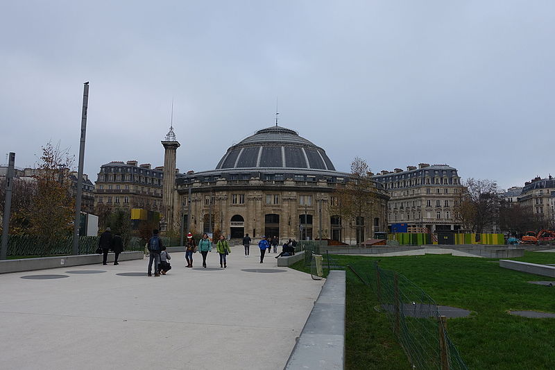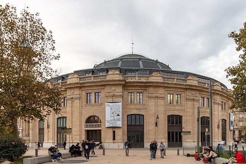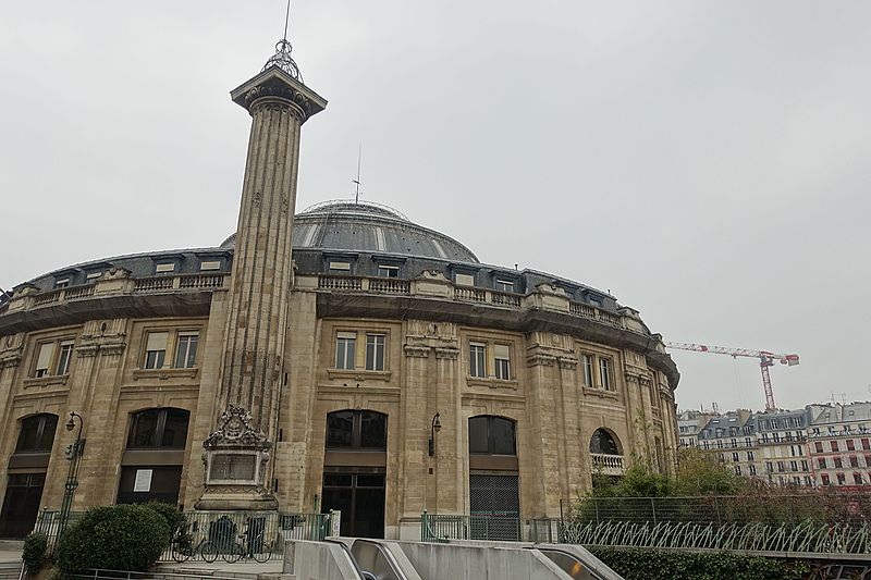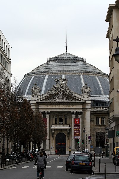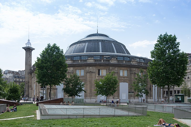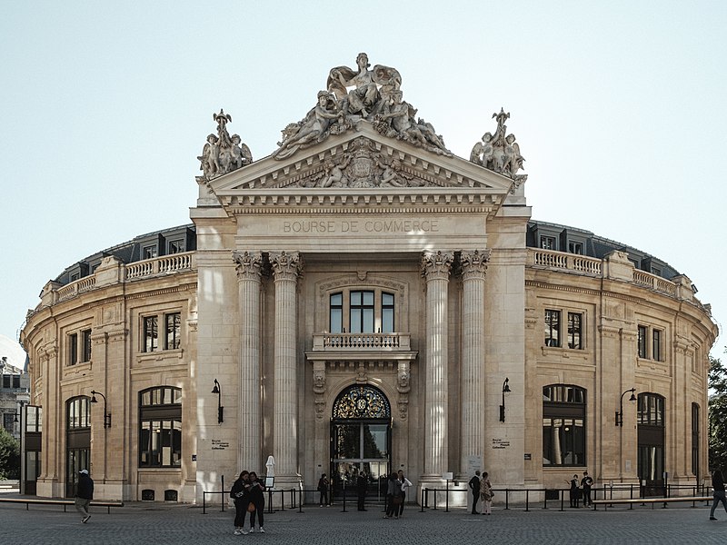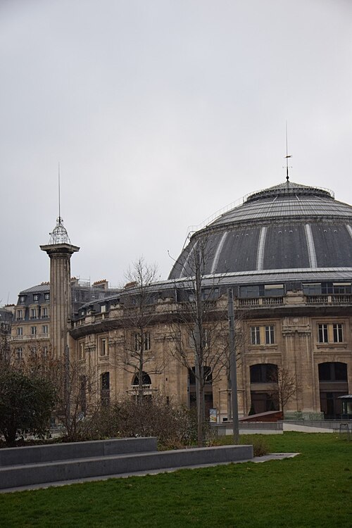 La Bourse de commerce, édifice circulaire coiffé d'une coupole, se situe rue de Viarmes, dans le 1er arrondissement de Paris. L'édifice actuel, construit en 1888-1889 par l'architecte Henri Blondel, occupe l'emplacement de l'ancien hôtel de Soissons. Blondel a intégré des éléments conservés de cet hôtel, de la halle aux blés conçue par Nicolas Le Camus de Mézières et de la seconde coupole réalisée par François-Joseph Bélanger. Le bâtiment de Blondel, de plan circulaire, est formé de vingt-cinq travées, dont la partie inférieure a été maçonnée en brique et la coupole modifiée en fonte et verre avec un nouvel étage et un entresol. La façade principale occidentale s'ouvre par un portique à fronton, porté par quatre colonnes corinthiennes, et surmonté de trois allégories sculptées par Aristide Croisy représentant la Ville de Paris, l'Abondance et le Commerce. L'intérieur conserve l'armature en fer de la charpente de Bélanger et présente une rotonde richement décorée. Dans la partie inférieure de la coupole, une fresque monumentale de toiles marouflées, réalisée entre 1886 et 1889, fait l'apologie du commerce international et représente les cinq parties du monde. Cette composition de 140 mètres de longueur et 10 mètres de hauteur a été peinte par Évariste-Vital Luminais (L'Amérique), Désiré François Laugée (La Russie et le Nord), Victor Georges Clairin (L'Asie et l'Afrique), Hippolyte Lucas (L'Europe), les sections étant séparées par quatre grisailles d'Alexis-Joseph Mazerolle. La fresque, de style réaliste idéalisé propre à l'académisme de la IIIe République, a été restaurée en 2021 par Alix Laveau. Le site a une histoire antérieure dense : l'hôtel de Soissons, devenu délabré, fut vendu puis rasé en 1748-1749 après avoir été saisi par les créanciers de son propriétaire. La ville acquit le terrain et, par lettres patentes de 1762, autorisa le lotissement du site et la construction d'une nouvelle halle aux blés. Nicolas Le Camus de Mézières dressa alors un projet annulaire comportant 25 arcades et deux galeries concentriques protégées par des voûtes et des colonnes d'ordre toscan, avec des greniers voûtés et de vastes escaliers dont un à double révolution. La cour intérieure resta d'abord découverte, puis fut couverte entre 1782 et 1783 par une coupole en charpente conçue par Jacques-Guillaume Legrand et Jacques Molinos et réalisée par le menuisier André-Jacob Roubo. Cette charpente, couverte de cuivre étamé et surmontée d'une lanterne, fut admirée à l'époque mais détruite par un incendie en 1802. La coupole fut reconstrite en fonte, sous la direction de Bélanger et de l'ingénieur François Brunet, entre 1806 et 1811, et couverte primitivement de feuilles de cuivre, remplacées par des vitres en 1838. La halle fut à nouveau affectée par un incendie en 1854 ; son activité déclina et elle fut fermée en 1873. En 1885, le bâtiment fut attribué à la Chambre de commerce, qui le transforma en bourse de commerce sous la direction d'Henri Blondel ; l'édifice réaménagé fut inauguré le 24 septembre 1889, à l'occasion de l'Exposition universelle. Les transformations s'inscrivirent dans les travaux d'aménagement du Second Empire et s'accompagnèrent de démolitions et d'élargissements des voies environnantes, notamment de la rue de Viarmes, et de la création de nouvelles voies d'accès. Au XXe siècle, l'environnement urbain évolua encore : des percées et des opérations sur les pavillons des Halles modifièrent les abords, et l'aménagement du jardin Nelson-Mandela, après la destruction de pavillons dans les années 1970, ouvrit la vue depuis l'est. La Bourse abrita de nombreux marchés à terme, pour des produits tels que les blés, les farines, les huiles, les sucres, les alcools et le caoutchouc, et connut d'importantes réformes après l'effondrement des cours du blé en 1929, avec la création de la Compagnie des commissionnaires en 1935, confirmée par une loi de 1950. La ville transmit la propriété du bâtiment à la Chambre de commerce pour un franc symbolique en 1949, et l'activité de marchés à la criée s'est poursuivie jusqu'à l'informatisation et la fin des transactions sur place en 1998, transférées ensuite sur Euronext. La coupole et son décor sont classés monument historique depuis 1986, et d'importants travaux de restauration ont été menés en 1989 et en 1997 pour la fresque inférieure. Pendant des décennies la Chambre de commerce a occupé le monument, y proposant des services aux entreprises et accueillant régulièrement des expositions sous la coupole. À partir de 2016, le projet culturel porté par François Pinault a conduit à la reconfiguration du site : la ville a acquis le bâtiment en 2017 pour 86 millions d'euros et a confié sa gestion à une filiale d'Artémis via un bail de cinquante ans. Les architectes associés au projet comprenaient Tadao Andō, Pierre-Antoine Gatier, Lucie Niney, Thibault Marca et le groupe Setec ; l'établissement, ouvert le 22 mai 2021, offre 3 000 m2 d'exposition, un restaurant au troisième étage et un studio en sous-sol de 286 places. La programmation est coordonnée avec les sites vénitiens de la Collection Pinault, chaque lieu conservant sa direction propre, et Emma Lavigne dirige la collection depuis septembre 2021. En juin 2021, la presse a mis en lumière des conditions de travail défavorables pour des agents d'accueil employés par un prestataire. Sur le plan architectural, Blondel a préservé l'anneau de Le Camus et l'armature en fer de Bélanger, tandis que l'entrée occidentale et le décor néo-Renaissance confèrent au bâtiment sa monumentalité. La rotonde conserve également l'escalier à double révolution et une riche décoration intérieure qui témoigne de l'architecture et des ambitions de la fin du XIXe siècle.
