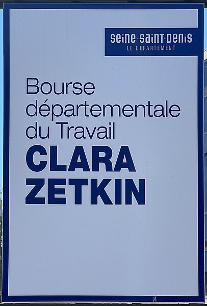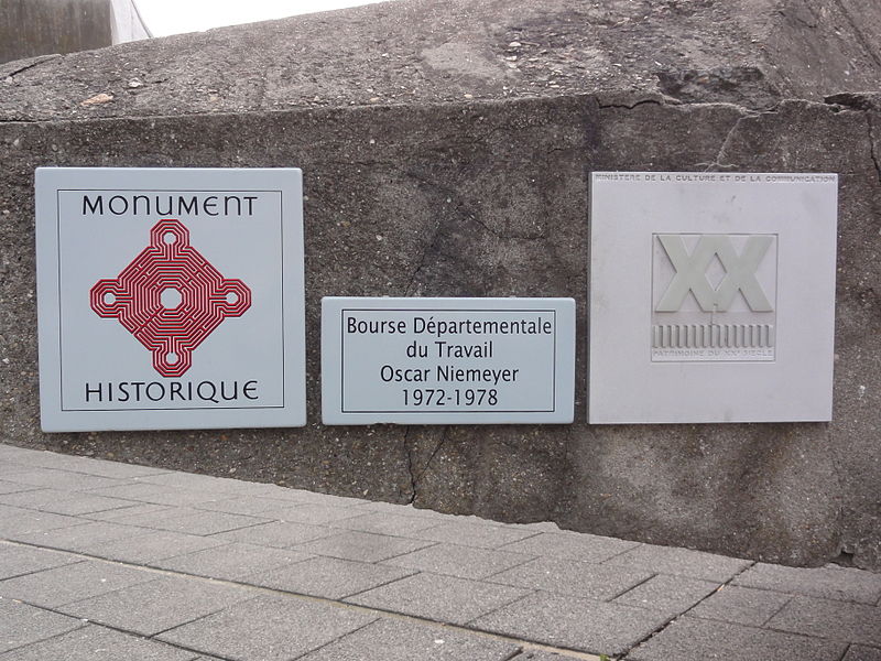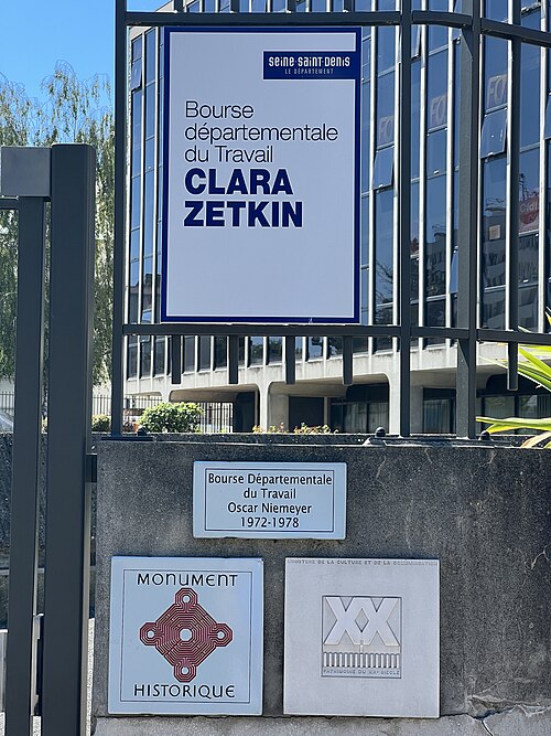 La Bourse départementale du travail de la Seine-Saint-Denis, rebaptisée Bourse départementale du travail Clara Zetkin en mars 2022, a été conçue par Oscar Niemeyer et construite à Bobigny entre 1976 et 1978. L'idée du bâtiment remonte à 1967 et la décision de construction a été votée par le conseil général en mai 1972, année où Niemeyer est choisi pour réaliser le projet. En 1975, Jean Maur Lyonnet est désigné comme architecte d'opération de l'agence Niemeyer. Le programme associe un immeuble de bureaux et un auditorium de huit cents places. Le bâtiment de bureaux, vitré et élevé sur pilotis, donne sur la place de la Libération. L'auditorium, surnommé le Goéland ou l'Albatros, présente une coquille renversée rendue possible par des voiles de béton et par sept poutres formant des rainures. Les deux édifices sont reliés par leurs sous-sols. L'édifice est inscrit aux monuments historiques depuis 2007, à la demande de son créateur. La Bourse se situe à proximité immédiate de la station Libération du tramway T1.