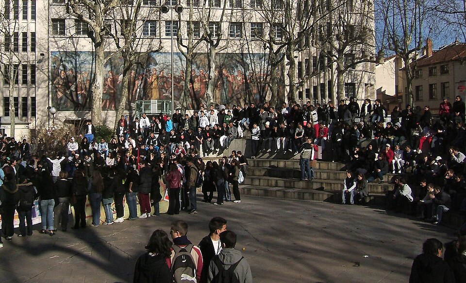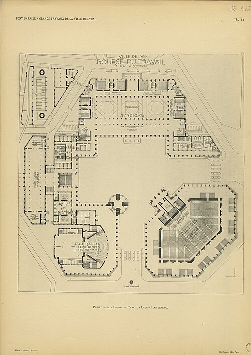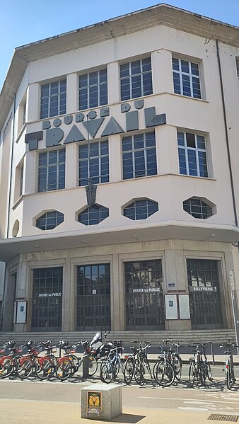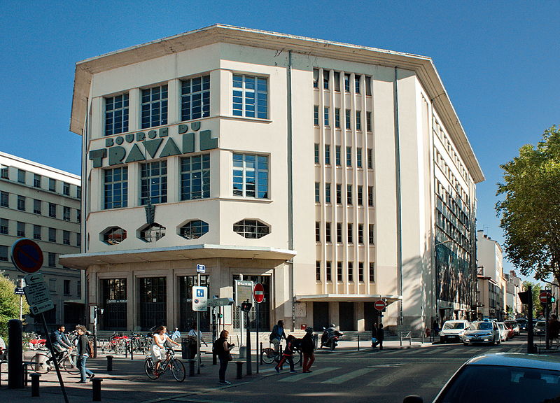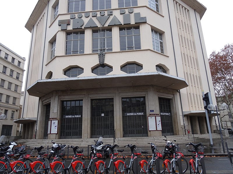 La Bourse du travail, située dans le 3e arrondissement de Lyon, a été construite de 1929 à 1936 par Charles Meysson, architecte en chef de la ville. Sur la façade de la rue de Créqui se trouve une grande mosaïque mise en place en 1934 par trente-cinq mosaïstes et réalisée par le peintre Fernand Fargeot ; elle représente « la ville embellie par le travail » et comporte les figures de l’architecte Meysson et du maire Édouard Herriot. La décoration intérieure, réalisée en 1936 par une douzaine d’artistes lyonnais, comprend des panneaux en simili-plâtre et de grands tableaux, dont certains relèvent du « réalisme socialiste ». La grande salle de spectacle a été modifiée en 1971, ce qui a entraîné la suppression du plafond lumineux d’origine. Fondée en 1891, la Bourse du travail fut d’abord le foyer de l’activisme révolutionnaire lyonnais et accueillit progressivement des pièces de théâtre destinées à former une culture ouvrière et anti-partisane. La salle, d’une capacité de 1 920 places, a perdu sa fonction politique et sociale mais accueille aujourd’hui de nombreux concerts, one-man shows, spectacles de danse et séminaires. La grande salle, à l’origine destinée aux réunions des travailleurs et de leurs syndicats, porte le nom de salle « Albert Thomas », en hommage au fondateur de la Revue Syndicaliste et de l’Information Ouvrière et Sociale et premier directeur du Bureau international du Travail. C’est dans cette salle que se sont déroulées les grandes luttes sociales de l’agglomération, de 1936 à 1968, comprenant notamment les mobilisations des métallos en 1938, des ouvriers du bâtiment, des traminots en 1958, la grande grève des fonctionnaires en 1953, ainsi que des actions des postiers. En novembre 1966, le maire Louis Pradel fit adopter par le conseil municipal le changement d’affectation de la salle, malgré sa vocation initiale, et les syndicats conservèrent toutefois un droit de préemption pour leurs meetings. La salle Albert Thomas a vu se multiplier les réunions publiques en 1968, parfois au-delà de sa capacité. La Bourse du travail ne se limite pas à cette salle : sur quatre étages, l’édifice met à disposition des salariés et des syndicats cinquante-cinq salles de permanence syndicale, cinq salles de réunion de 40 à 112 places, deux salles de congrès de 300 et 350 places, ainsi qu’une salle d’archives, un logement de gardien, une salle de consultation juridique et un secrétariat pourvu d’une salle d’attente et d’une bibliothèque. Des milliers de salariés y sont venus pour s’informer, être conseillés ou défendus en matière de droit du travail. L’institution est gérée par un conseil d’administration où sont représentés les syndicats hébergés sur place, notamment la CGT, la CFDT et la FSU ; la ville demeure propriétaire du bâtiment et le met à disposition des organisations syndicales qui le gèrent. Les façades décorées, les toitures et l’atrium décoré de la Bourse font l’objet d’une inscription au titre des monuments historiques depuis le 2 novembre 1989. Le site est desservi par la station de métro Place Guichard - Bourse du Travail.