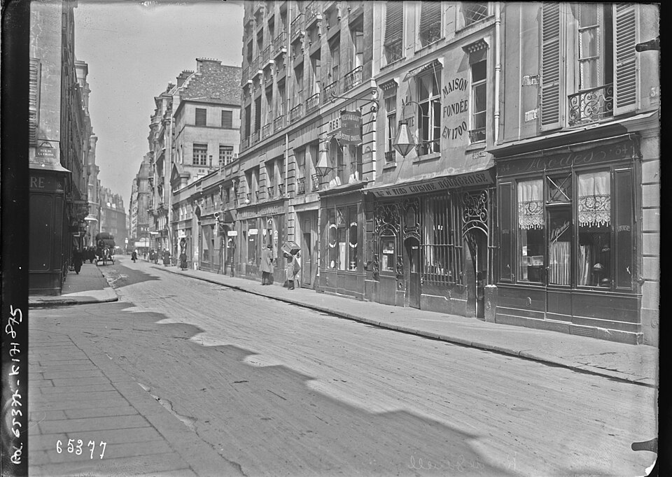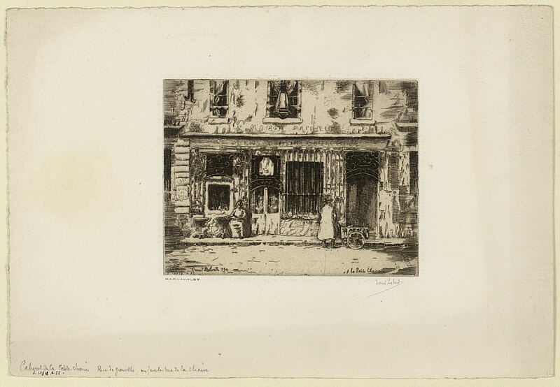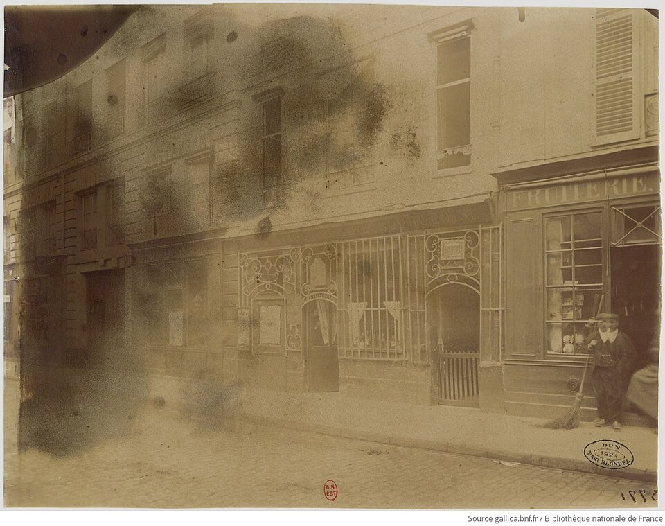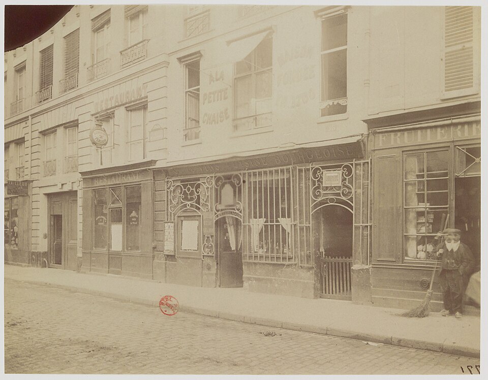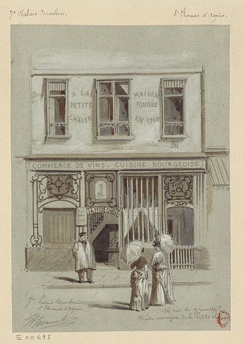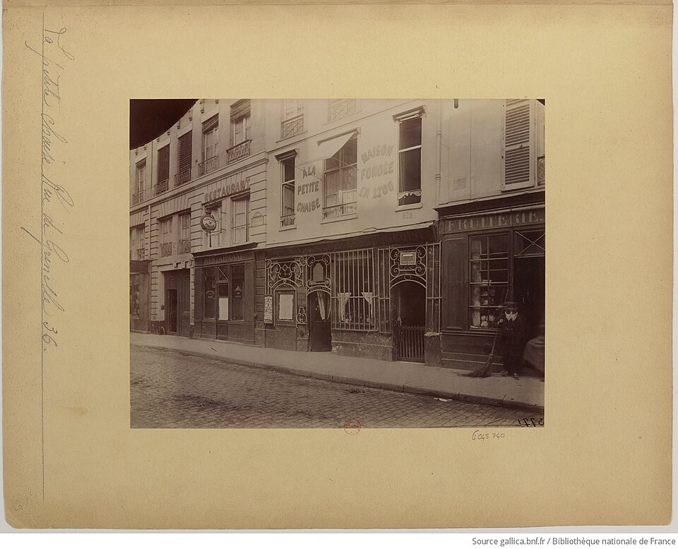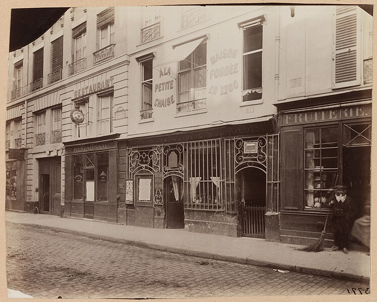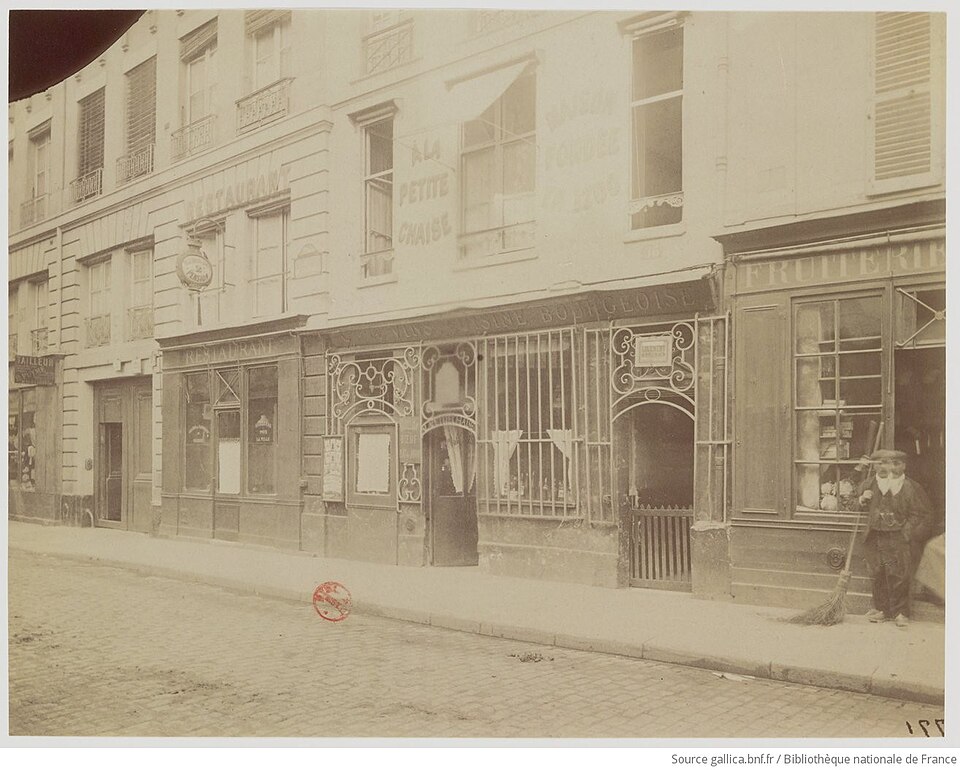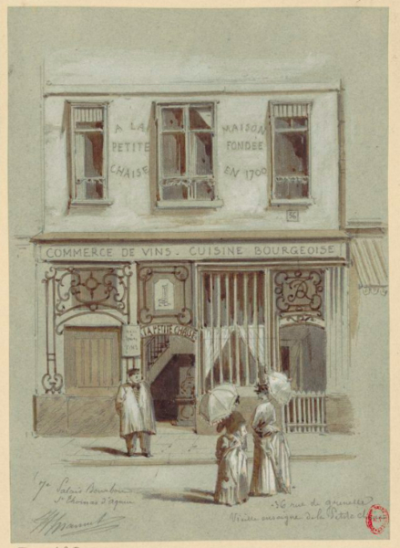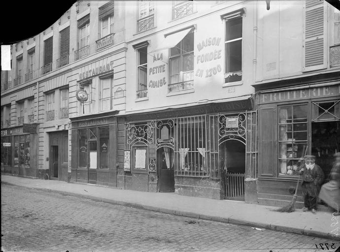 La grille de la boutique et l'enseigne A la petite Chaise se trouvant sur la façade de l'immeuble : inscription par arrêté du 25 avril 1959
