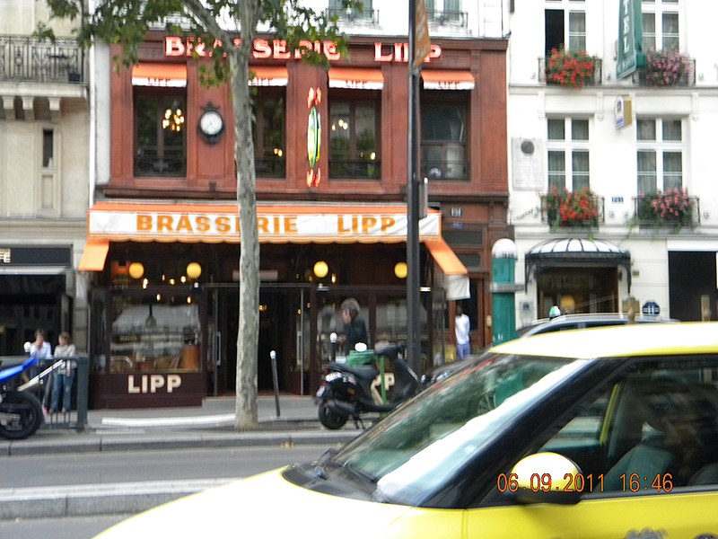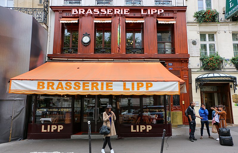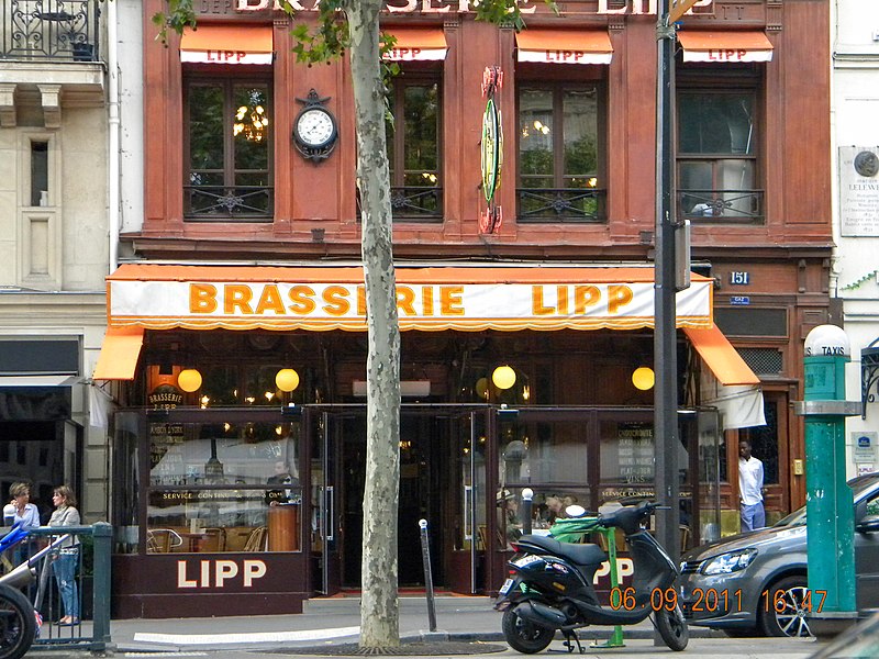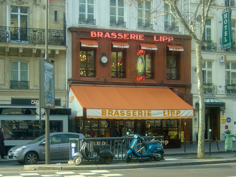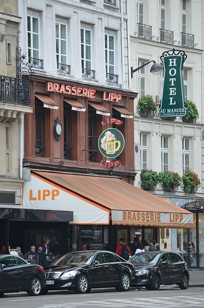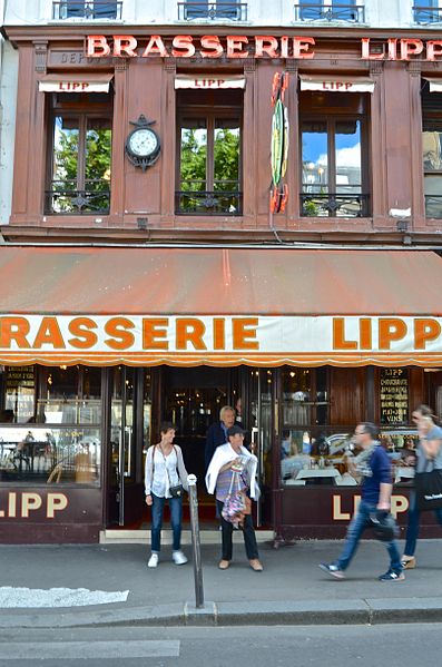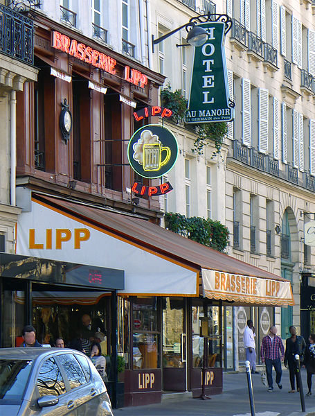 La brasserie Lipp est située au 151, boulevard Saint‑Germain dans le 6e arrondissement de Paris. Elle ouvre le 27 octobre 1880 sous le nom de Brasserie des Bords du Rhin, fondée par l'Alsacien Léonard Lipp et son épouse Pétronille. Léonard Lipp proposait des plats traditionnels alsaciens, notamment cervelas et choucroute, accompagnés de bière, et connut rapidement le succès grâce à la convivialité et à des prix modestes. La devanture date de cette époque ; le décor intérieur a été conçu en partie au début du XXe siècle et comprend des panneaux en céramique réalisés par Léon Fargue représentant des plantes exotiques dessinées avec précision botanique. L'établissement est racheté par Marcelin Cazes en juillet 1920 et inauguré sous son nom actuel en 1926. Une seconde salle, construite en 1925 par l'architecte Léon Madeline, est décorée de mosaïques reproduisant les panneaux de la salle originelle, et les plafonds peints par Charley Garry illustrent des scènes africaines. La "terrasse fermée" est créée en 1947. Lipp tient une place importante dans la vie littéraire et politique de la capitale ; elle a été fréquentée par de nombreux écrivains, artistes et hommes politiques. Parmi ses habitués figurent Verlaine, Apollinaire, Jacques Laurent, Jean Dutourd, Michèle Morgan, Jean‑Paul Belmondo, Elizabeth Taylor, Claude Nougaro, Kate Moss, Georges Pompidou, Valéry Giscard d'Estaing, François Mitterrand, Bill Clinton, Farah Pahlavi et Roberto Benzi. Devant la brasserie se déroula l'enlèvement de Mehdi Ben Barka en octobre 1965, événement politique majeur connu sous le nom d'« affaire Ben Barka ». Après des changements de propriétaires au début du XXe siècle (Jules Cazé, M. Hébrard), Marcelin Cazes fit décorer l'établissement avec des céramiques de Léon Fargue, des plafonds de Charley Garry et des banquettes en moleskine marron ; il créa le prix Cazes en 1935 et transmit la maison à son fils Roger en 1955. Entre la fin des années 1950 et le début des années 1960, Gaby Aghion y organisa les défilés de prêt‑à‑porter pour la maison Chloé. À partir de 1990, la famille Bertrand prit progressivement la direction de la brasserie ; Claude Guittard en fut le directeur entre 2000 et 2020. Les décors sont d'origine et les menus du jour n'ont pas été changés depuis les années 1930, mais la clientèle est désormais majoritairement touristique. Le prix Cazes, créé pour soutenir des auteurs n'ayant jamais été primés (principe aujourd'hui abandonné), est doté d'un chèque de 4 000 euros et de vingt repas gratuits à la brasserie ; il a été attribué chaque année depuis 1935 à de nombreux auteurs, parmi lesquels Pierre Albert‑Birot, Jean‑Louis Curtis, François Cavanna, Shan Sa, Alexandre Postel, Nathan Devers et Francis Grembert. La brasserie apparaît au cinéma, notamment dans Paris au mois d'août (1966) et Tanguy (2001), et sert de cadre à plusieurs nouvelles de Pierre Bourgeade telles que « La Perleuse » et « Chimène chez Lipp ». Son histoire est retracée dans plusieurs ouvrages, notamment Marcelin Cazes, 50 ans de Lipp (1966), Jean Diwo, Chez Lipp (1981), Claude Guittard et Isabelle Courty‑Siré, Lipp. La Brasserie (2006), et Claude Guittard, Lipp est une fête (2024).