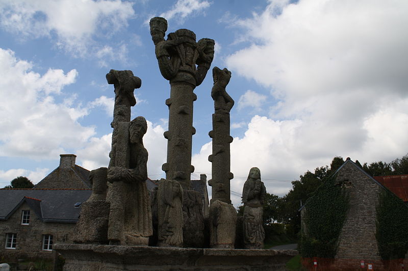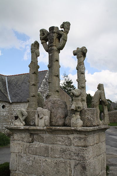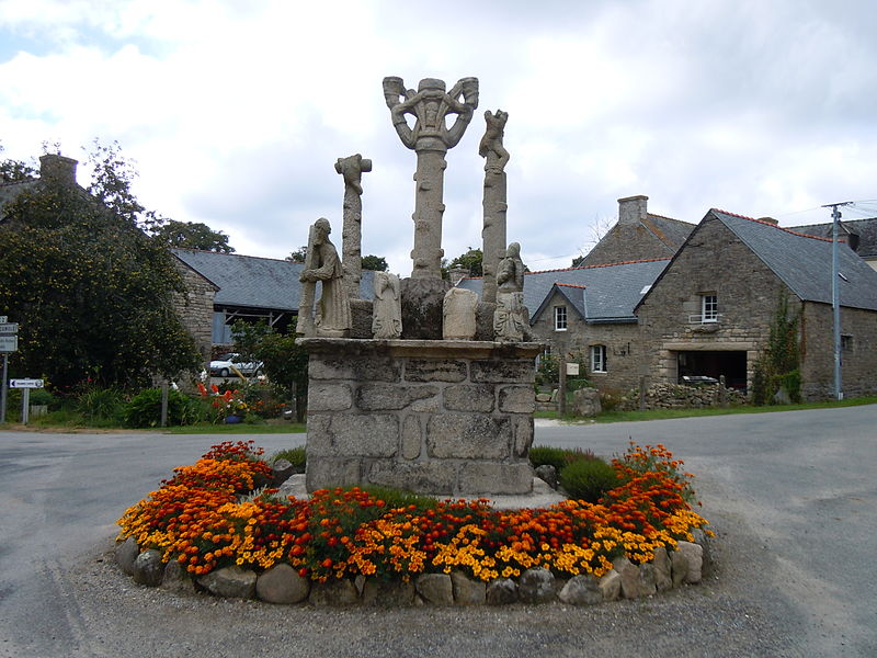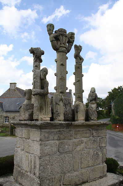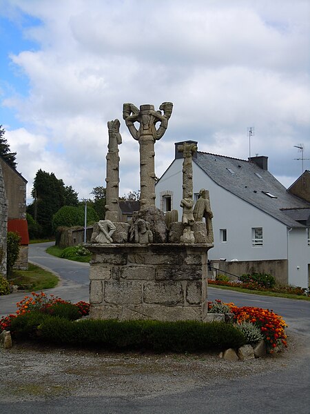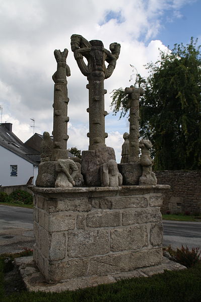 Sur un socle rectangulaire subsistent les parties inférieures et les bases des croix du Christ et des larrons. Ce calvaire, dit de Bonigeard, se trouve dans le village éponyme à un carrefour de la commune de Meslan, dans le Morbihan, en Bretagne, à proximité immédiate de la chapelle Saint‑Catherine (XVIIe siècle). Daté du XVIe siècle, il a souffert des troubles de la Révolution française puis de détériorations causées par des poids lourds ; des fragments ont été remontés in situ vers 1970 et une restauration a eu lieu en 1971. Il est inscrit au titre des monuments historiques depuis le 6 juin 1933. À sa réalisation, le calvaire comprenait treize ou quatorze personnages organisant des scènes telles que le Portement de la croix, la Mise au tombeau et la Résurrection du Christ. Aujourd’hui ne subsistent que des éléments très mutilés : Vierge, larron, haut du Christ, un cul‑de‑lampe portant la face du Christ et peut‑être des attributs de la Passion. Une statue remarquable du Christ, représentée les mains liées à un poteau de torture, est conservée intacte. Cinq bustes et deux têtes provenant du calvaire ont été remployés comme éléments décoratifs dans l’église paroissiale de Meslan, sans toutefois reconstituer les statues mutilées. La superstructure repose sur trois fûts en granite dont les proéminences évoquent des bubons de peste ; les fûts latéraux portent les croix en tau des larrons et le fût central est pourvu de culots soutenus par des anges issants. Sur la plate‑forme sont scellés plusieurs personnages fortement mutilés, souvent décapités : on déplore l’absence d’au moins six têtes.