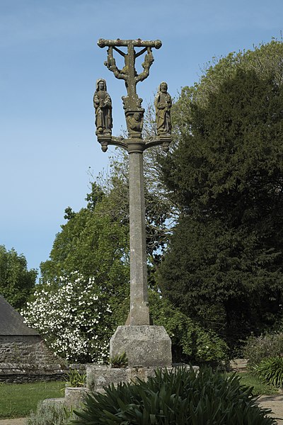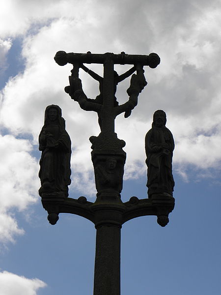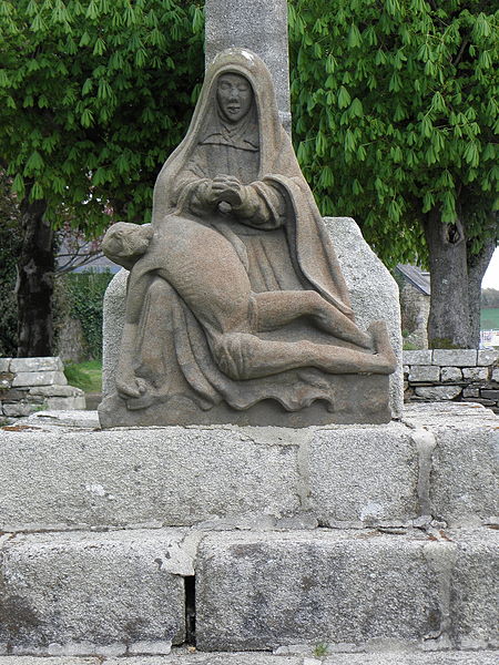 Le calvaire se compose d'une croix dont le support est élargi par deux consoles accueillant la Vierge et Saint-Jean ; à la base de la croix se trouve une Pietà.