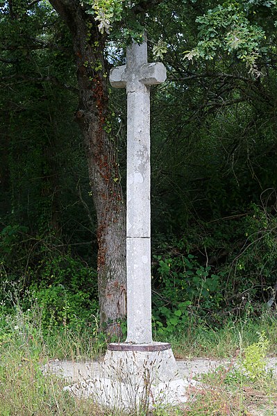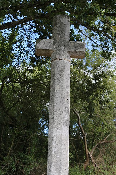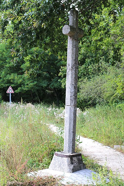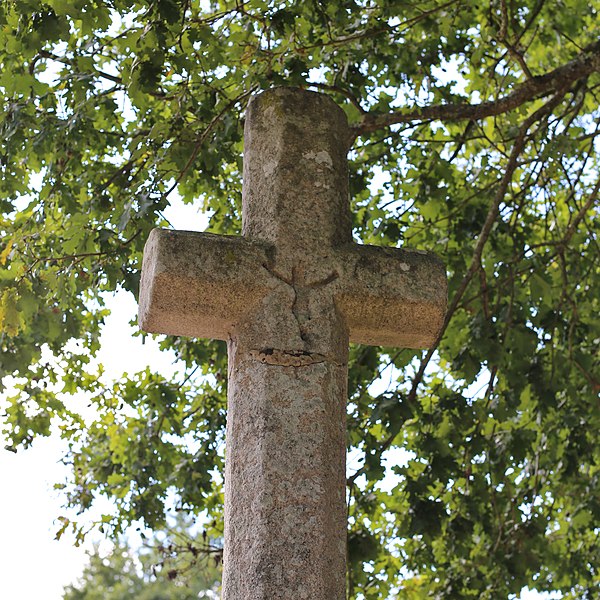 Le fût est octogonal et repose sur un socle composé de trois marches. Un piédestal quadrangulaire à angles abattus et à moulures le surmonte. La croix, elle aussi octogonale, porte une tête ailée représentant une figure très fruste. Mentionnée sur le cadastre de 1812, elle pourrait dater du XVIIIe siècle. L'ensemble présente un intérêt d'ancienneté.
