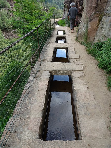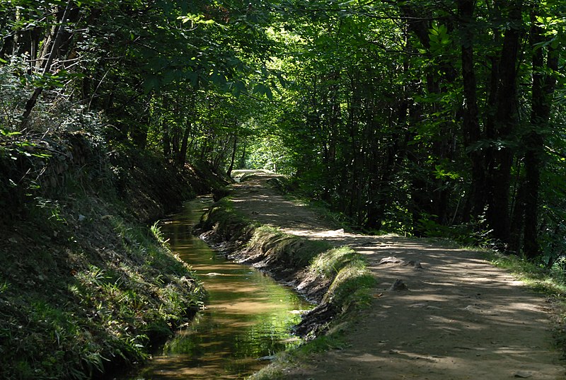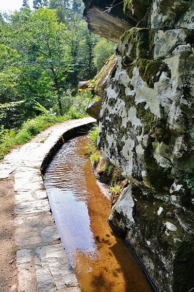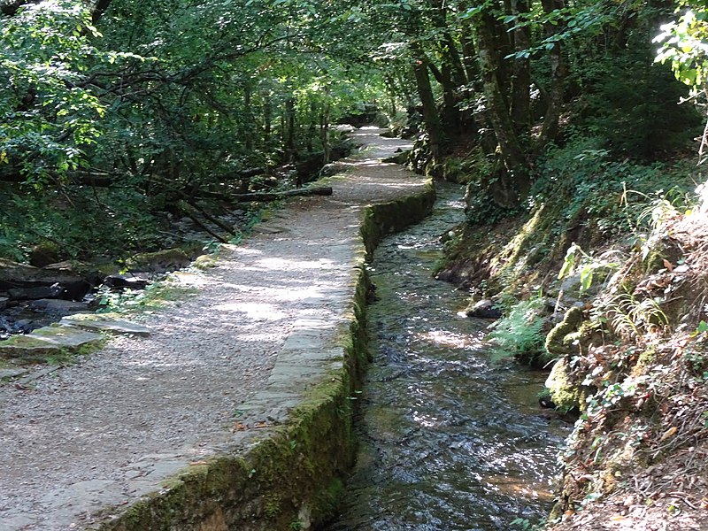 Le canal des moines d'Obazine, long de 1 700 mètres, se situe sur la commune d'Aubazines en Corrèze. Il a été créé au XIIe siècle par les moines cisterciens de l'abbaye d'Obazine, sous l'abbatiat d'Étienne d'Obazine, pour alimenter le monastère en eau destinée à l'hygiène, aux moulins, aux ateliers et à l'irrigation des potagers et prairies. Il capte les eaux du Coiroux en amont d'Aubazines ; le lit rocheux a été taillé sur plus d'un kilomètre et demi avant le village. À flanc de montagne, le canal suit les courbes du relief selon une pente très faible, parfois évaluée à 0,5 %. Le tracé est tantôt directement taillé dans le rocher, tantôt construit à l'aide de blocs de granit appareillés, et comporte des parties en encorbellement pour contourner des obstacles. Des murs de soutènement épais et étanches assurent la tenue de l'ouvrage là où la configuration du terrain l'exige. À plusieurs endroits, les moines ont pratiqué des entailles dans le granit — brèche Saint-Étienne, baignoires, bretèches — et l'une de ces brèches a donné naissance à la légende du miracle de saint Étienne, qui aurait bénit et tranché le rocher. Un sentier longe la rive gauche et permet d'accéder au canal sur l'ensemble de son parcours. Sur le trajet se trouve un bassin rectangulaire appelé « bassin des moines », recouvert de cinq blocs de granit. Aux abords du bourg, la pente s'accentue : l'eau prend de la vitesse pour tomber sous l'ancien bâtiment du moulin abbatial, bâti sur une voûte surbaissée, puis, environ trente mètres plus loin, se déverse dans le vaste bassin rectangulaire de l'ancien vivier, aménagé sous les fenêtres du réfectoire. Malgré la vente du monastère à la Révolution, le canal a continué d'alimenter de nombreuses parcelles de la commune. Il est protégé au titre des monuments historiques depuis 1965 et fait l'objet d'un classement inscrit en 1965 puis en 1966. La tempête de 1999, la canicule de 2003, le passage des visiteurs et un manque d'entretien ont fragilisé l'ouvrage, ce qui a conduit à une opération de restauration menée de 2006 à 2010. Le canal est remarquable par la précision de son ingénierie : la constance de la faible pente et l'ampleur des travaux de creusement et de soutènement témoignent du savoir-faire des moines dans la vallée du Coiroux.