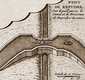 Le pont‑canal du Répudre, situé à Paraza dans l'Aude, a été construit par Pierre‑Paul Riquet pour permettre au canal du Midi d’enjamber le ruisseau du Répudre. Il constitue la première réalisation de ce type en France et le plus ancien pont‑canal navigable au monde, les deux autres présents sur le canal du Midi ayant été ajoutés ultérieurement par Vauban. L'ouvrage, conçu et dirigé par l'architecte Emmanuel de l'Estang, s'impose comme une innovation face à la pratique courante de Riquet qui, pour les autres cours d'eau, privilégiait des chaussées‑barrages à niveau. Cette solution n'était pas envisageable sur le Répudre : il aurait fallu édifier un immense barrage de retenue, long de plusieurs centaines de mètres, sur un ruisseau généralement insignifiant mais sujet à des crues dévastatrices. Pour réduire la longueur et la hauteur des maçonneries, Riquet fit décrire au canal un méandre qui remonte assez haut dans le vallon, choix qui a probablement contribué à la survie de l'ouvrage lors des inondations. Les travaux commencèrent en 1676 et le pont fut quasiment achevé en 1680 ; il ne restait alors que les parapets en pierre et la couverture du logement du garde, réalisés ultérieurement. En 1683, à la suite d’un litige financier avec Riquet, Delestang connut dix mois d'emprisonnement dans les « prisons du canal » avant d'être libéré. Des témoins de crues posés après les inondations spectaculaires de 1843 et 1875 attestent que l'édifice, plusieurs fois submergé, a résisté. Le pont a fait l'objet de réparations après avoir été endommagé par une crue en décembre 1999. Une plaque commémorative du XIXe siècle, apposée par les descendants de Riquet sur la face sud, rappelle le rôle de l'ingénieur. L'édifice est inscrit au titre des monuments historiques depuis 1942.