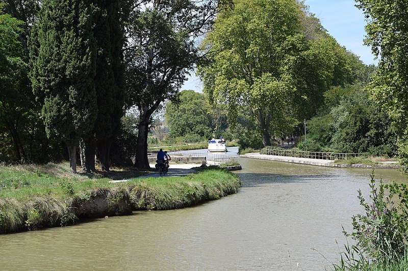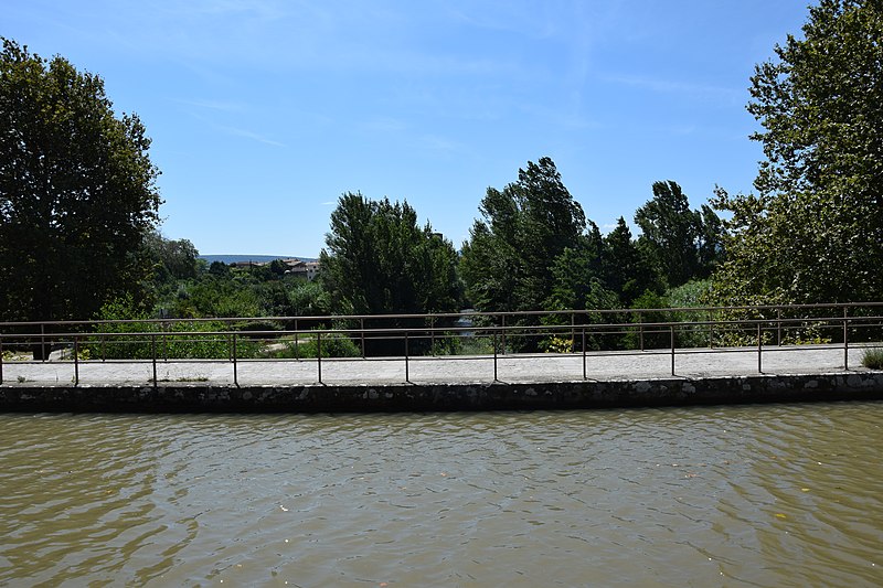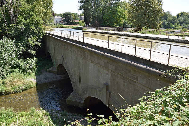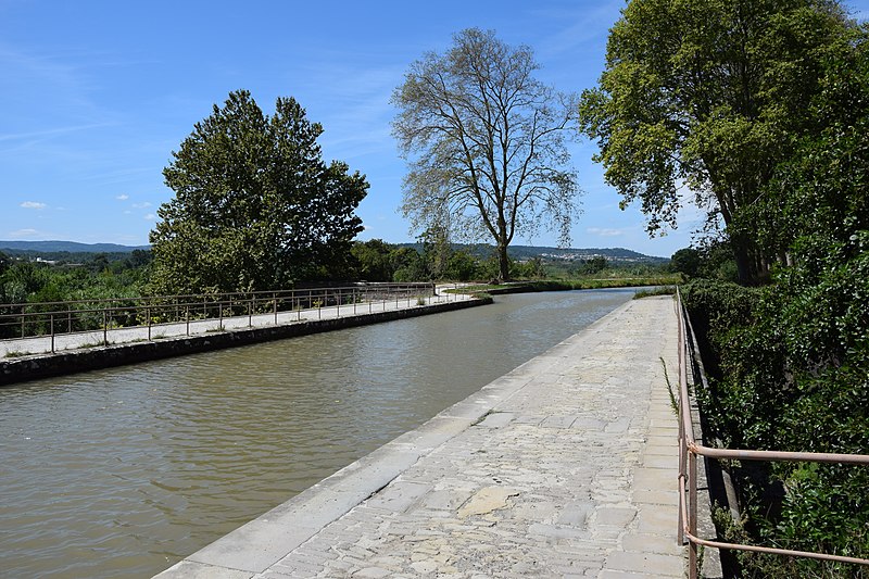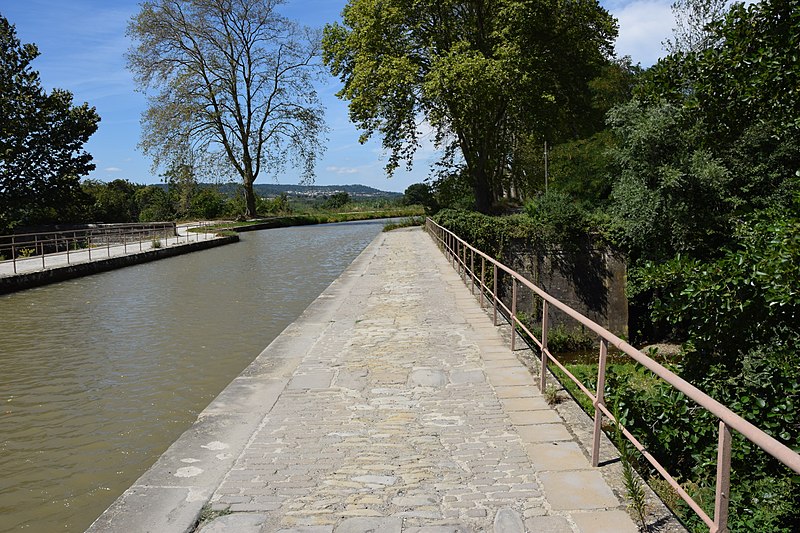 Le pont‑aqueduc de l'Orbiel, situé à Trèbes à l'intersection de l'Orbiel et du canal du Midi, remplace un franchissement à niveau du canal sur la rivière : un barrage fut détruit et l'ouvrage fut construit en 1686‑87 par Antoine Niquet d'après les plans de Vauban. Lors de son inspection des travaux du canal des Deux‑Mers en 1686, Vauban avait signalé que les épanchoirs aux traversées des rivières pouvaient perturber la navigation en crue et obstruer le canal par les matériaux charriés ; il préconisa la construction d'aqueducs et établit lui‑même des plans, le pont‑aqueduc de Trèbes étant cité à l'époque comme modèle et illustré dans des traités d'hydraulique. L'ouvrage est formé de trois arches ; à l'étiage l'Orbiel ne coule que sous l'arche occidentale, tandis qu'en crue la rivière envahit son lit majeur et que les trois arches peuvent ne plus suffire à assurer le débit. La largeur des voûtes entre têtes, 16,60 m, correspond au passage du canal et aux deux chemins de halage. Les arcs de tête, constitués de très longs claveaux, font saillie sur le nu du mur, mais cette saillie n'est pas uniforme : l'extrados est retaillé sur une longueur radiale de 28 cm, formant une retraite de 3 cm du côté de l'intrados. Ces faibles reliefs sur le nu du mur correspondent aux plans des pilastres placés au droit des piles, larges rectangles nus à ressaut, et aux fortes plates‑bandes qui soulignent le boudin du parapet. Les clés monumentales des arcs sont réalisées en trois pièces. Les culées sont protégées par de puissants murs en retour d'équerre à fruit prononcé, renforcés par des contreforts intérieurs. Les piles comportaient des éperons triangulaires à terminaison supérieure conique, aujourd'hui masqués par l'accumulation de galets. L'édifice est classé au titre des monuments historiques en 1950.