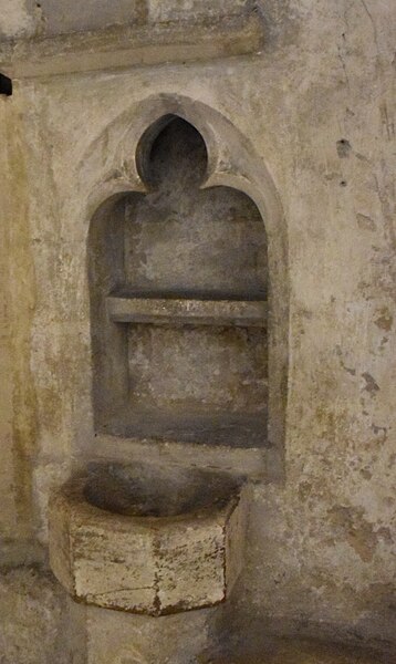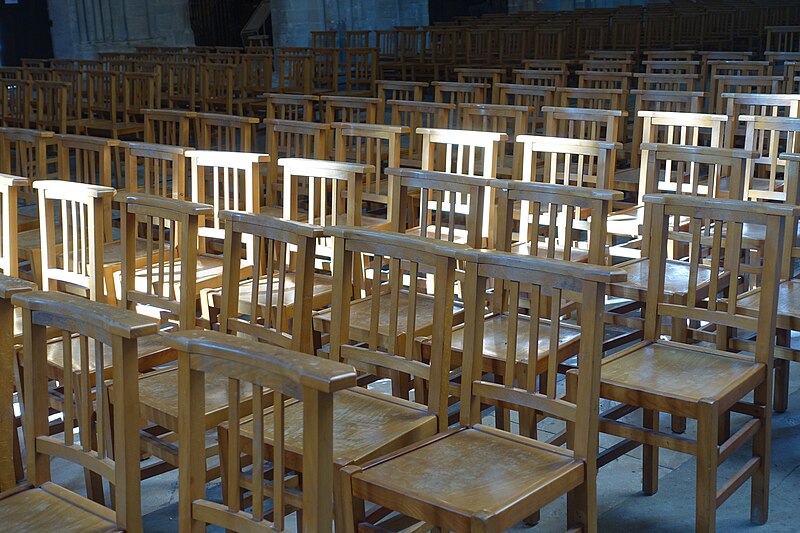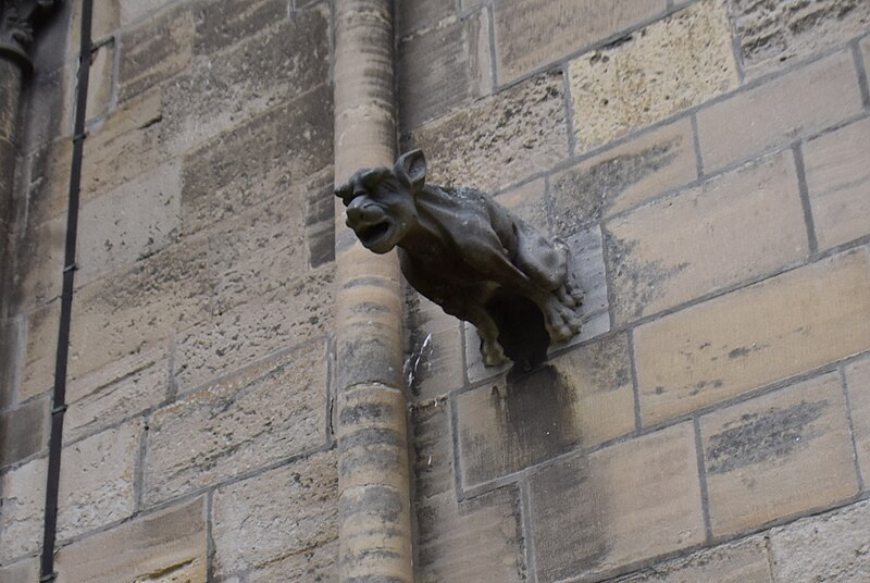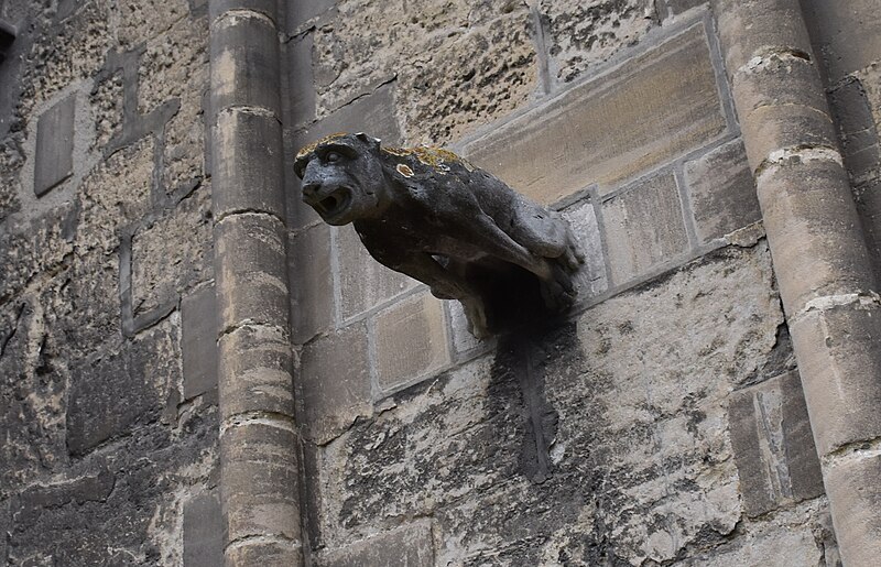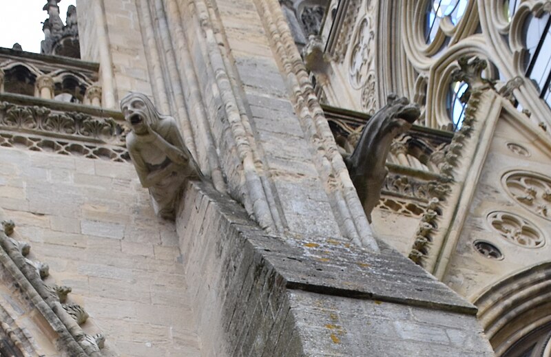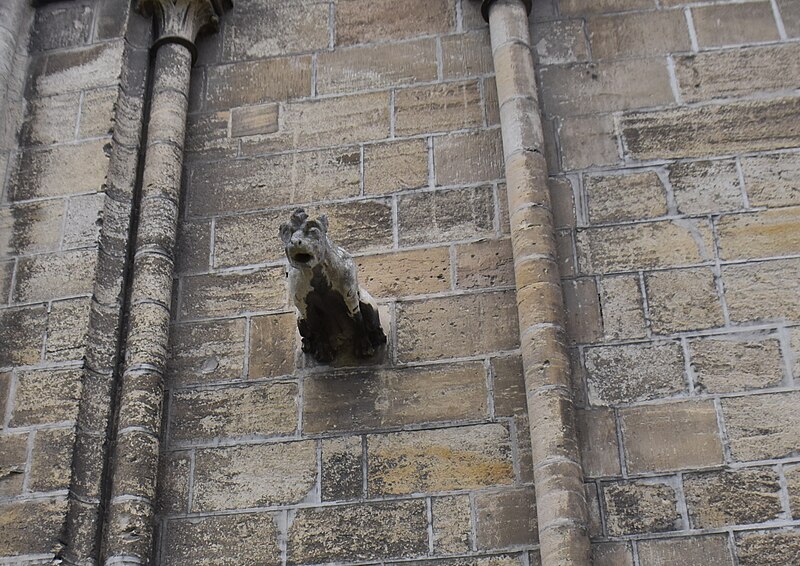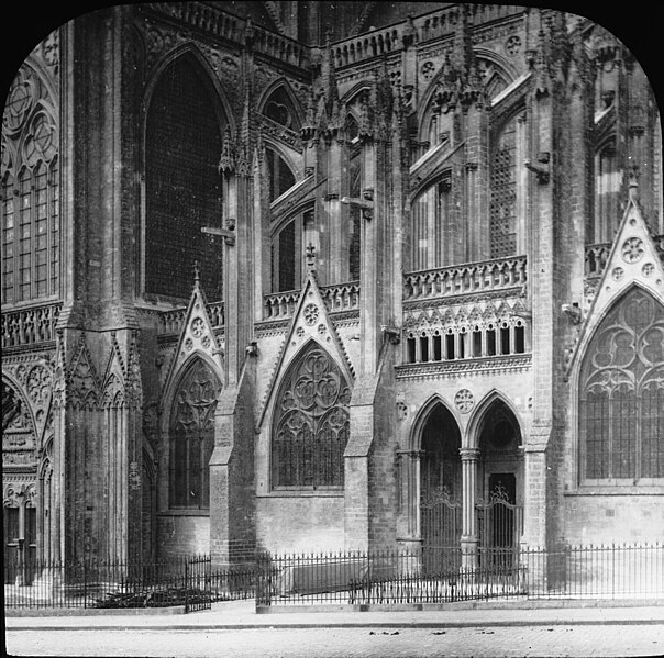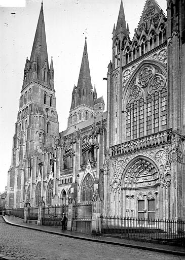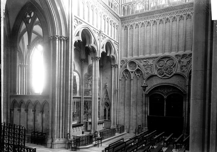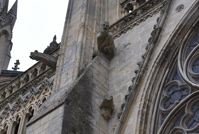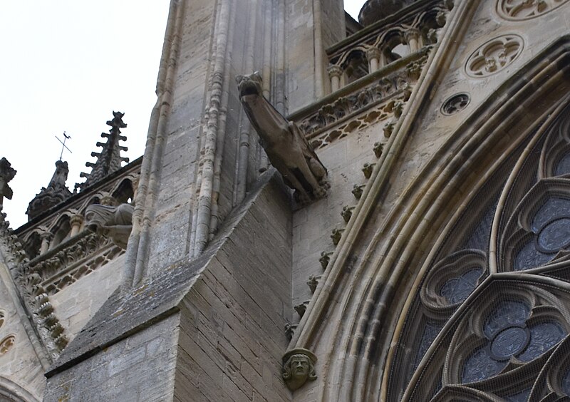 À l’est, le chevet, dérivé du modèle de l’abbatiale Saint‑Étienne de Caen, s’organise autour d’un chœur gothique et de chapelles rayonnantes ; les statues qui ornent les contreforts ont été remplacées par des copies au XIXe siècle. Sur le flanc nord se trouvent des constructions accolées : la sacristie de style néogothique, la salle du chapitre (XIIe–XVe siècle) avec ses peintures murales et son pavement médiéval en forme de labyrinthe, ainsi que la bibliothèque du chapitre, édifice du XVe siècle réaménagé aux XVIIe et XIXe siècles et riche d’un fonds de manuscrits et de plus de 5 600 imprimés.