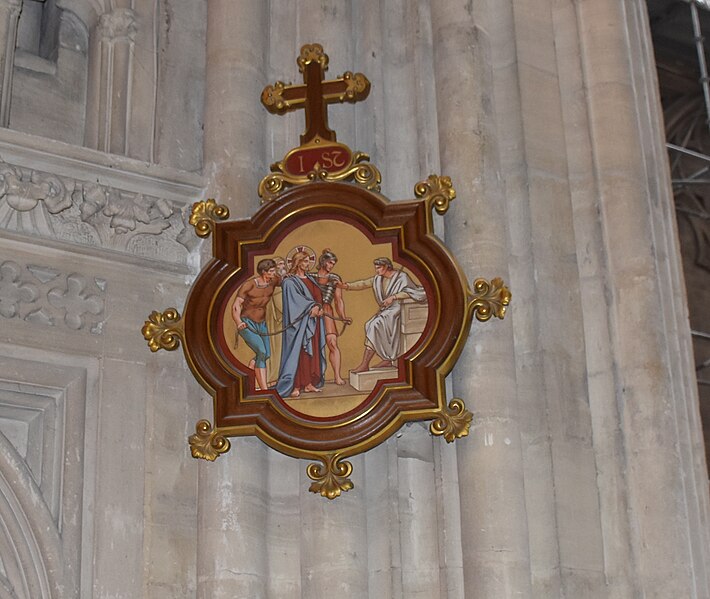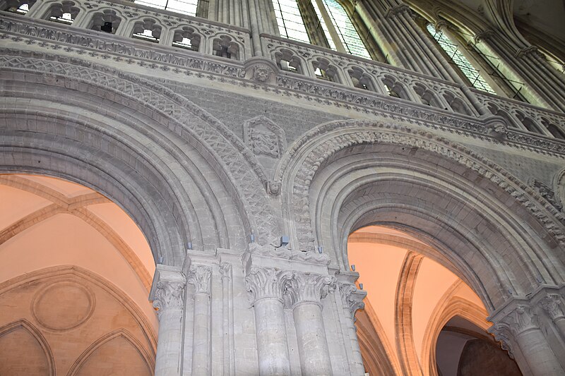 La cathédrale Notre‑Dame de Bayeux, située dans le Calvados en Normandie, est un édifice catholique aux styles roman et gothique normand qui sert de siège au diocèse de Bayeux et Lisieux et fait partie d’un groupe épiscopal remarquablement préservé. Selon la tradition, un quartier ecclésiastique y aurait été fondé au IVe siècle par l’évêque Exupère, puis occupé par plusieurs églises dont l’une a donné la cathédrale actuelle ; les fouilles ont mis au jour des vestiges gallo‑romains et des remparts près du chevet. L’édifice carolingien a été détruit par les Vikings puis incendié à plusieurs reprises au haut Moyen Âge, ce qui a conduit à une reconstruction majeure au XIe siècle conduite sous Hugues II de Bayeux et achevée par Odon de Conteville ; la cathédrale a été dédiée en présence des autorités ecclésiastiques et ducales lors d’une cérémonie au cours de laquelle la tapisserie de Bayeux a été exposée. Parmi les éléments romans encore visibles figurent la crypte à trois vaisseaux avec chapiteaux à feuilles d’acanthe et deux chapiteaux historiés issus de la croisée du transept, ainsi que les tours du massif occidental, désormais intégrées aux adjonctions gothiques. De l’incendie de 1105 et d’autres dommages ont découlé d’importants travaux dès le XIIe siècle qui ont transformé progressivement l’édifice jusque dans les siècles suivants. Le décor des grandes arcades et des écoinçons, ainsi que certains bas‑reliefs, témoignent d’influences venues d’Angleterre et du sud de l’Angleterre médiévale.