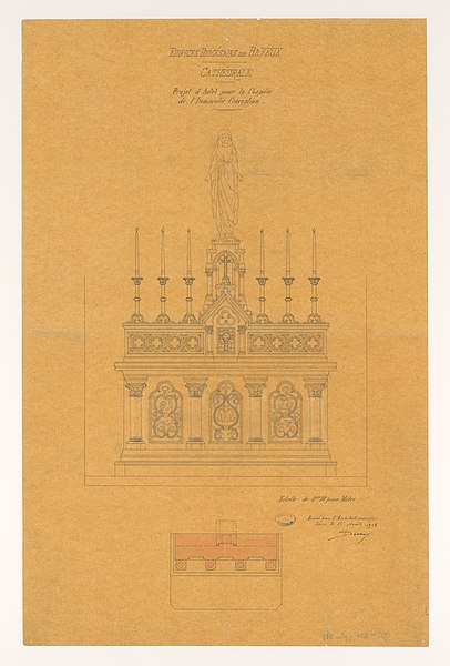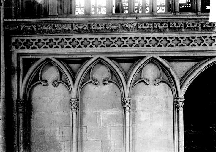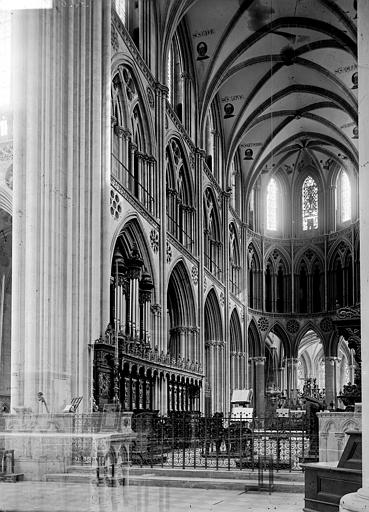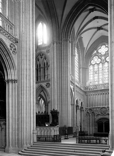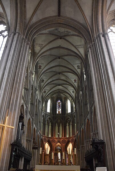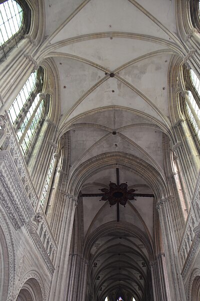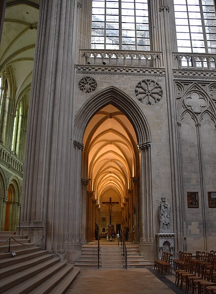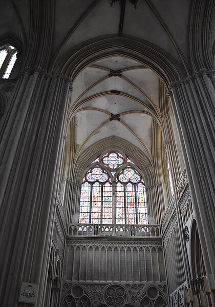 Le chantier gothique a débuté par les bas‑côtés de la nef, puis par le chœur réédifié au début du XIIIe siècle et caractérisé par des arcs brisés très aigus, une profusion de colonnettes et un vaste triforium remplaçant les anciennes tribunes ; la reprise des parties hautes de la nef a introduit en Normandie des solutions du style rayonnant. Le transept a été remanié et reçoit de nouvelles charpentes ; la façade occidentale et la tour centrale ont été couronnées et remaniées à l’époque gothique, la tour centrale ayant connu des travaux et restaurations successifs. La cathédrale conserve également des espaces remarquables tels que la salle du chapitre avec son pavage en labyrinthe et la salle du Trésor qui abrite un mobilier précieux — coffret d’ivoire, chasuble attribuée à saint Regnobert, armoire reliquaire et siège épiscopal — accessibles sous conditions.