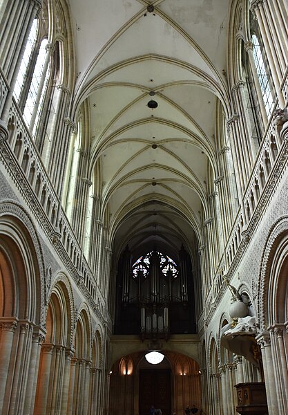 L’intérieur présente une nef à deux niveaux où les grandes arcades romanes du niveau inférieur dialoguent avec l’étage gothique supérieur ; le décor des écoinçons comporte des figures animales et humaines, dont une scène présente le serment d’Harold tirée de la tapisserie de Bayeux et une figurine dite des « amoureux de Bayeux ». La croisée du transept, voûtée et flanquée de chapelles dédiées à saint Nicolas et saint Thomas Becket, conserve des vitraux et des peintures murales et a vu ses piliers remplacés lors des travaux du milieu du XIXe siècle, qui ont permis la mise au jour d’éléments romans. Le chœur, organisé sur trois niveaux avec un riche triforium, abrite des stalles sculptées et un autel néo‑classique ainsi qu’un orgue de chœur ; la partie liturgique conserve des grilles et un mobilier d’époques variées.